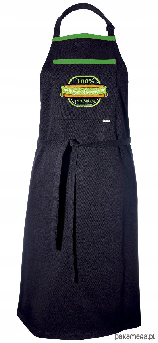 Głównym atutem jest funkcjonalna kieszeń z bogatym haftem komputerowym. Napis „100% Vege Kuchnia Premium” zamknięty w stylowym emblemacie prezentuje się bardzo prestiżowo. Soczysta zielona lamówka oraz dopasowane kolorystycznie nici haftu świetnie kontrastują z czarnym tłem, nadając całości nowoczesny charakter.
