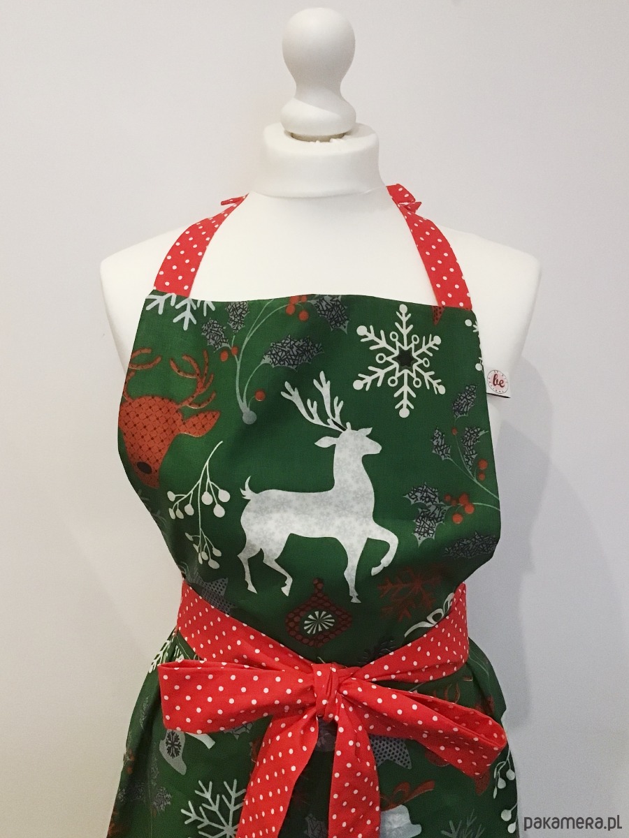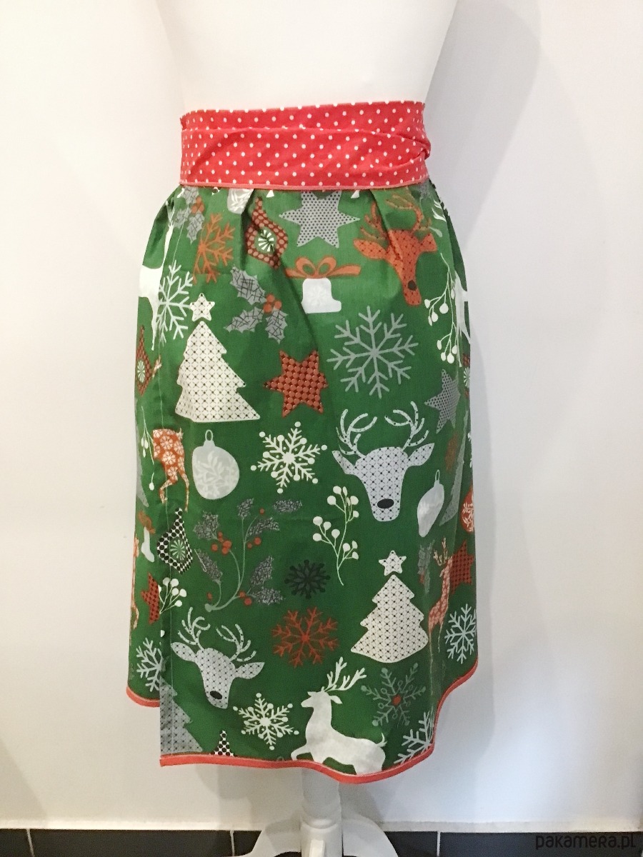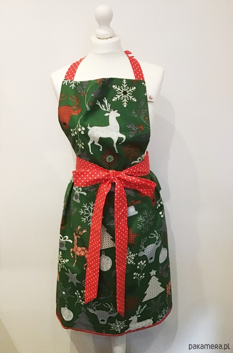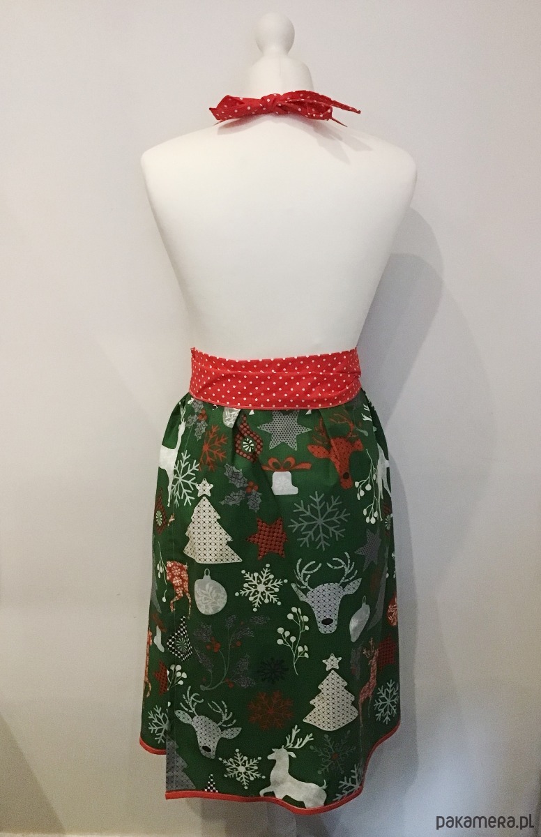 Uroczy retro fartuszek. Całość wykonana z zielonej bawełny w świąteczne wzory. W pasie długie wstążki z czerwonej bawełny w białe groszki, które służą do zawiązania ozdobnej kokardy. U góry regulowane tasiemki również z czerwonej bawełny w groszki. Fartuszek jest bardzo kobiecy, w stylu lat 50.