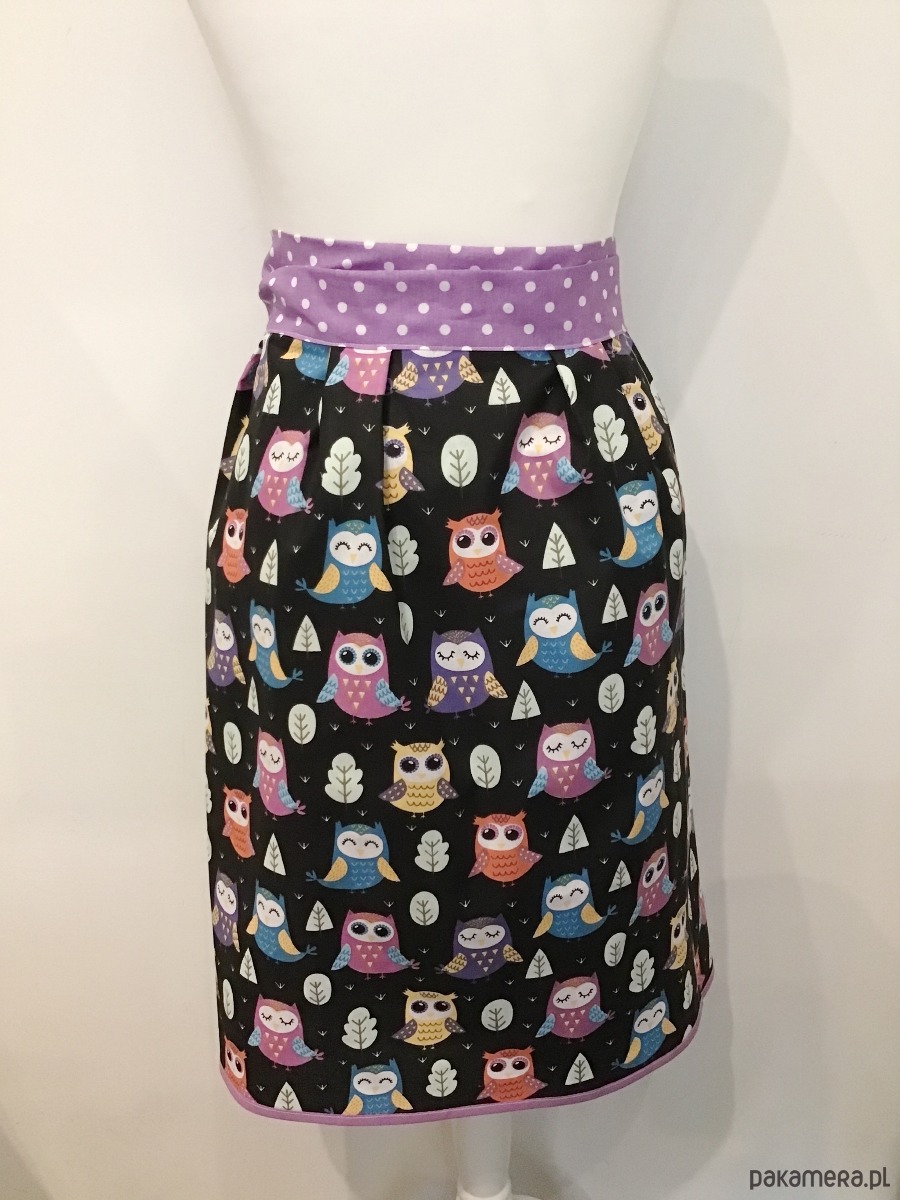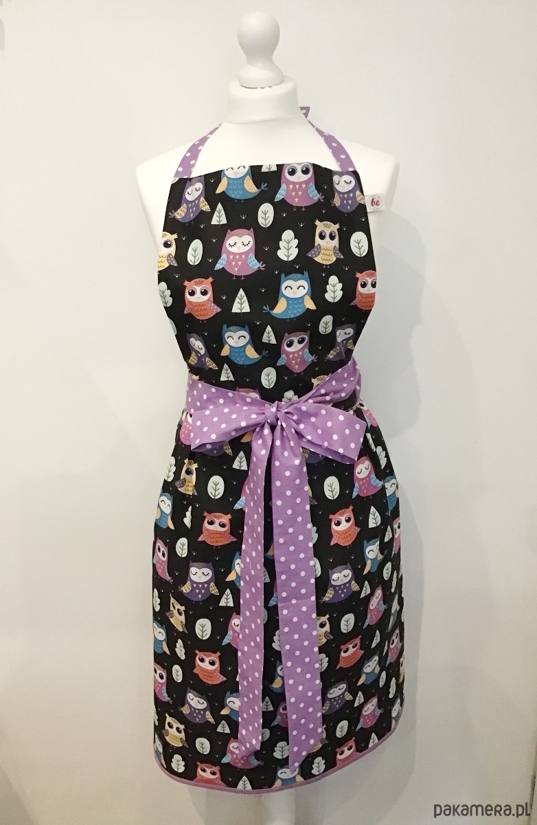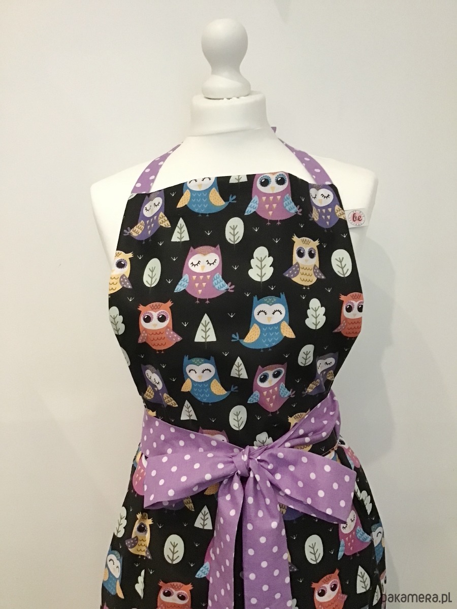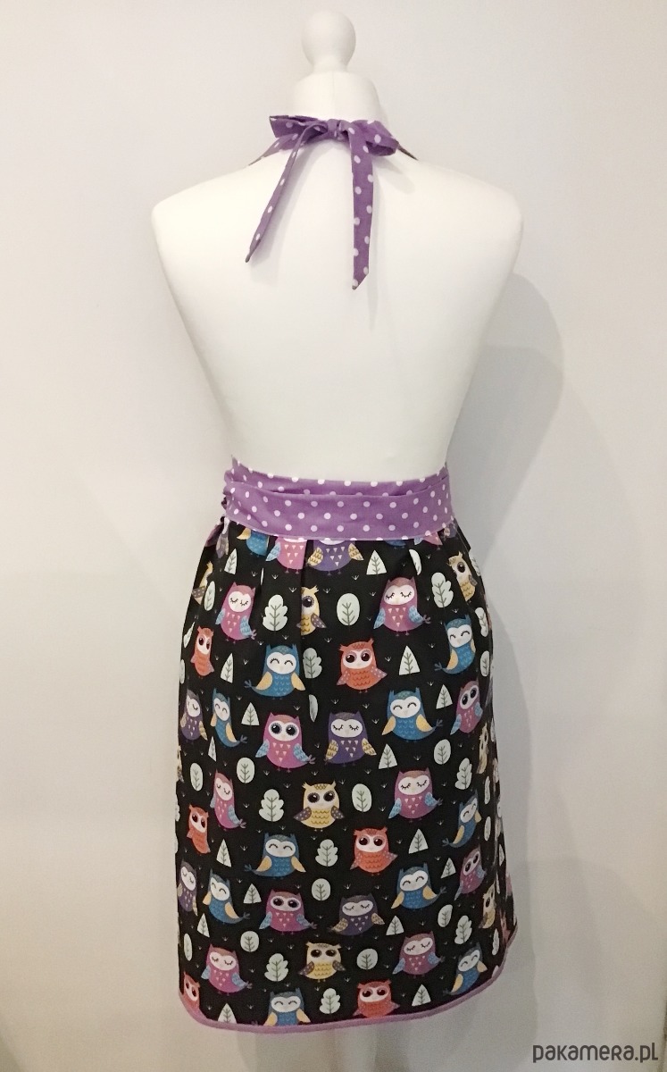 Uroczy retro fartuszek. Całość wykonana z czarnej bawełny w kolorowe sowy. W pasie długie wstążki z fioletowej bawełny w białe groszki, które służą do zawiązania ozdobnej kokardy. U góry regulowane tasiemki również z fioletowej bawełny w groszki. Fartuszek jest bardzo kobiecy, w stylu lat 50.