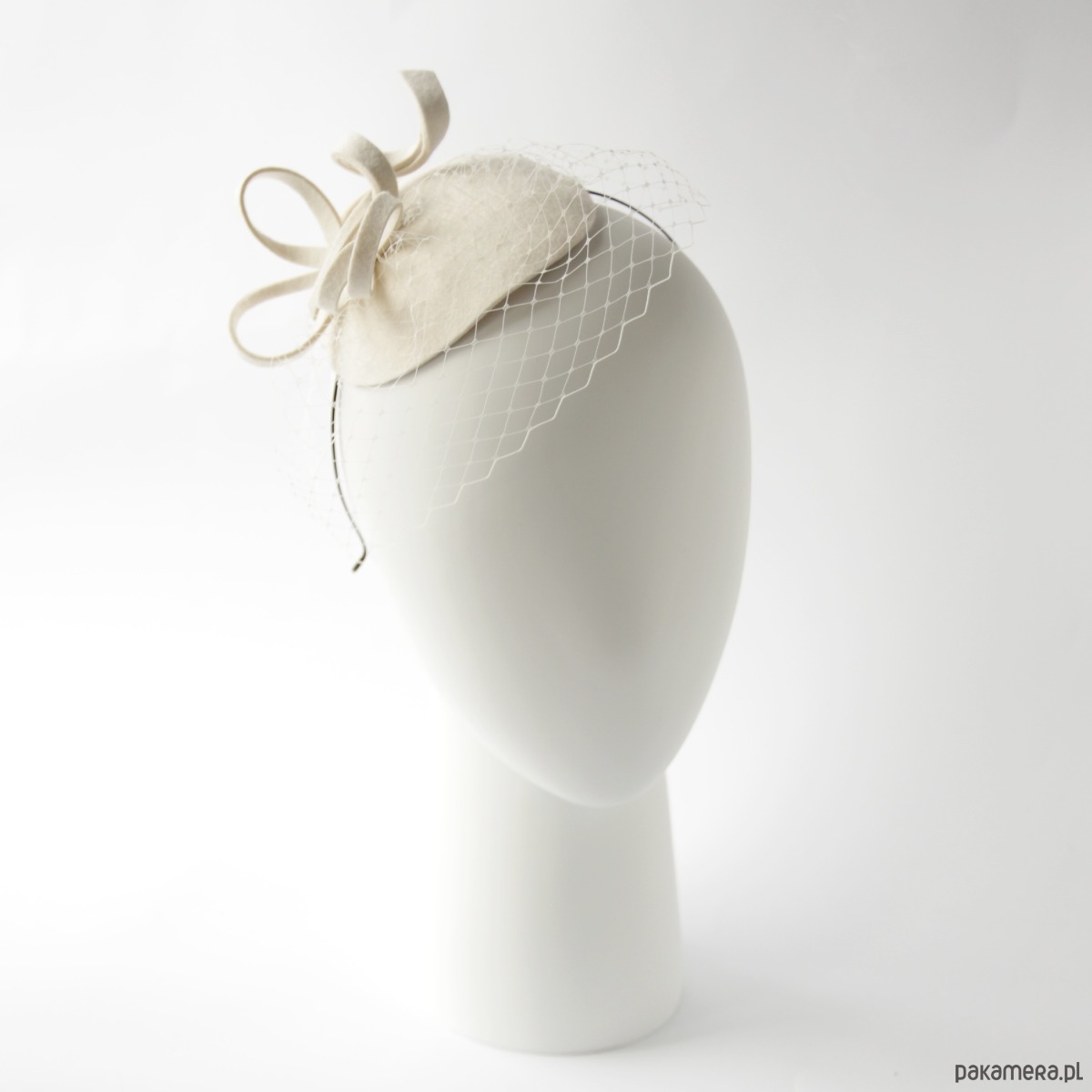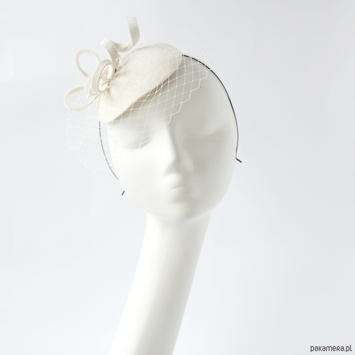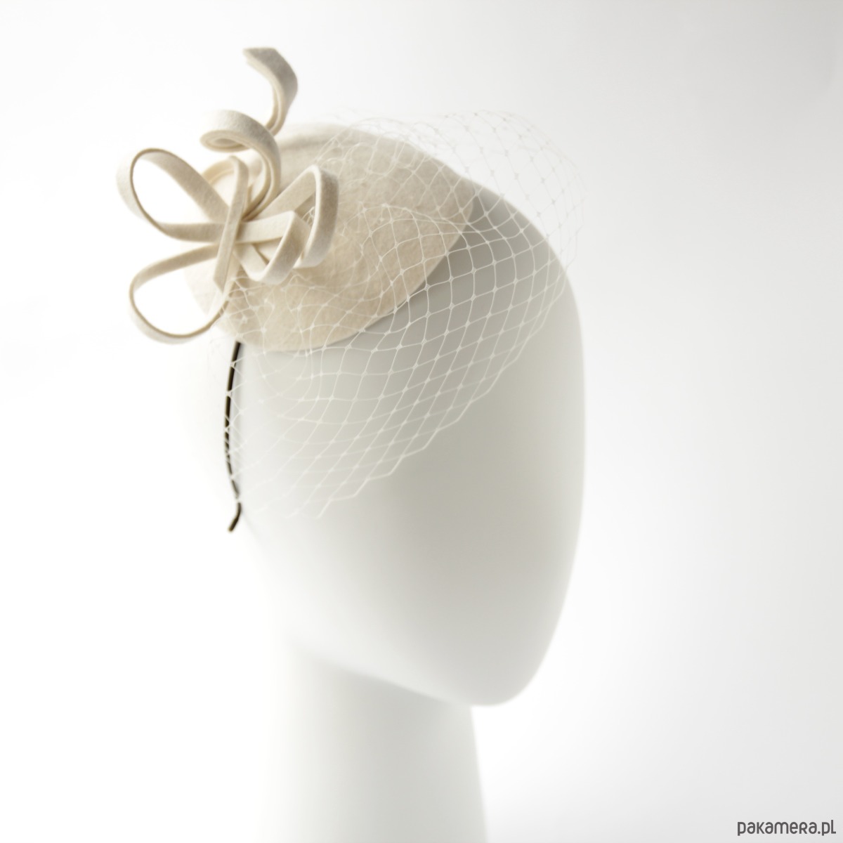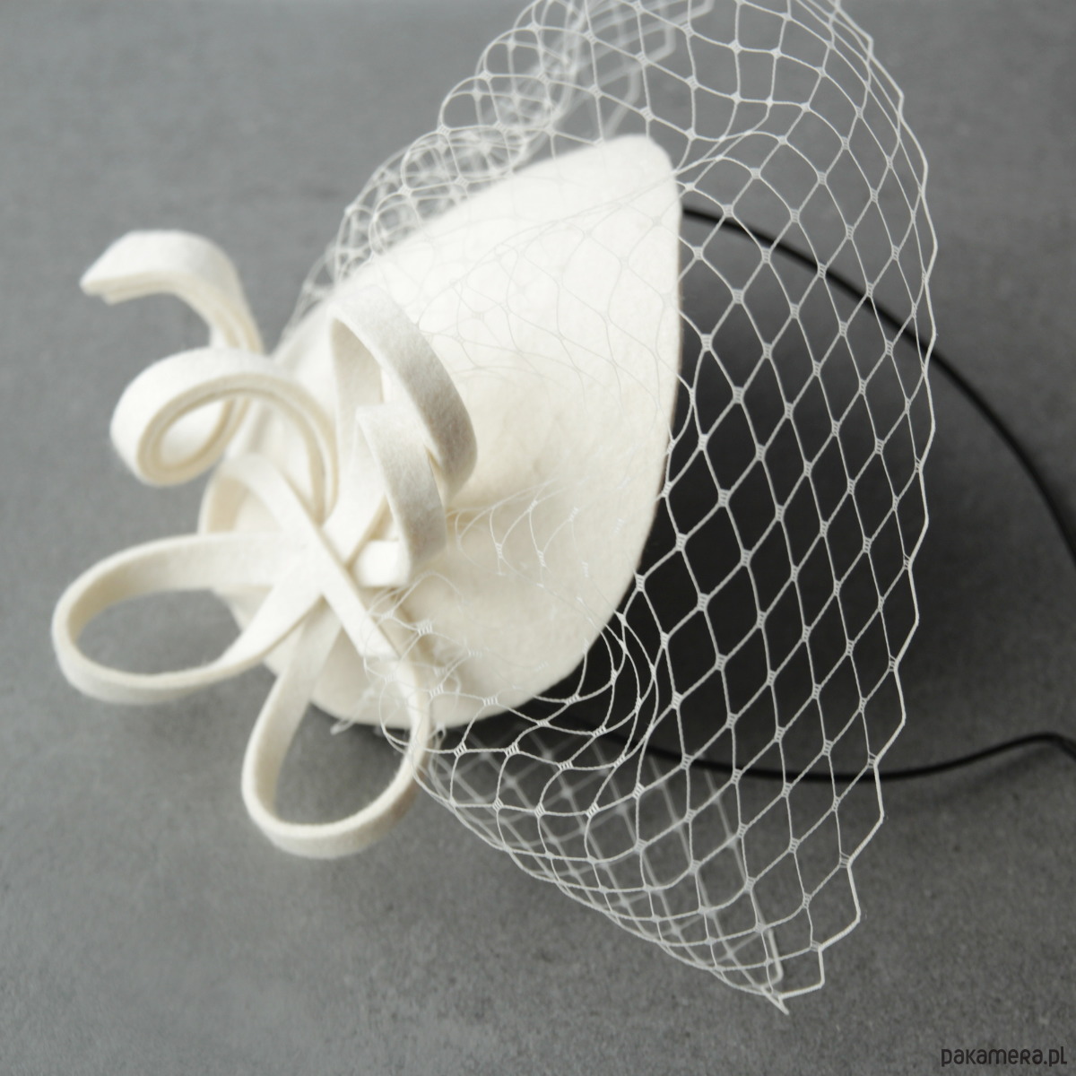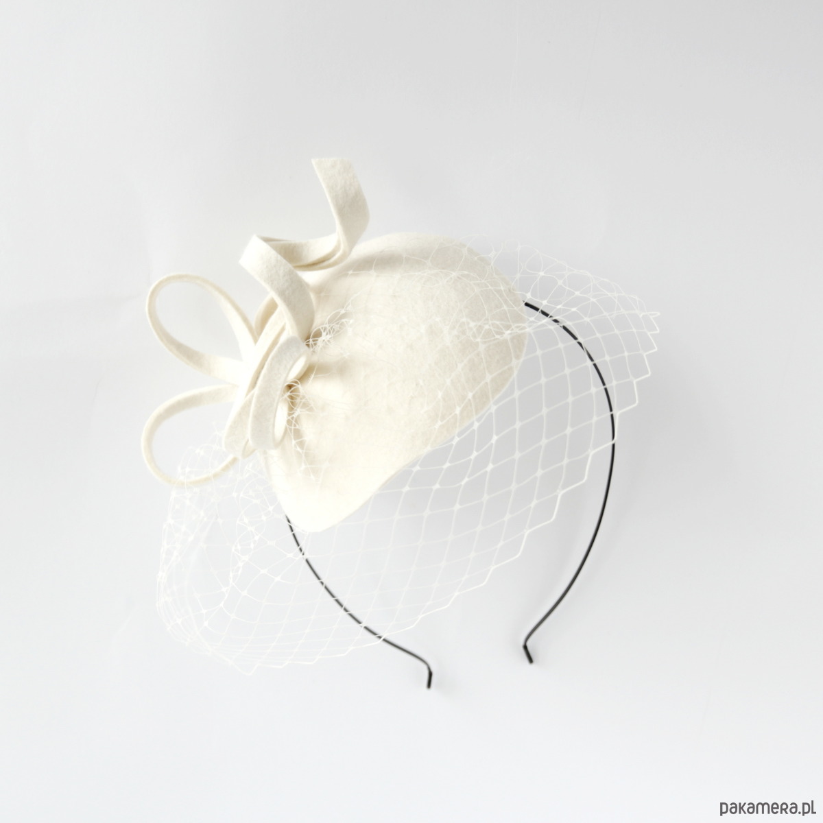 Mini toczek do włosów. Wykonany jest z filcu wełnianego, ozdobiony kokardką i woalką. Rozmiar ok 11 -12 cm. Zamocowany na metalowej opasce w kolorze czarnym .