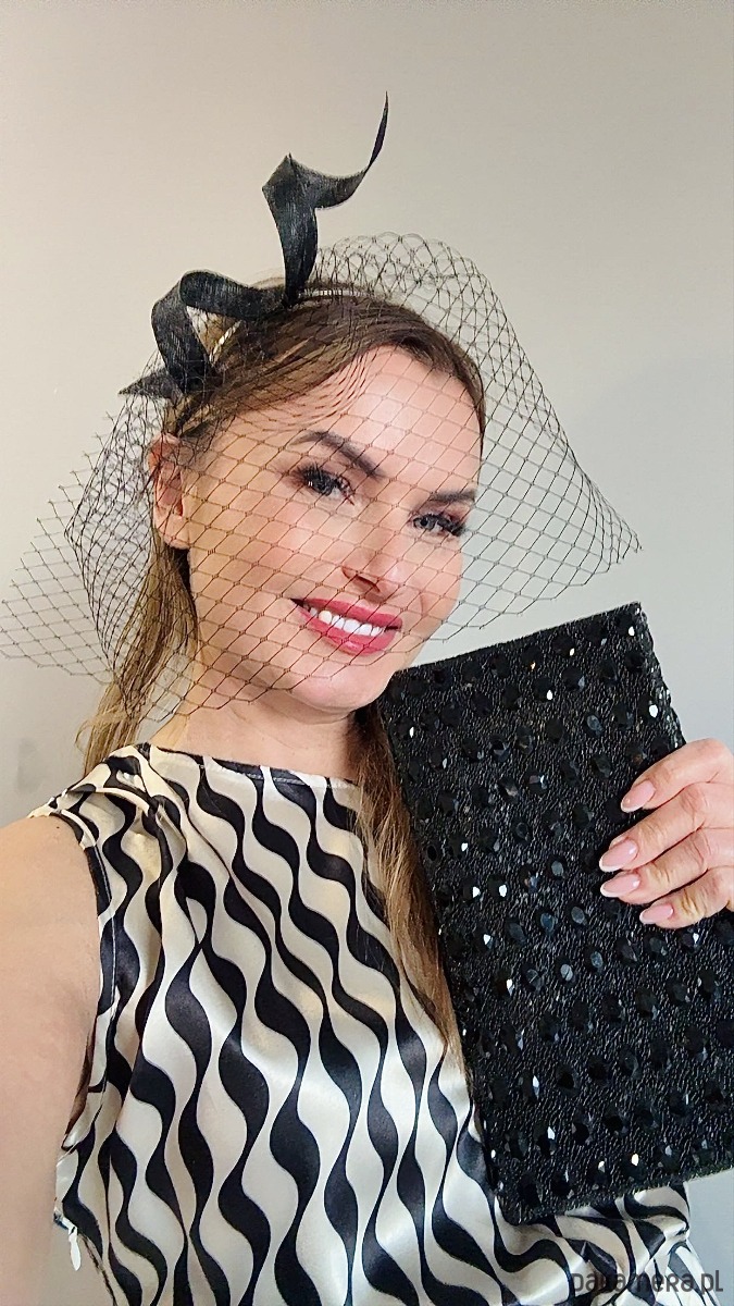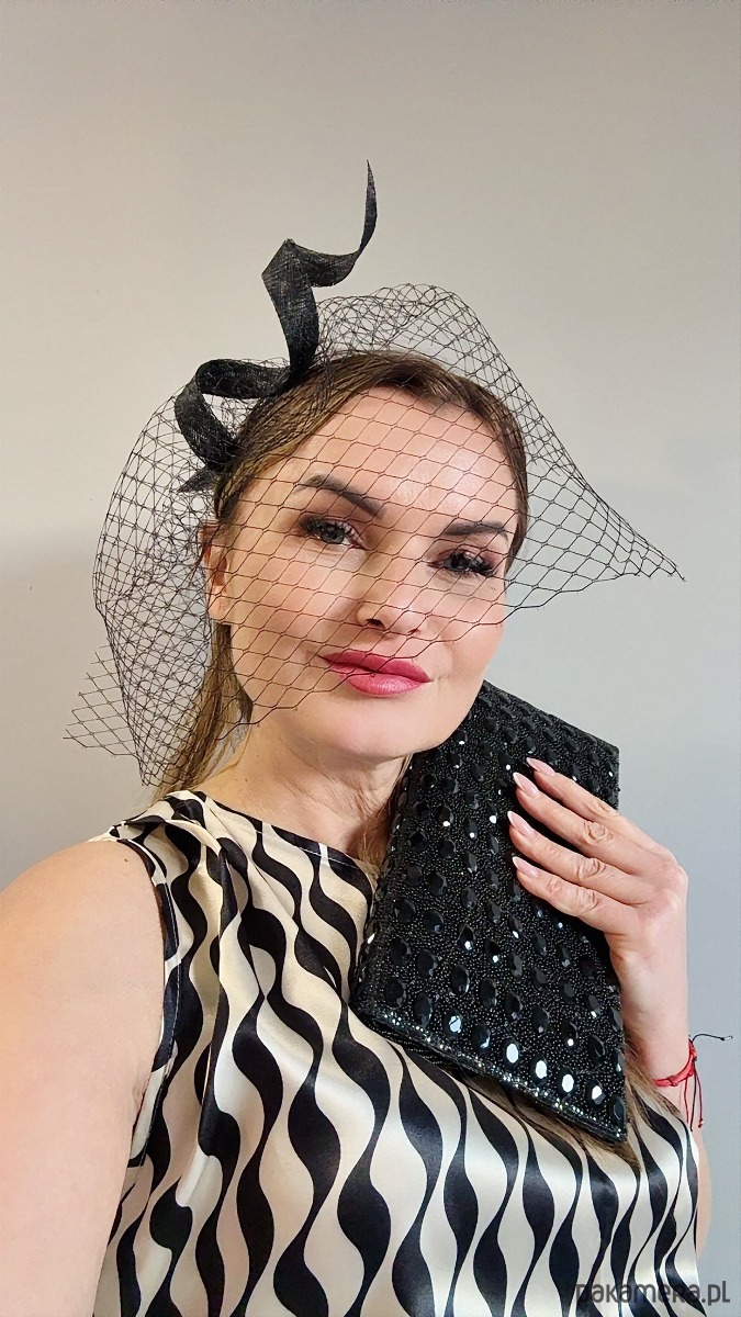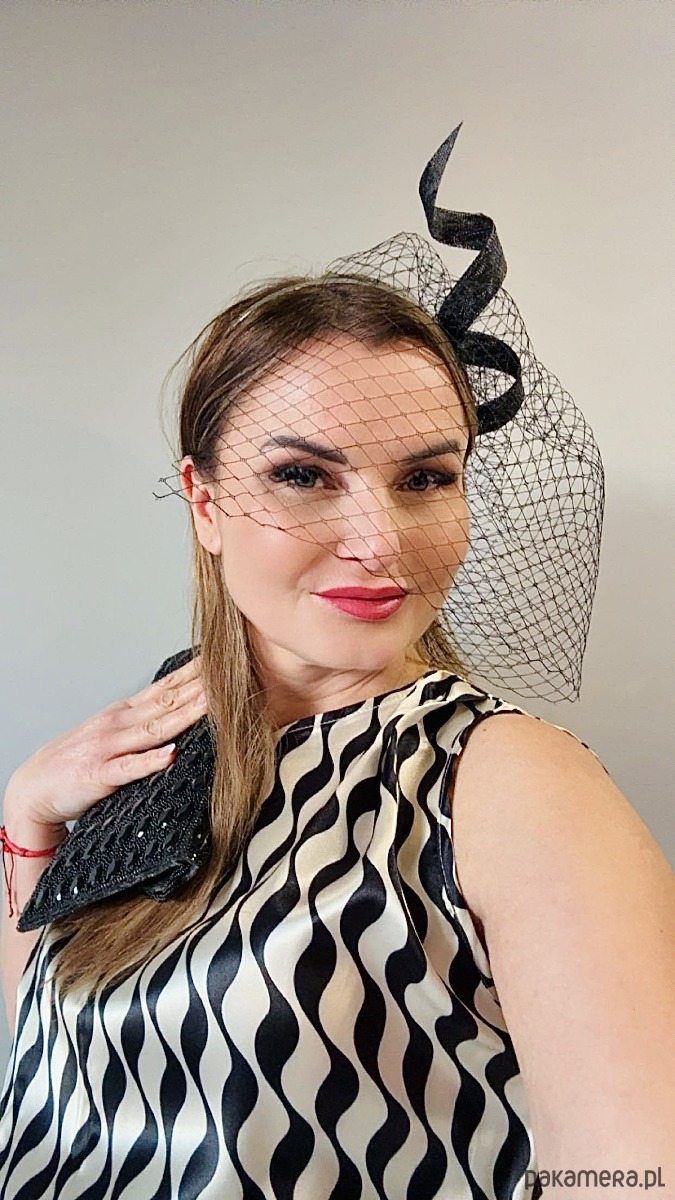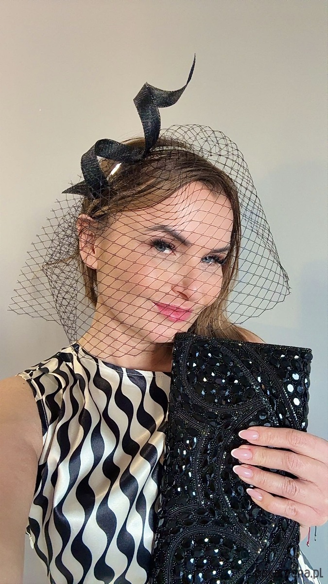Fascynator /ozdoba na głowę w czarnym kolorze .Piękny i elegancki dodatek do kreacji , doskonały na różne okazje. Wykonany profesjonalnie , ze szczególną starannością i dbałością o każdy szczegó , zamocowany na złotej ,czarnej lub srebrnej opasce - do wyboru .Fascynator można nosić na różne sposoby , a to dzięki mocowaniu do opaski , które jest wykonane w sposób , który umożliwia przesuwanie ozdoby do różnych pozycji na głowie , w zależności od potrzeby czy upodobania.