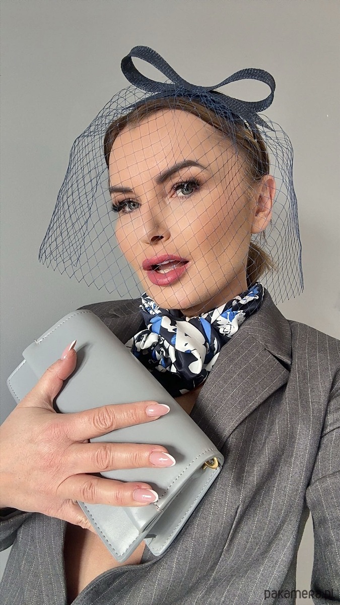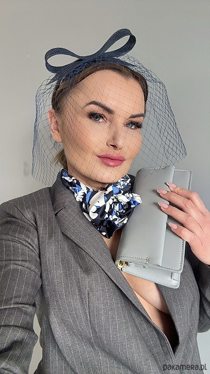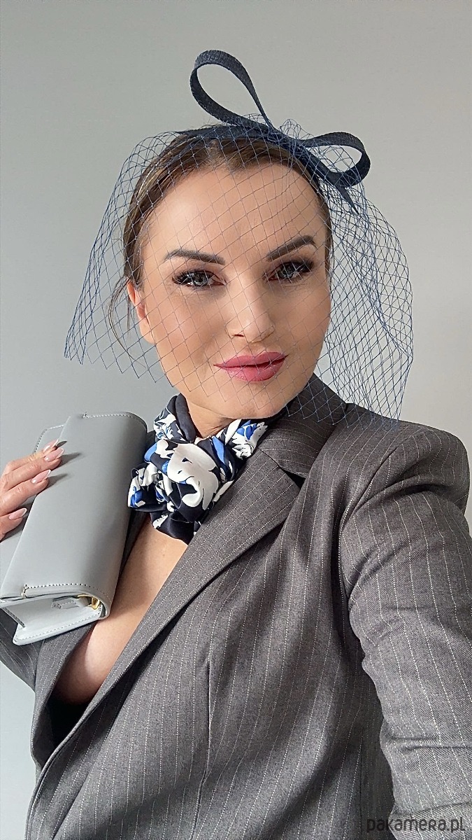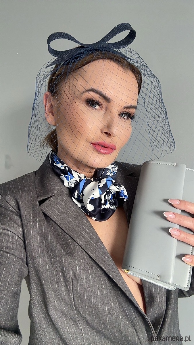 Fascynator /ozdoba na głowę w granatowym kolorze .Piękny i elegancki dodatek do kreacji , doskonały na różne okazje. Wykonany profesjonalnie , ze szczególną starannością i dbałością o każdy szczegó , zamocowany na złotej ,czarnej lub srebrnej opasce - do wyboru .Fascynator można nosić na różne sposoby , a to dzięki mocowaniu do opaski , które jest wykonane w sposób , który umożliwia przesuwanie ozdoby do różnych pozycji na głowie , w zależności od potrzeby czy upodobania.