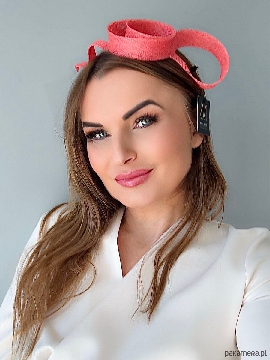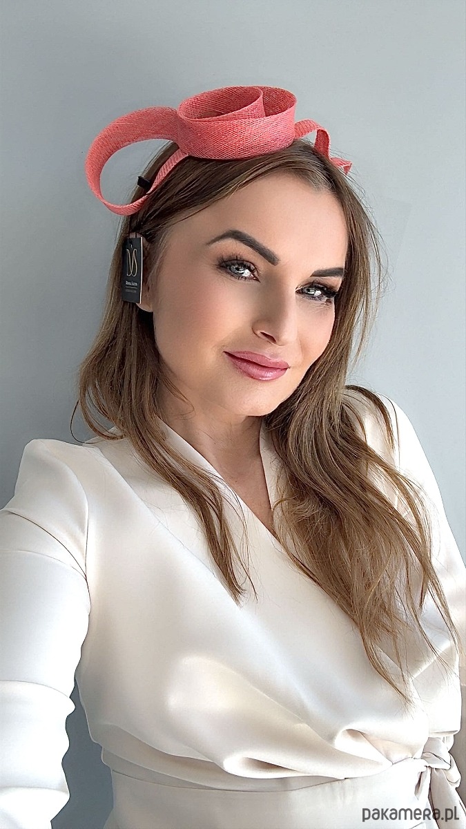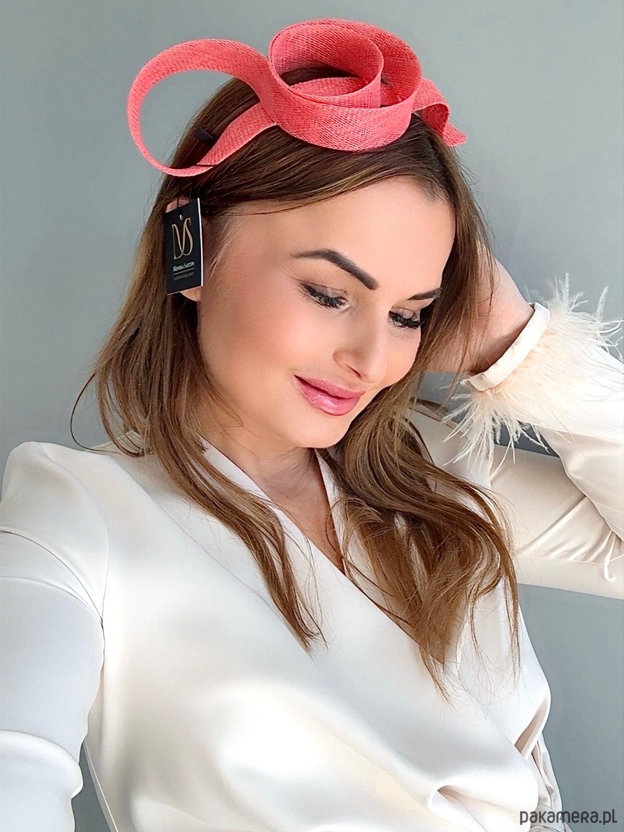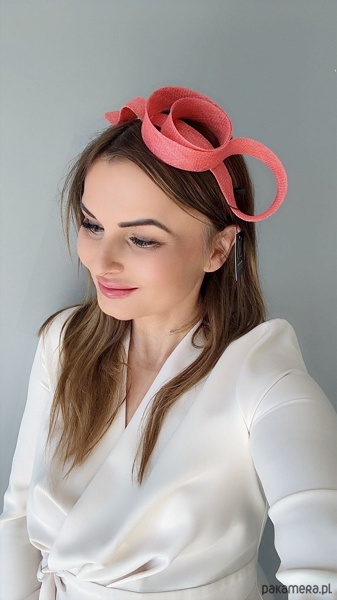 Fascynator /ozdoba na głowę w koralowym kolorze .Piękny i elegancki dodatek do kreacji , doskonały na różne okazje. Wykonany profesjonalnie , ze szczególną starannością i dbałością o każdy szczegół , z brytyjskiej taśmy sinamay , zamocowany na złotej ,czarnej lub srebrnej opasce - do wyboru .Fascynator można nosić na różne sposoby , a to dzięki mocowaniu do opaski , które jest wykonane w sposób , który umożliwia przesuwanie ozdoby do różnych pozycji na głowie , w zależności od potrzeby czy upodobania.