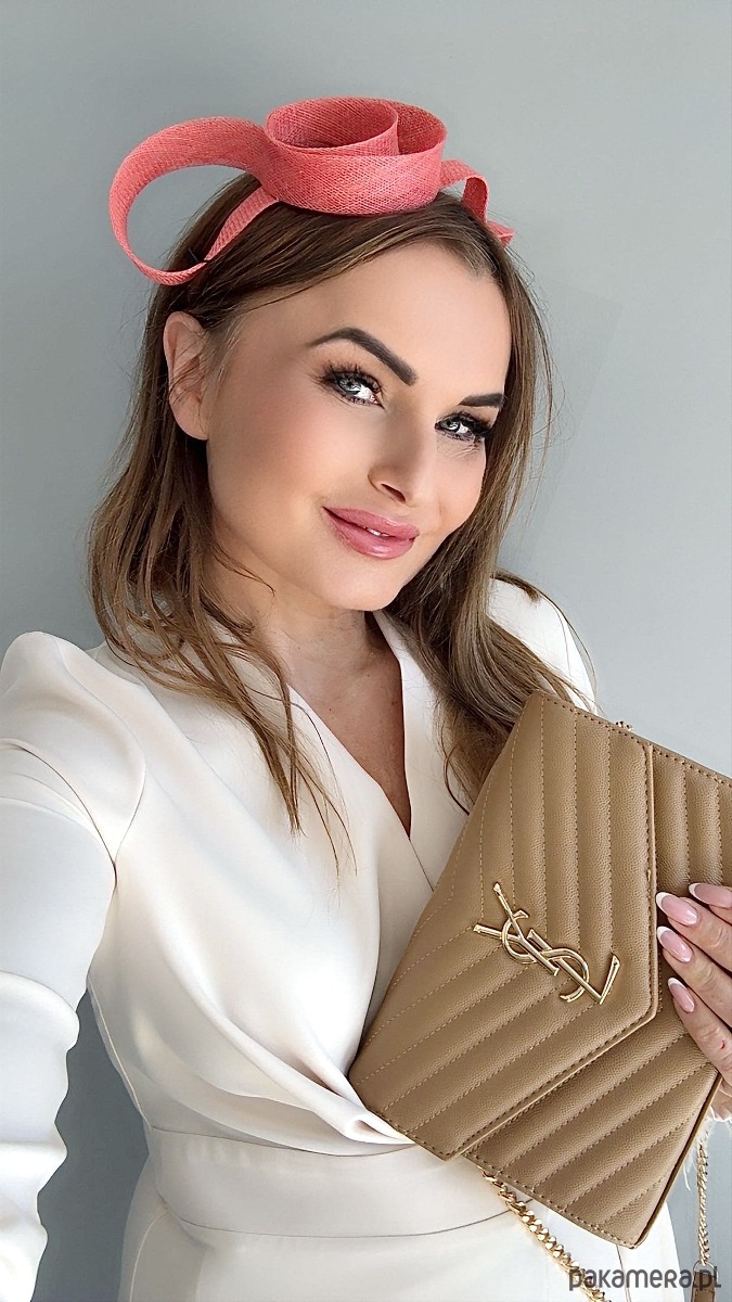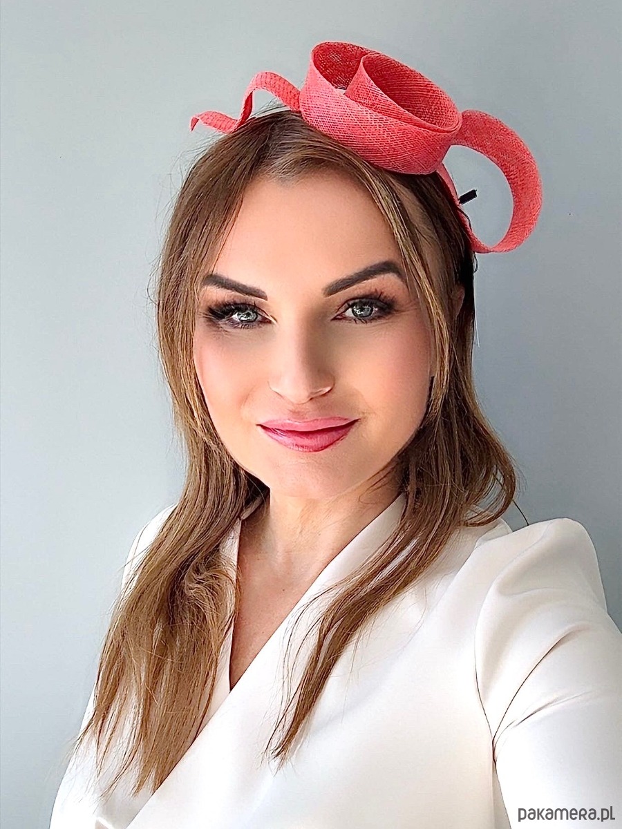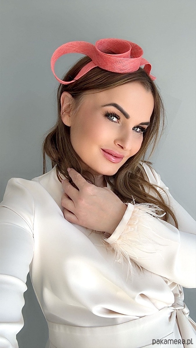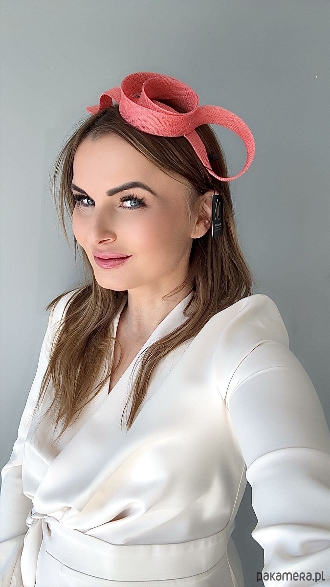 Fascynator /ozdoba na głowę w koralowym kolorze .Piękny i elegancki dodatek do kreacji , doskonały na różne okazje. Wykonany profesjonalnie , ze szczególną starannością i dbałością o każdy szczegół , z brytyjskiej taśmy sinamay , zamocowany na złotej ,czarnej lub srebrnej opasce - do wyboru .Fascynator można nosić na różne sposoby , a to dzięki mocowaniu do opaski , które jest wykonane w sposób , który umożliwia przesuwanie ozdoby do różnych pozycji na głowie , w zależności od potrzeby czy upodobania.