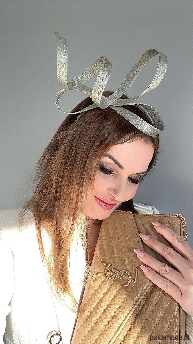 Wykonany profesjonalnie , ze szczególną starannością i dbałością o każdy szczegół , z brytyjskiej taśmy sinamay oraz zamocowany na złotej lub srebrnej opasce - do wyboru .Fascynator można nosić na różne sposoby , a to dzięki mocowaniu do opaski , które jest wykonane w sposób , który umożliwia przesuwanie ozdoby do różnych pozycji na głowie , w zależności od potrzeby czy upodobania.