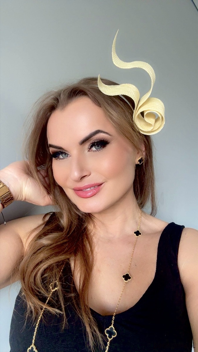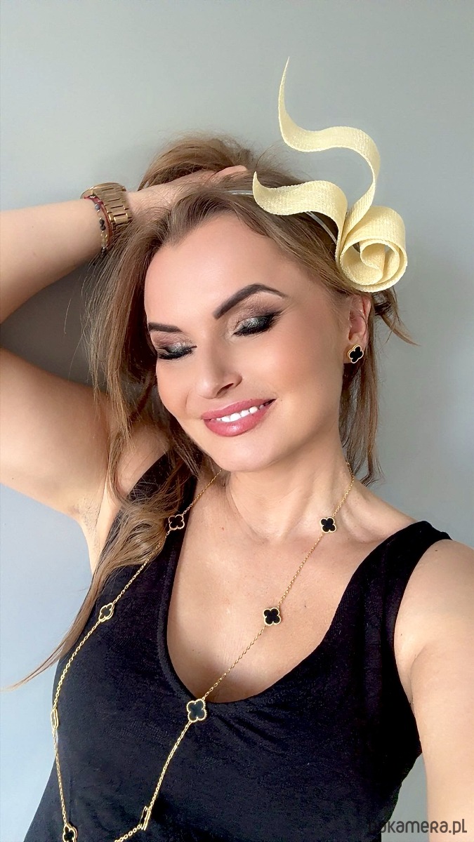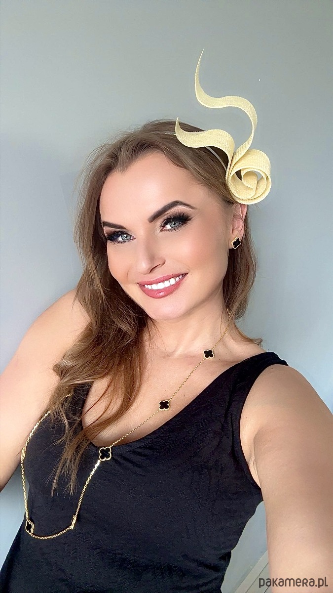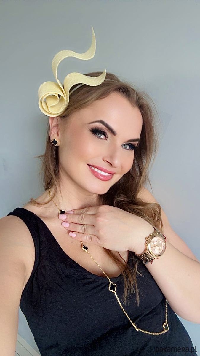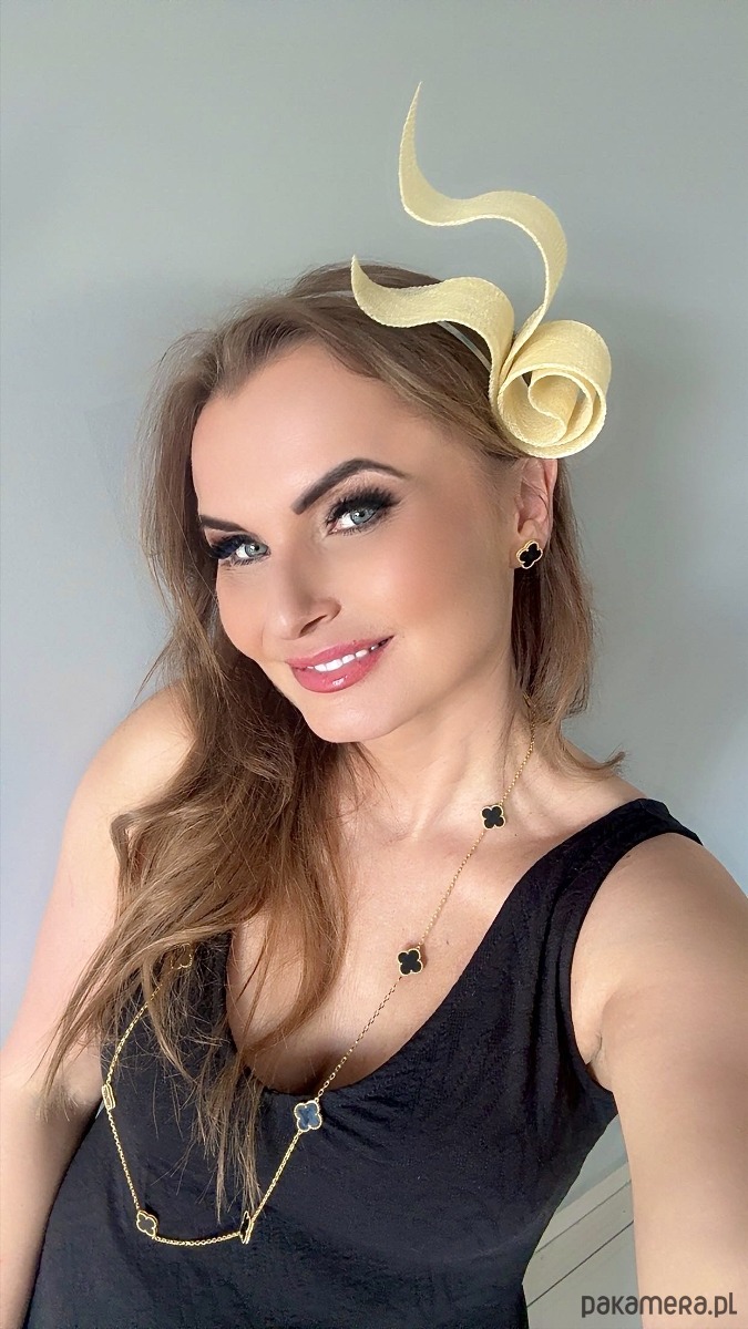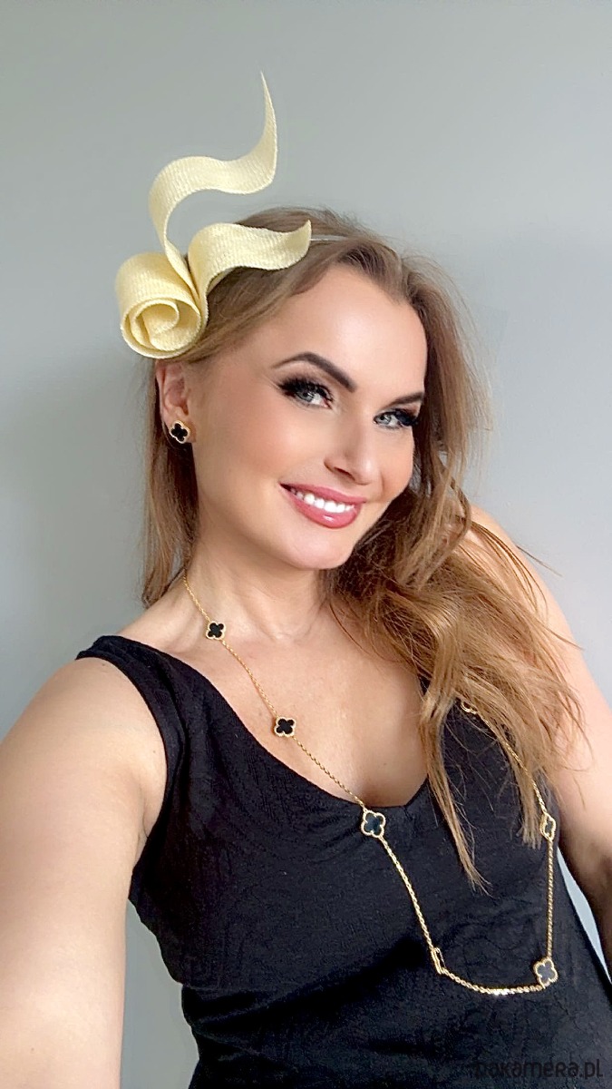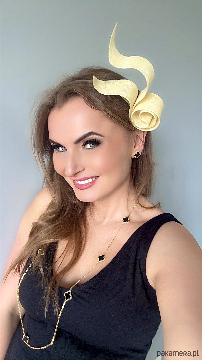 Wykonany profesjonalnie , ze szczególną starannością i dbałością o każdy szczegół , z brytyjskiej taśmy sinamay oraz zamocowany na złotej lub srebrnej opasce - do wyboru .Fascynator można nosić na różne sposoby , a to dzięki mocowaniu do opaski , które jest wykonane w sposób , który umożliwia przesuwanie ozdoby do różnych pozycji na głowie , w zależności od potrzeby czy upodobania.