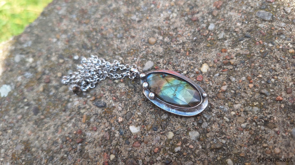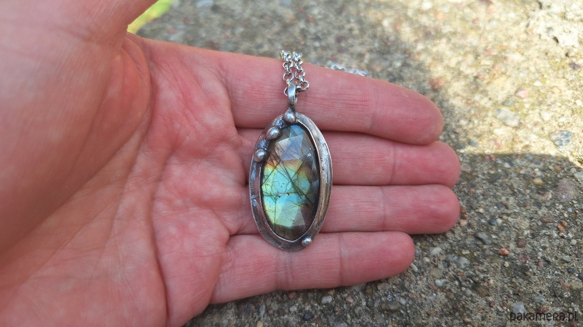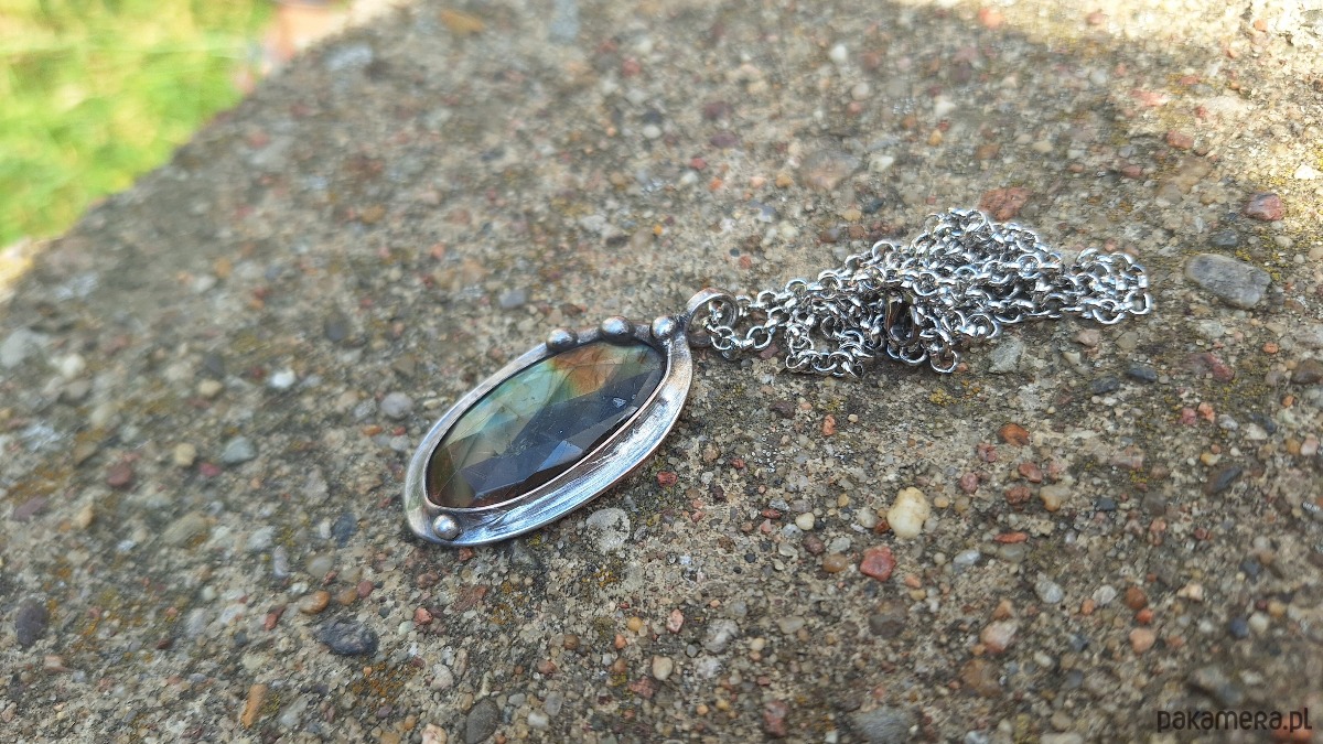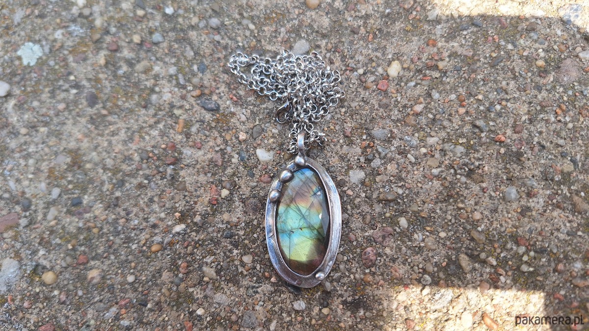 Wisiorek wykonany z miedzi, cyny i labradorytu. Wymiary ok. 4 na 2 cm. Zawieszony na łańcuszku o długości ok. 50 cm.