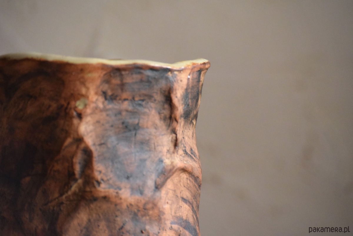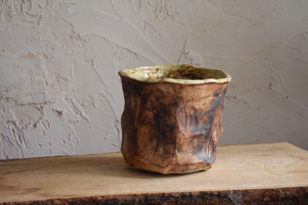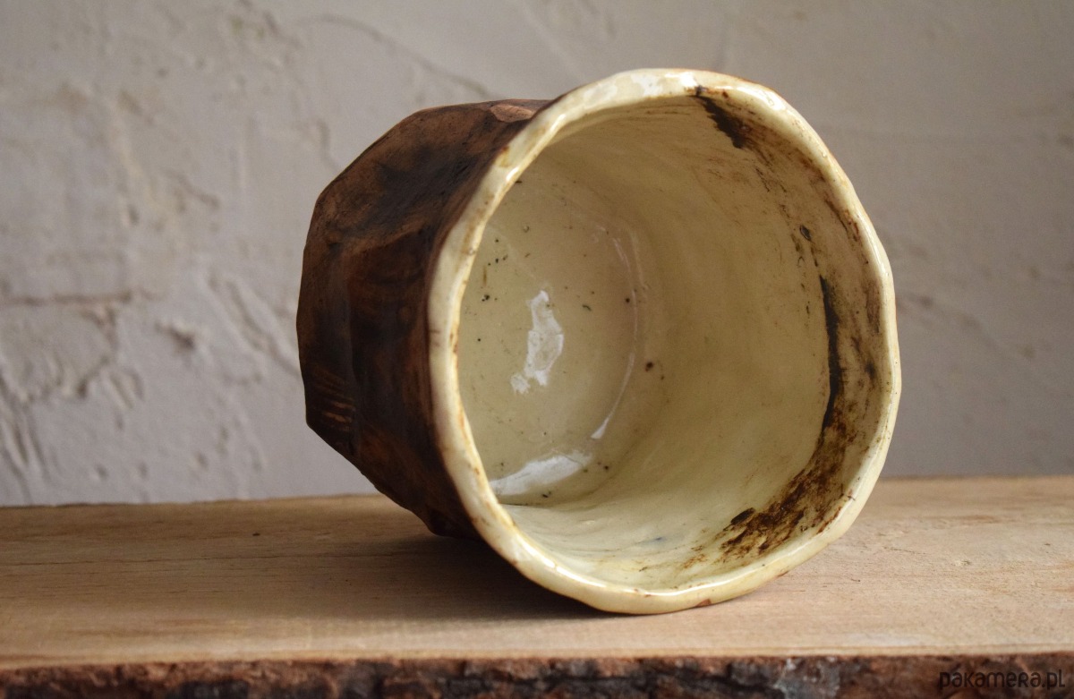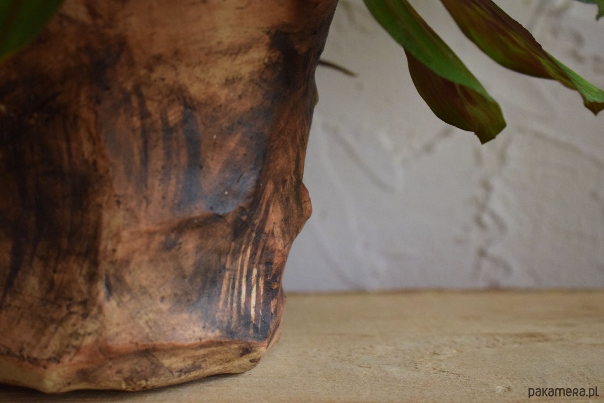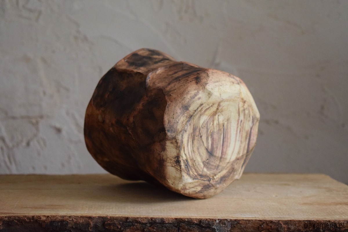 Osłonkę uformowałam z gliny w jasnym kolorze. Pomalowałam ją ekspresyjnie na brązowo, w taki sposób, żeby przypominała korę drzewa. Wnętrze osłonki jest poszkliwione kolorem bezbarwnym, żeby nie przepuszczała wody. Ostatecznie całość wypaliłam w temp. 1240 st C, co czyni ją w pełni funkcjonalną i użytkową.