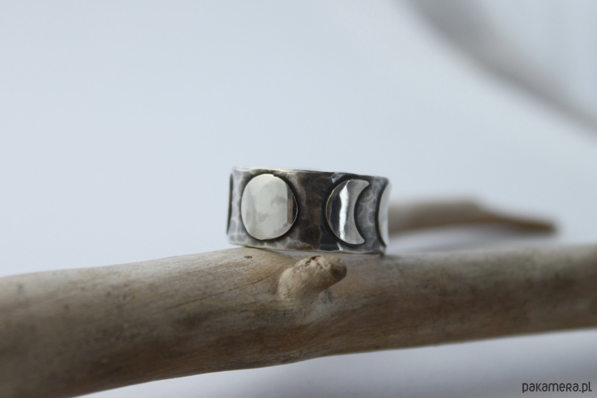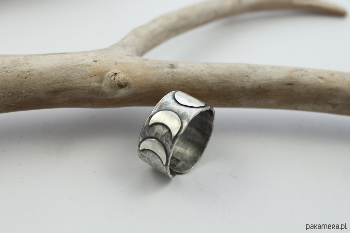 Surowa obrączka z fazami księżyca wykonana od podstaw w srebrze pr 925.