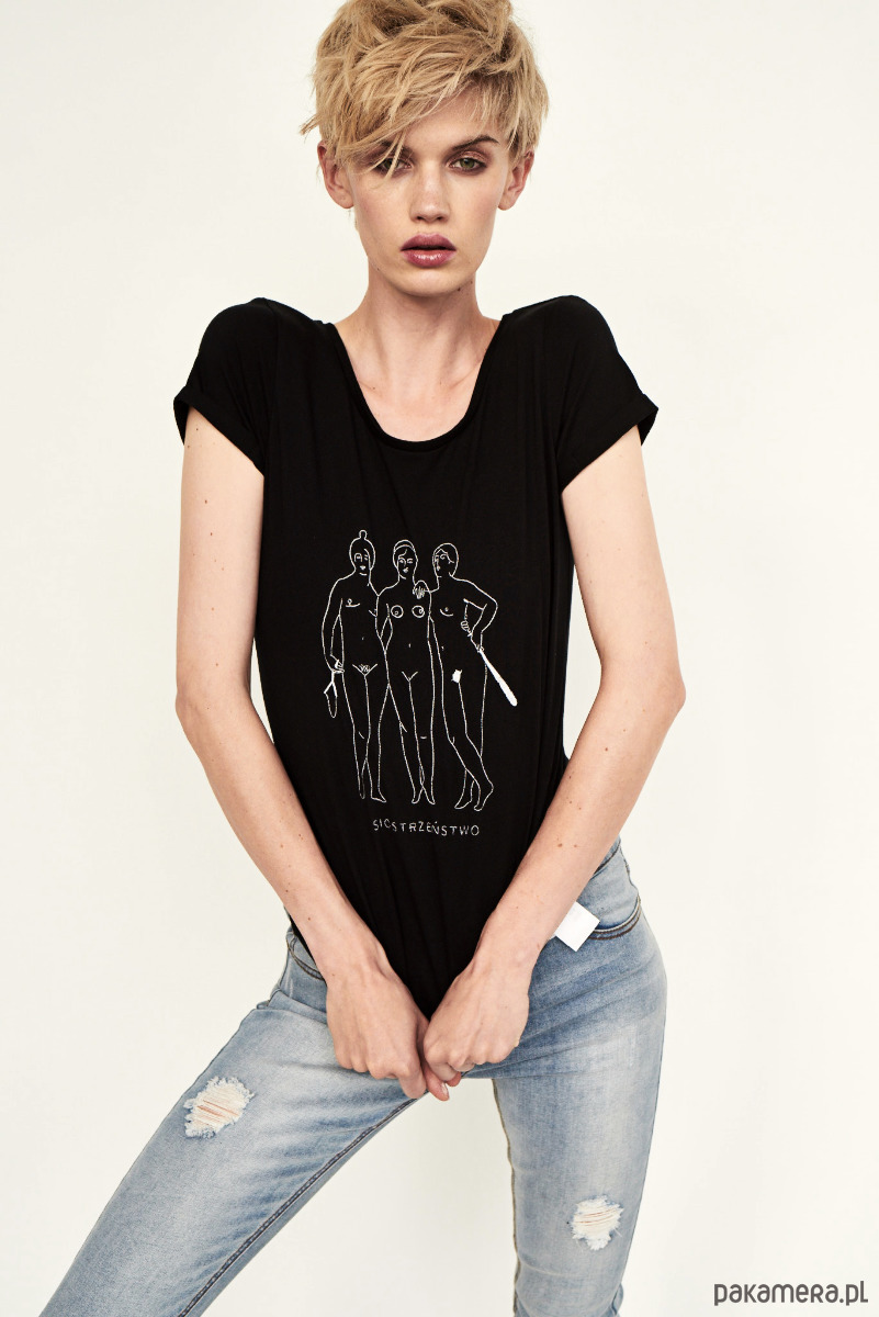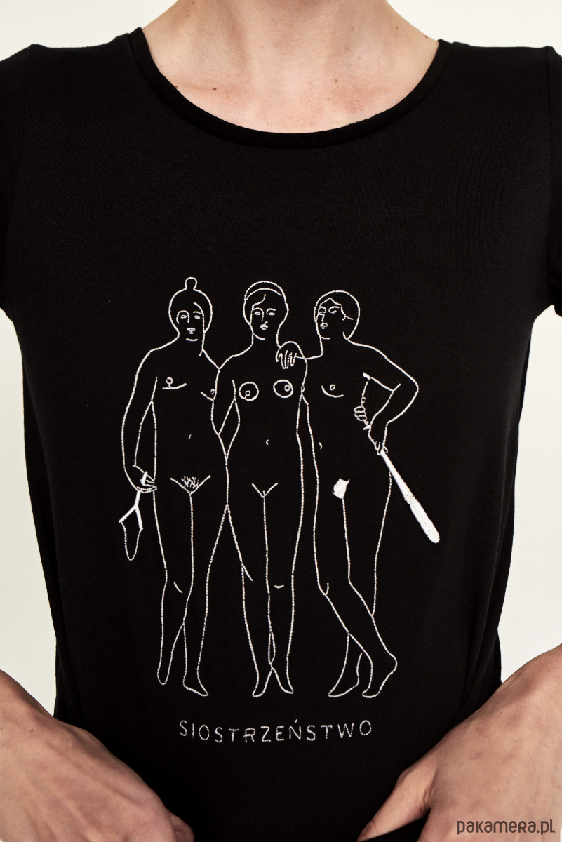 Pierwszy femi-shirt, hit, który zapoczątkował całą serię kobiecych koszulek. Porusza tematykę siostrzeństwa - wyraża potrzebę nowej jakości w damskich relacjach, opartych na lojalności, aktywnym wspieraniu się, nieagresywnym doradztwie i afirmacji naturalnej kobiecości. Technologia haftowania grafiki jest zarazem ukłonem w stronę tworzonego dawniej przez kobiety, tradycyjnego rękodzieła artystycznego.Top mocno wpisuje się w trend t-shirt statement oraz coraz popularniejszych koszulkowych haftów. Slogan dodaje pazura, zamieniając neutralny t-shirt w modowy manifest.