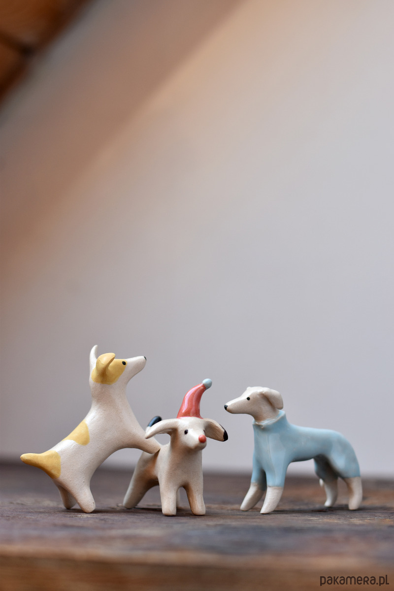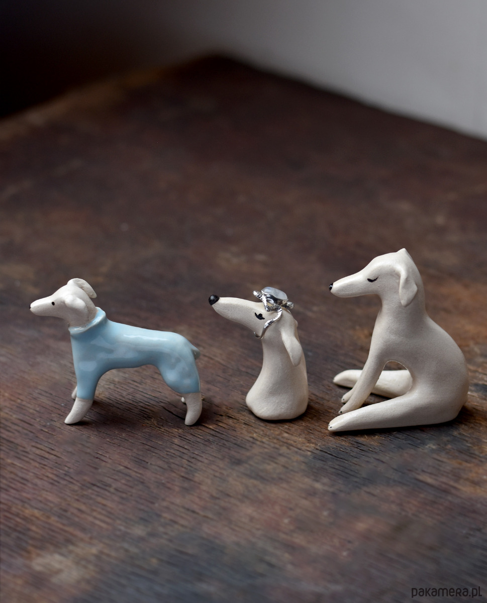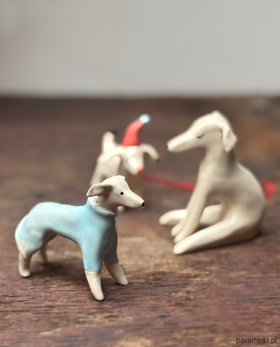 Urocza figurka ceramiczna Charcik w niebieskim sweterku. W całości wykonana ręcznie.