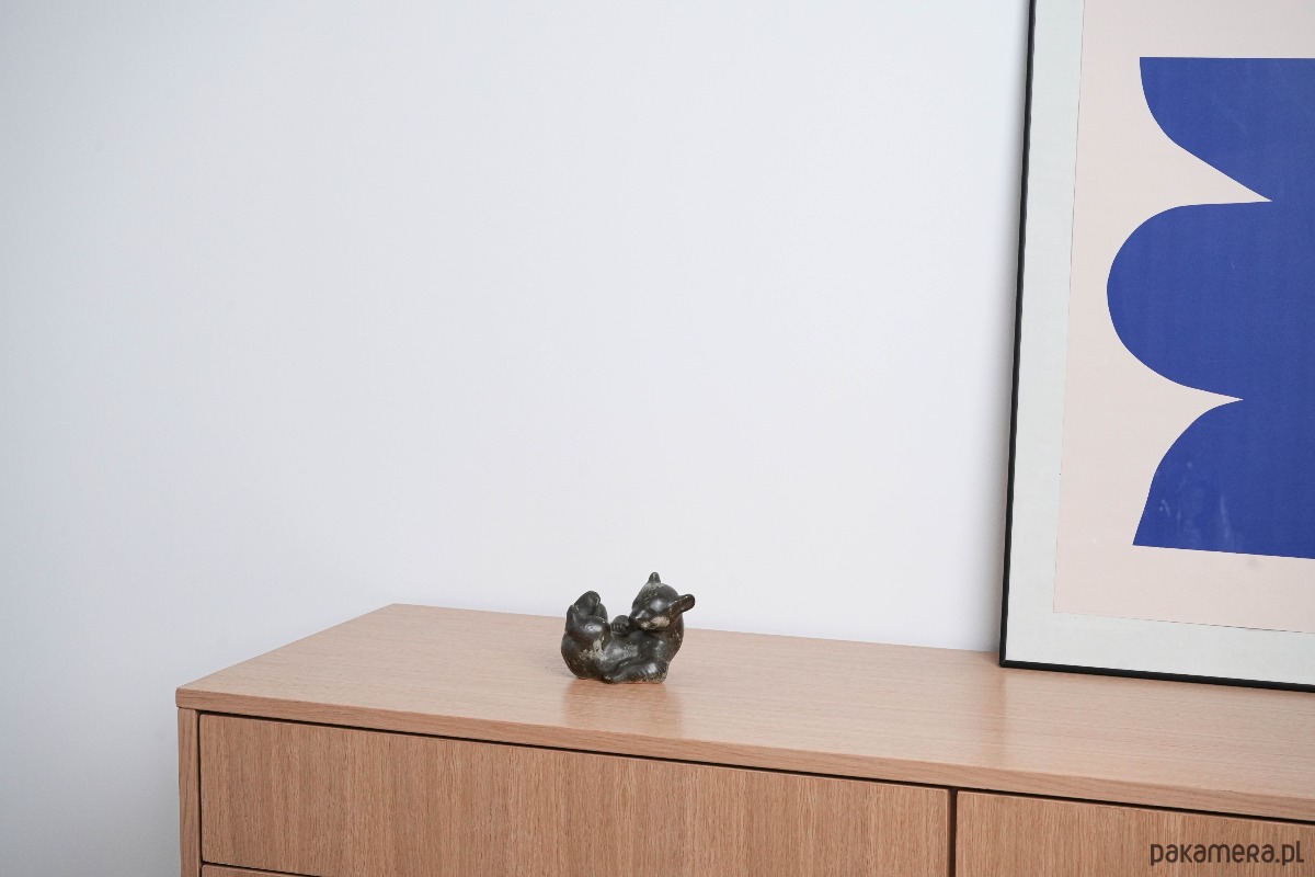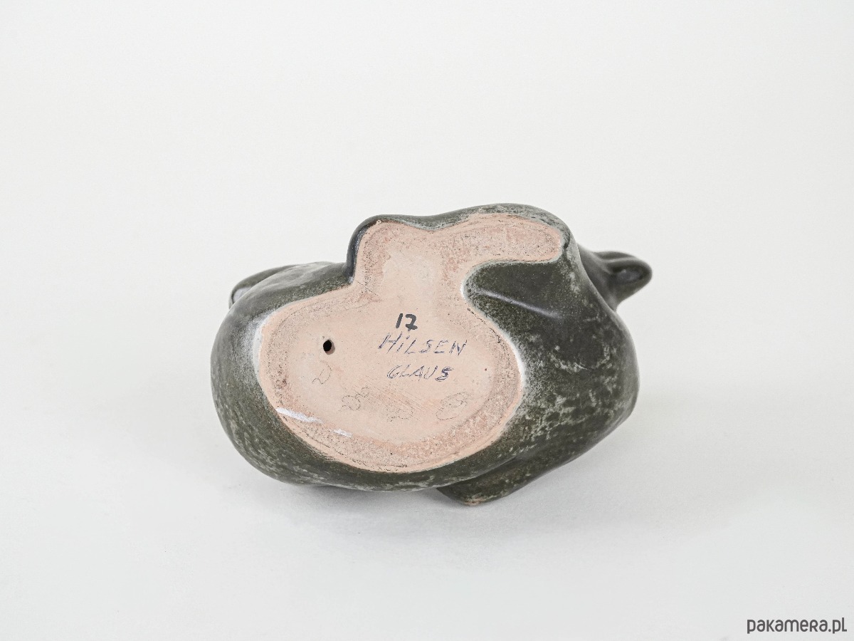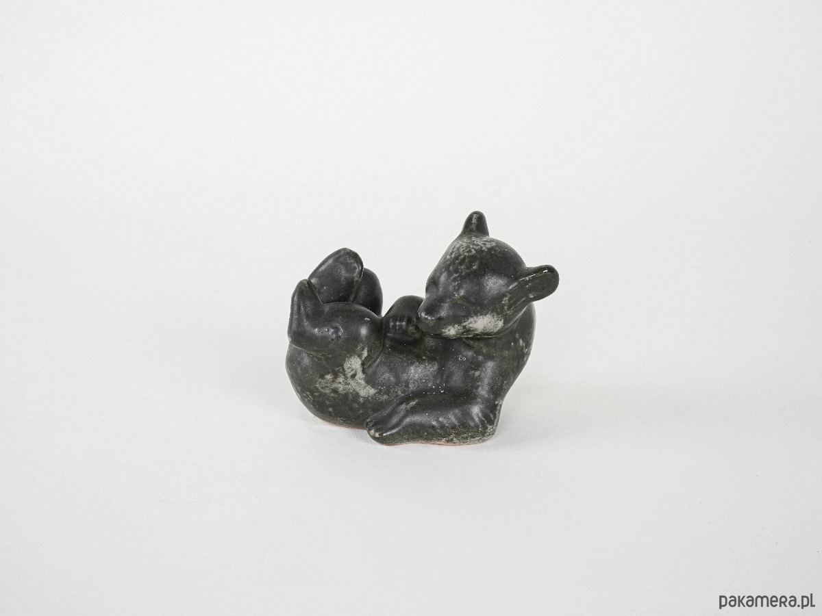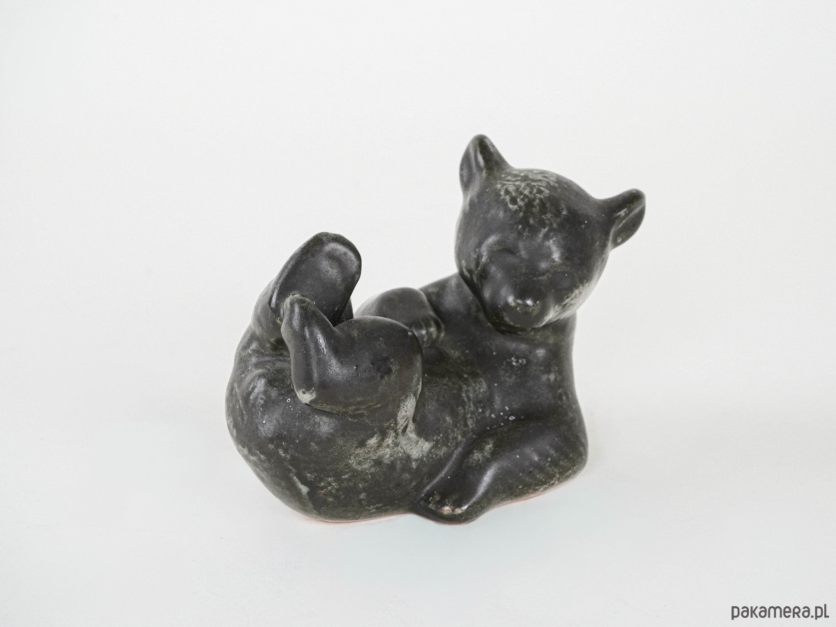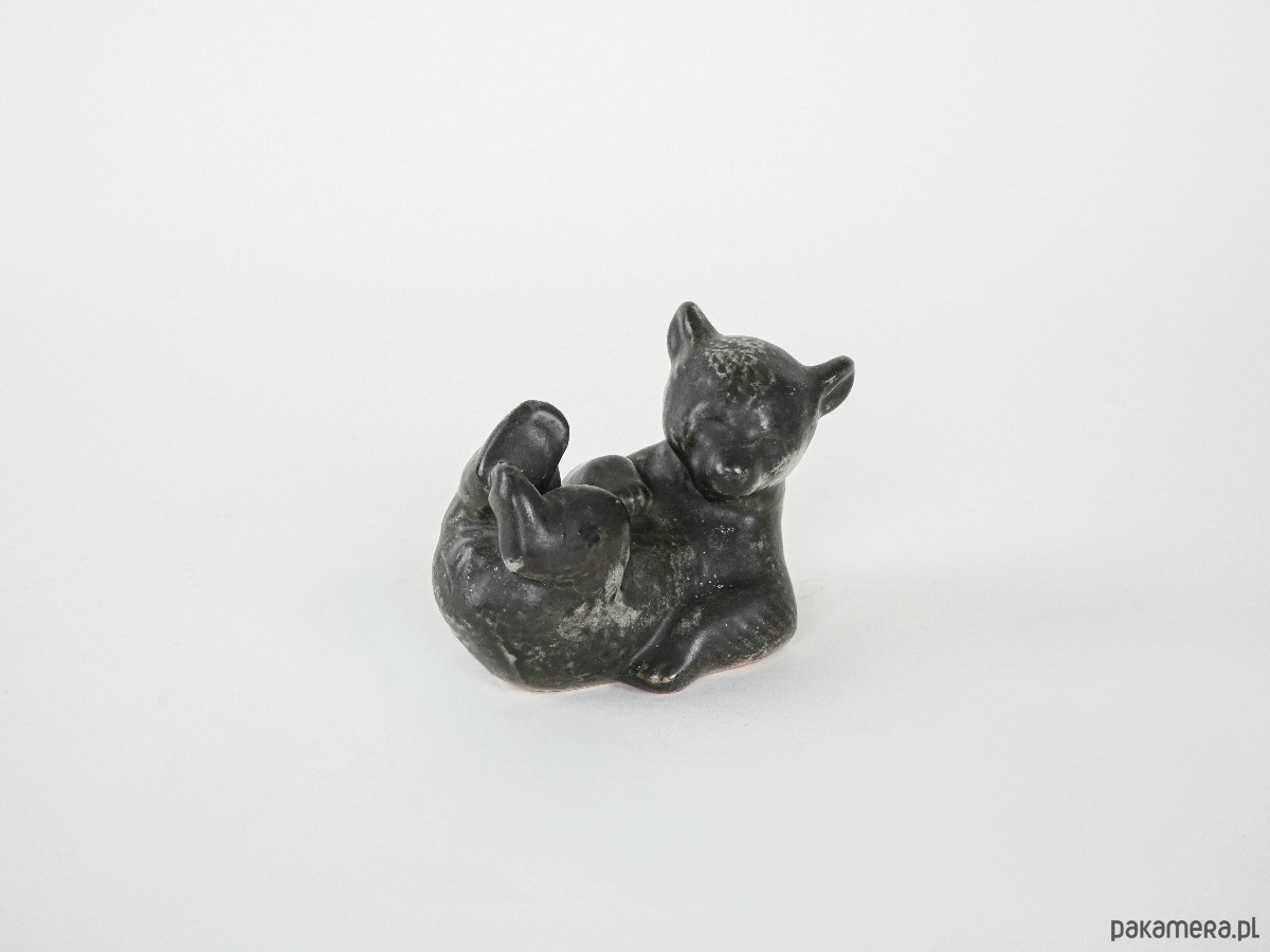 Urocza figurka ceramiczna przedstawiająca misia w pozycji leżącej, z lekko podkulonymi łapkami. Utrzymana w odcieniach brązu z zielonkawym, nakrapianym szkliwieniem, które podkreśla naturalny charakter. Świetna propozycja dla kolekcjonerów jako dekoracja półki czy prezent w duchu retro.