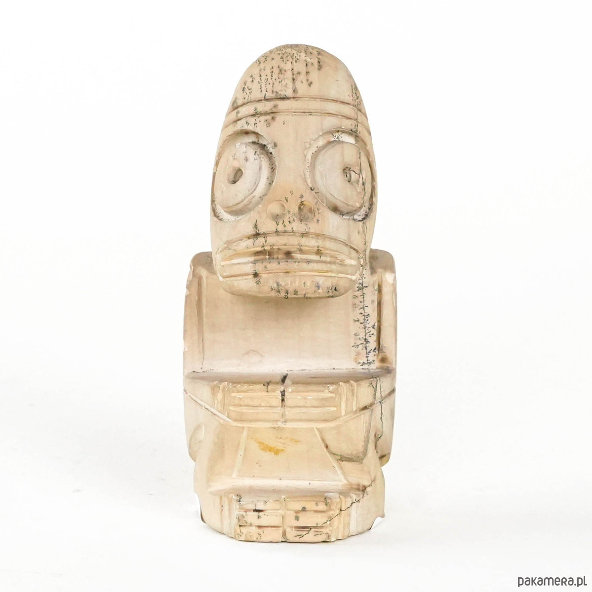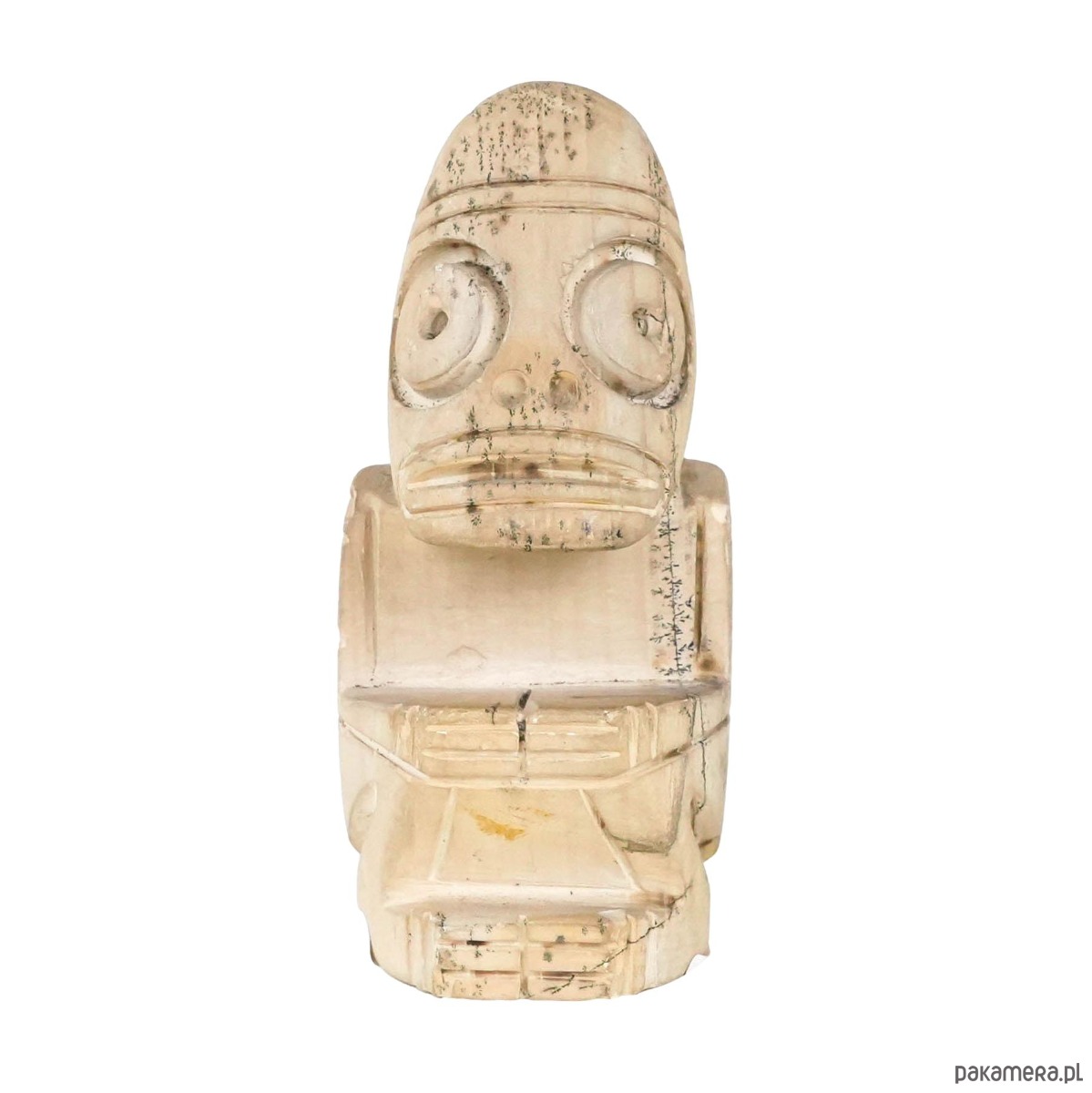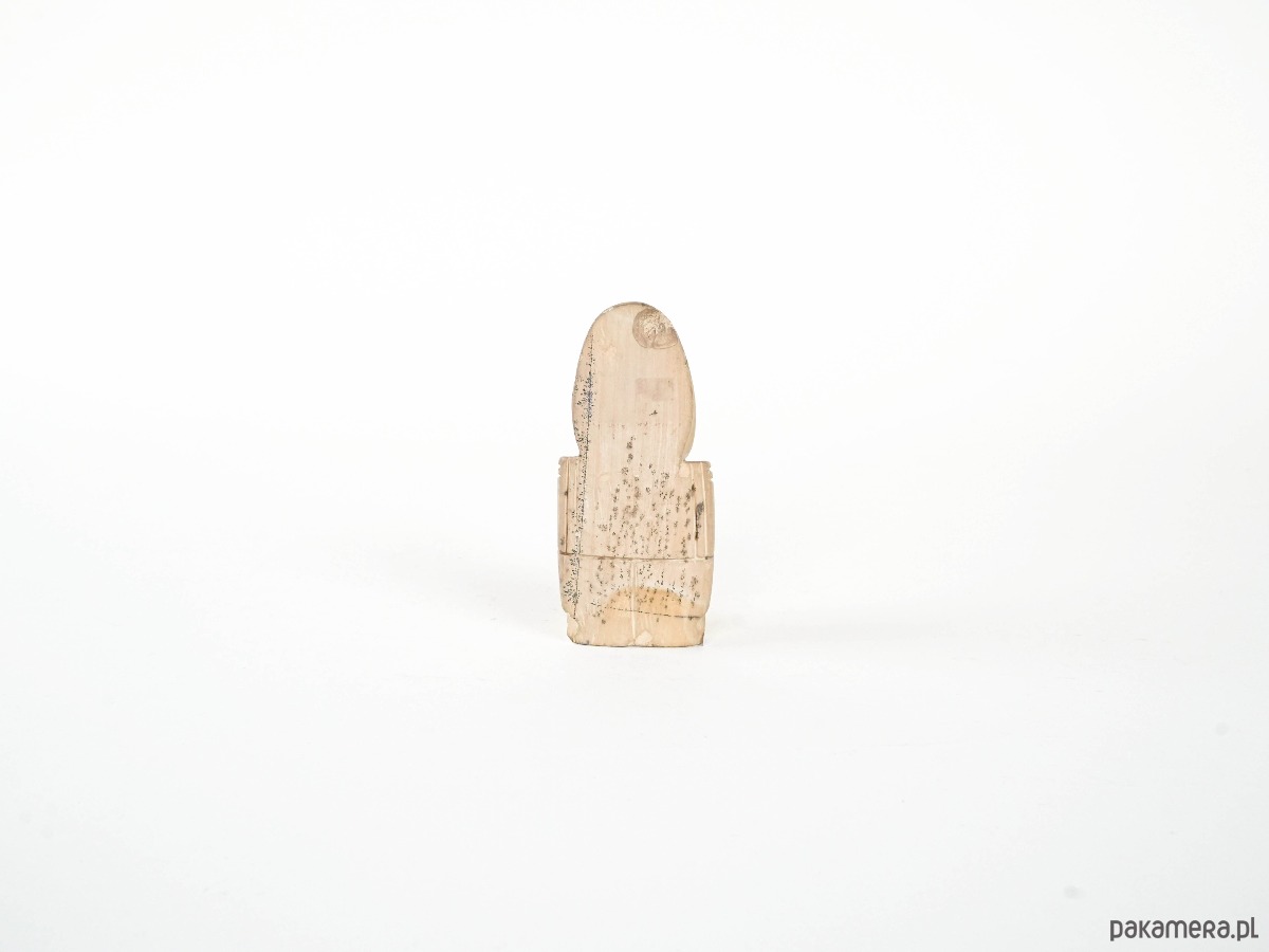 Figurka o stylizowanych, geometrycznych kształtach, nawiązująca do estetyki sztuki plemiennej. Uproszczona forma i wyraziste detale nadają jej symboliczny charakter, a patyna powierzchni podkreśla dekoracyjną wartość obiektu.