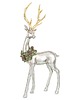 Figurka jelenia wykonana została z tworzywa sztucznego. Dominującym kolorem jest srebrny. Złote rogi dodają blasku. Na szyi jelenia zawisł ozdobny wieniec świąteczny.