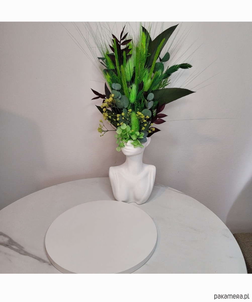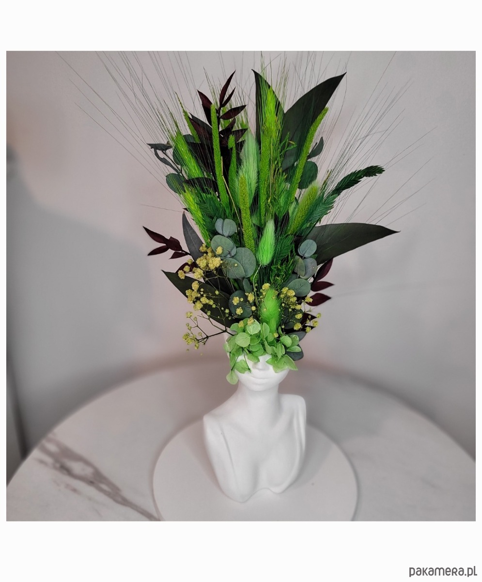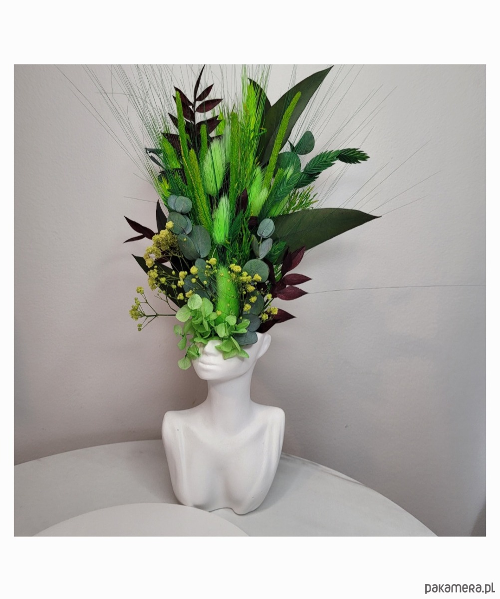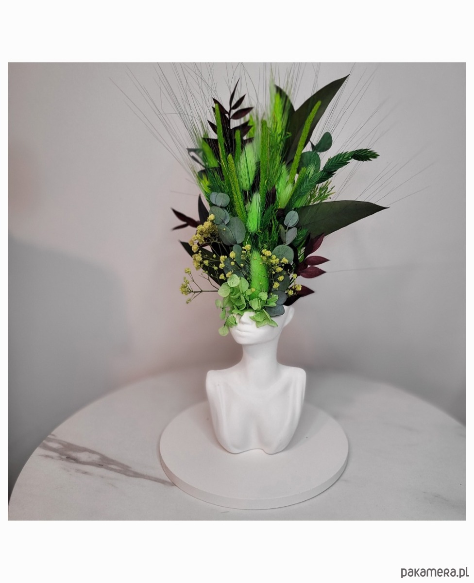 Dekoracyjna kompozycja w kształcie kobiecej figury z intensywnie zielonymi roślinami – idealne połączenie nowoczesnego designu i naturalnego piękna.