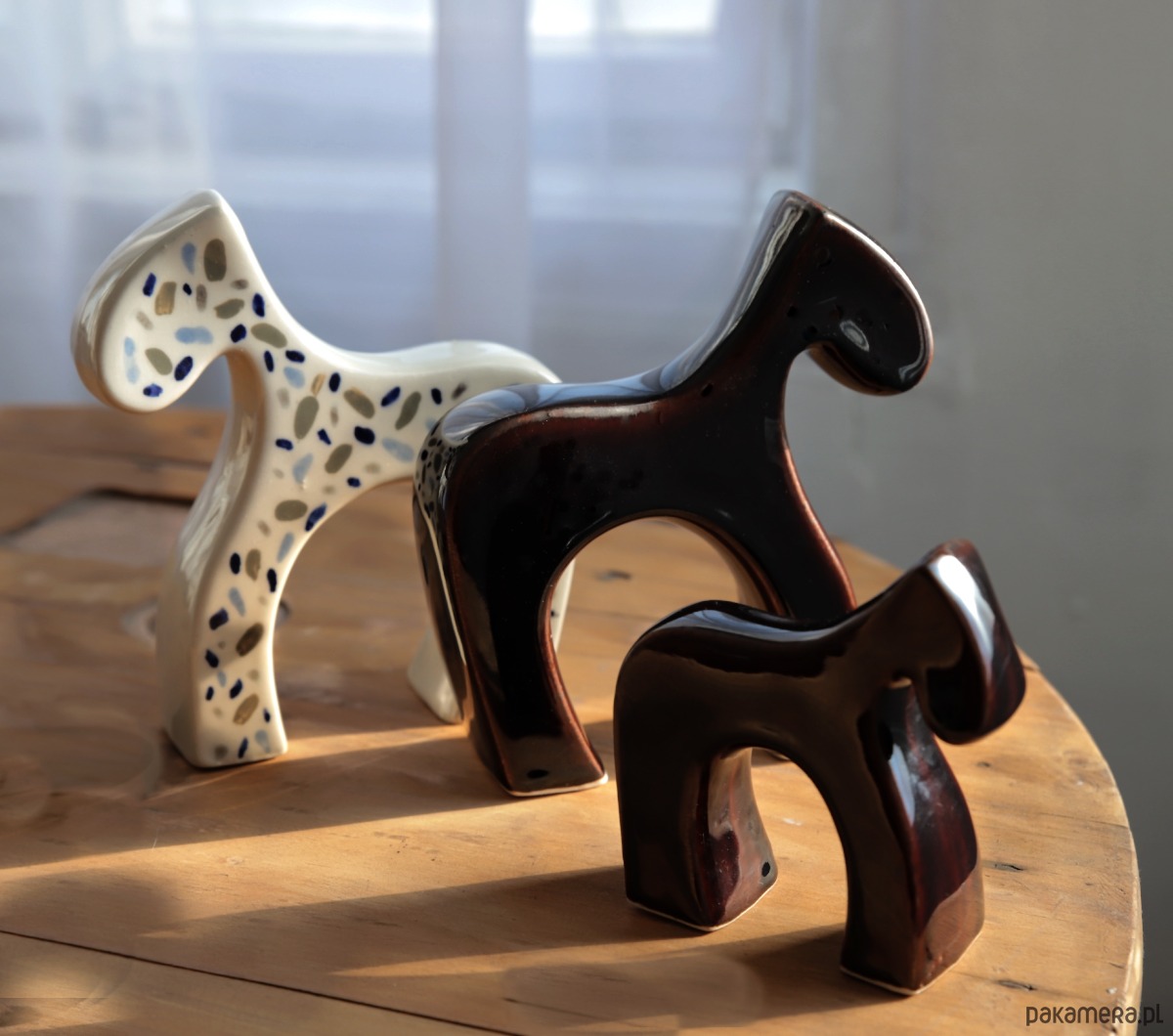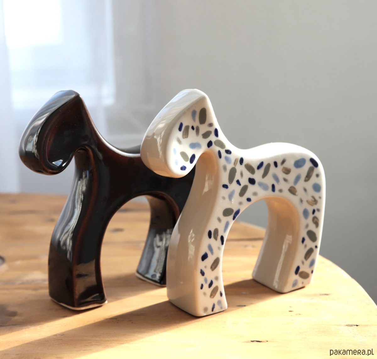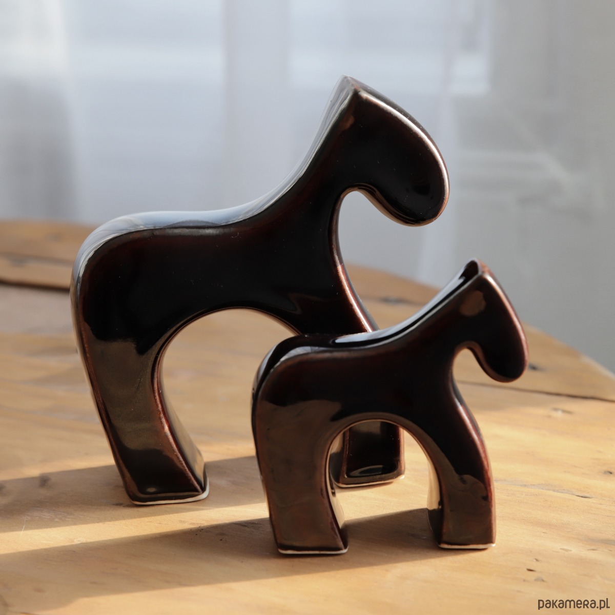 Figurka ceramiczna konik, pokryty ciemno brązowym szkliwem.