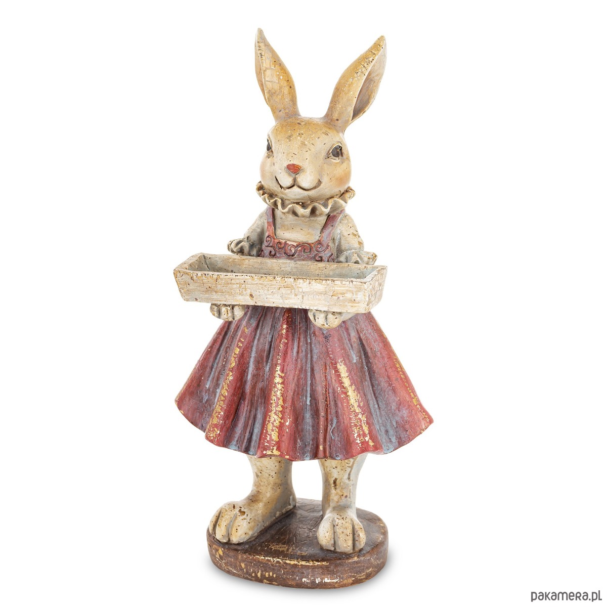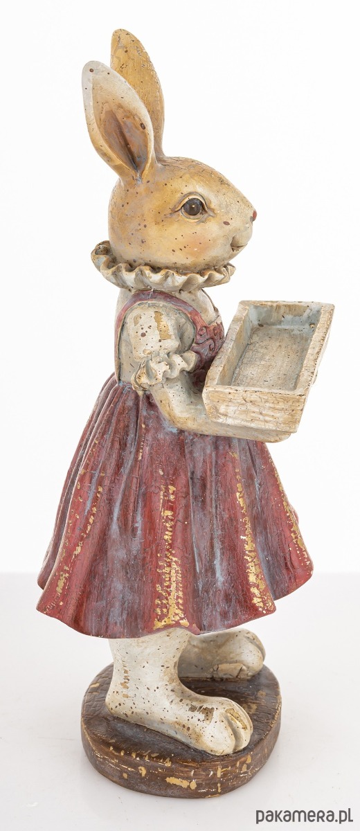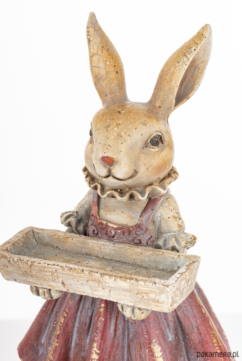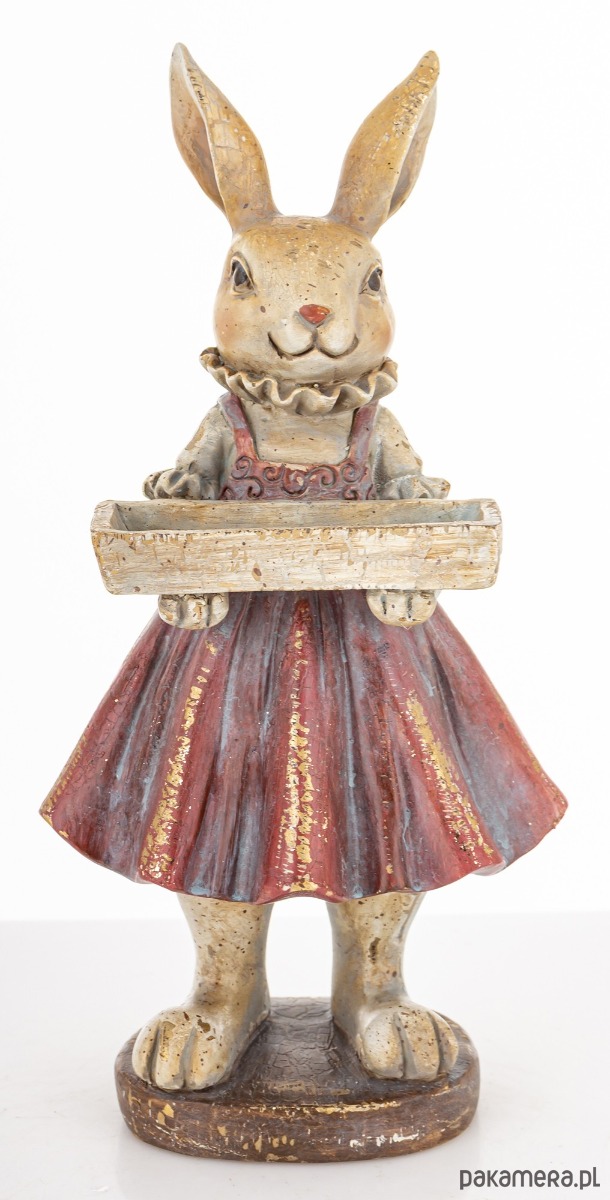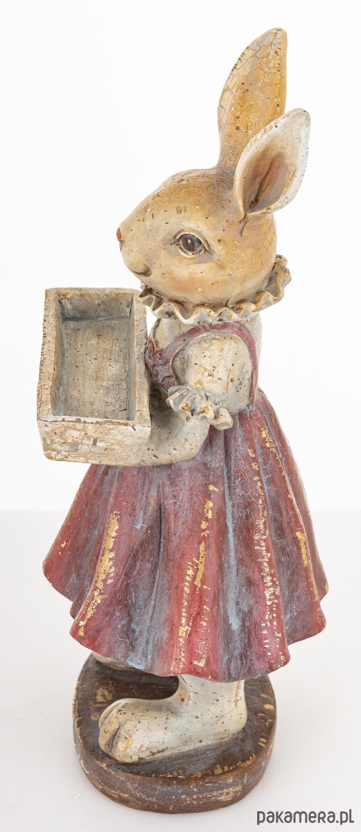 Urocza figurka eleganckiej króliczki wykonana z kolorowego tworzywa sztucznego jest trwała i łatwa w pielęgnacji. Dzięki zastosowaniu wysokiej jakości materiałów zachowuje swój kształt i kolor przez długi czas. To wyjątkowy element, który doda uroku każdemu wnętrzu. Króliczka ubrana w kolorową spódniczkę na szelkach, trzyma w łapkach skrzynkę na kwiaty. Stoi na ciemnym, okrągłym postumencie. Oryginalny wygląd figurki sprawia, że staje się doskonałą ozdobą zarówno w salonie jak i w pokoju dziecięcym.