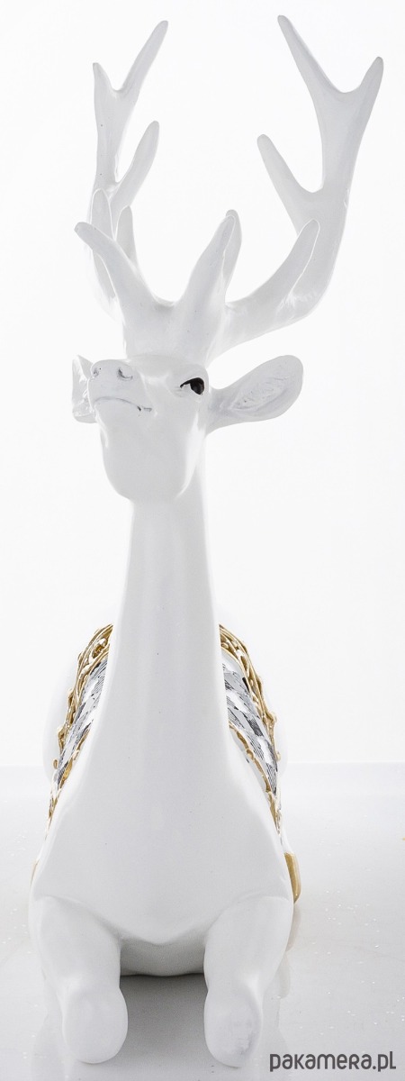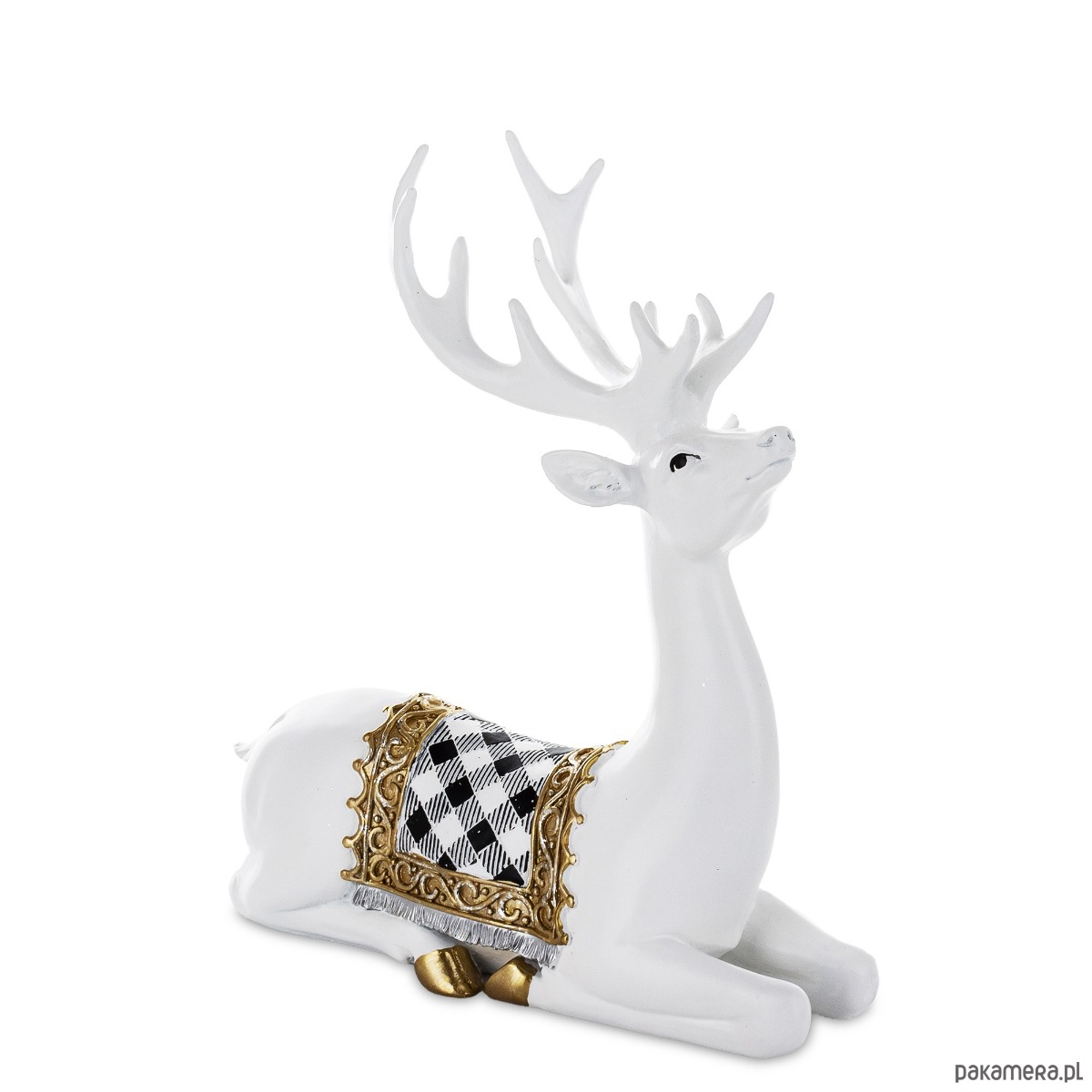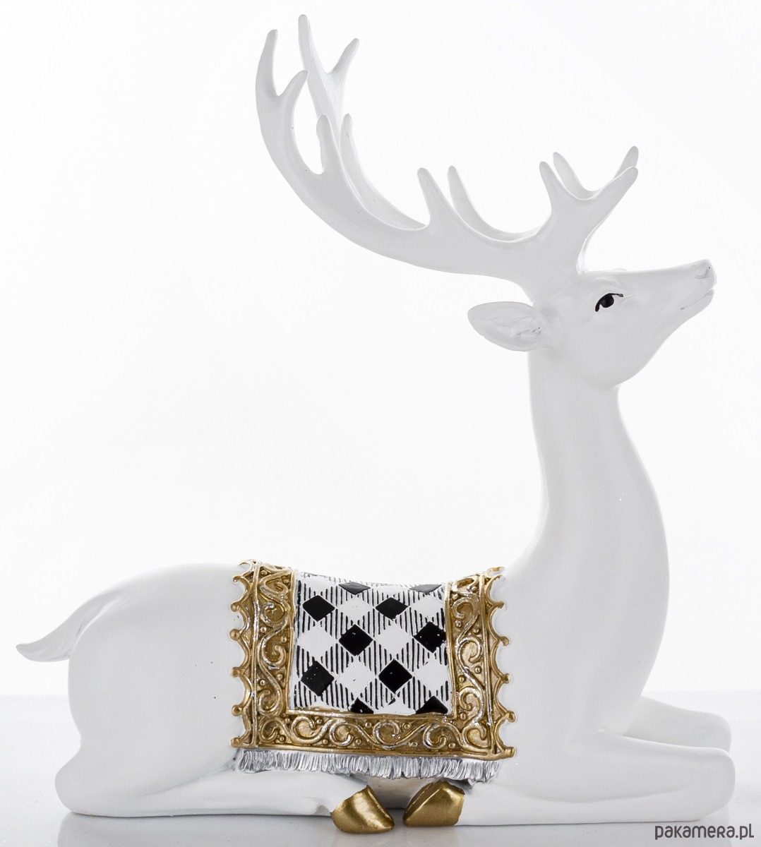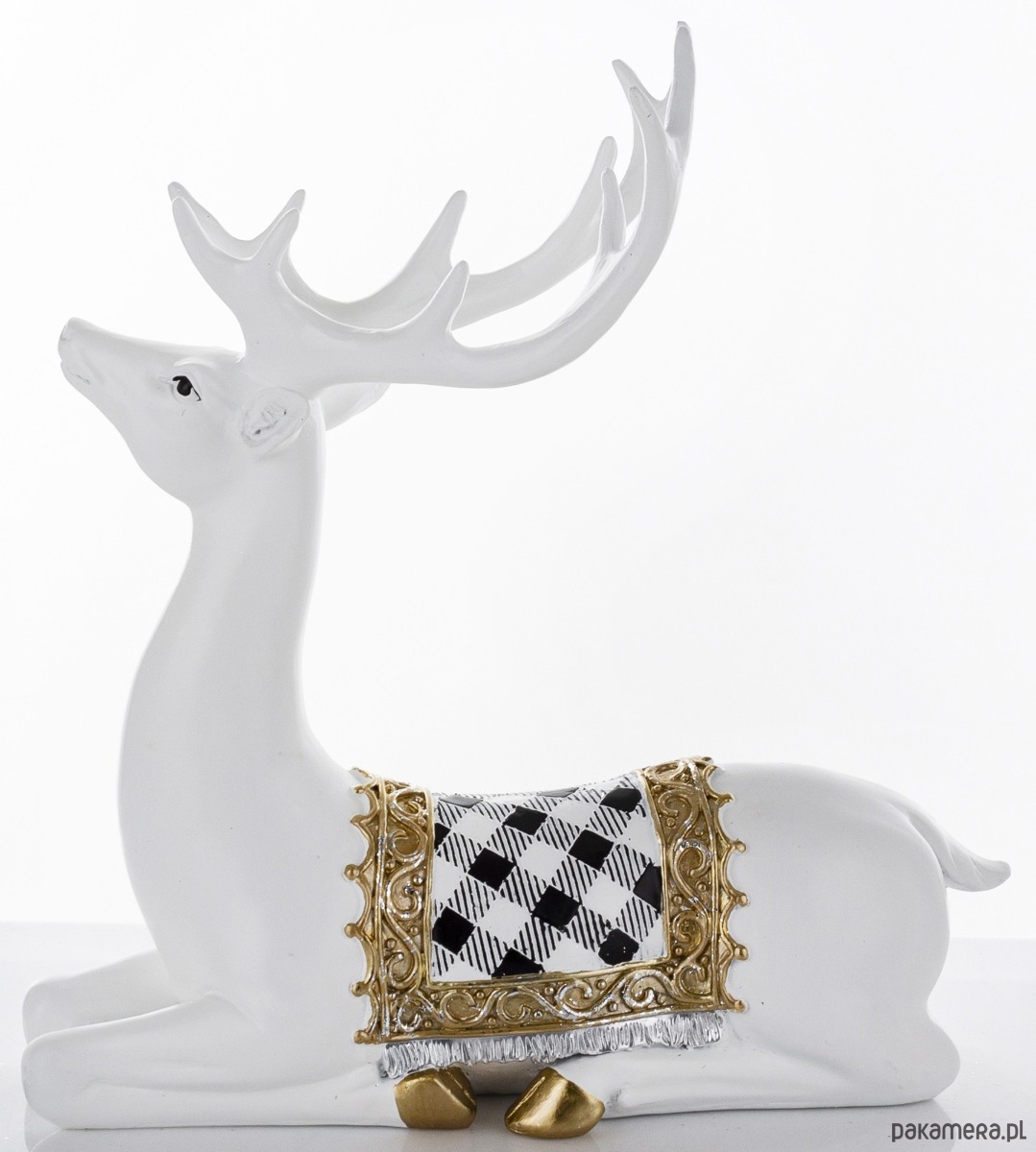 Piękna świąteczna dekoracja w postaci jelenia, która została wykonana z białego tworzywa sztucznego. Złote, błyszczące rogi nadają zwierzęciu elegancji i przyciągają wzrok. Na grzbiecie leży czaprak w czarno-biało-złotą szachownicę.