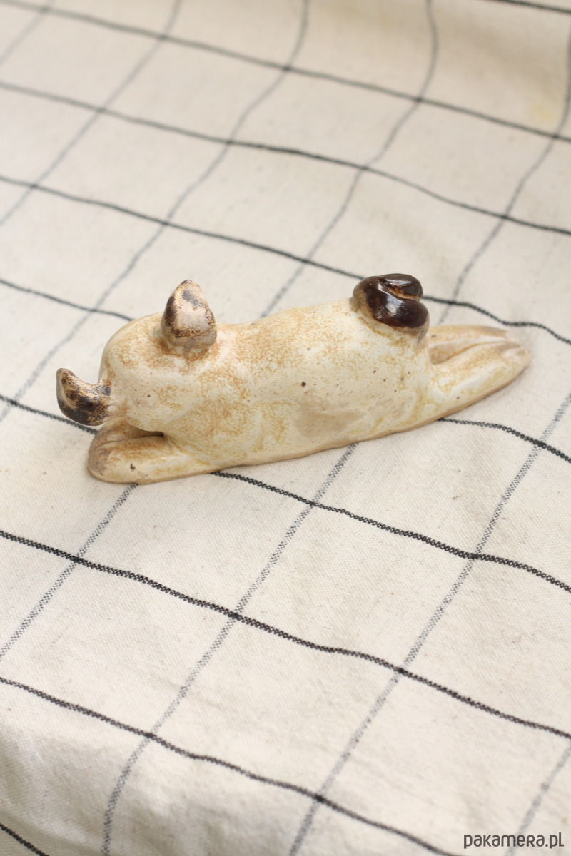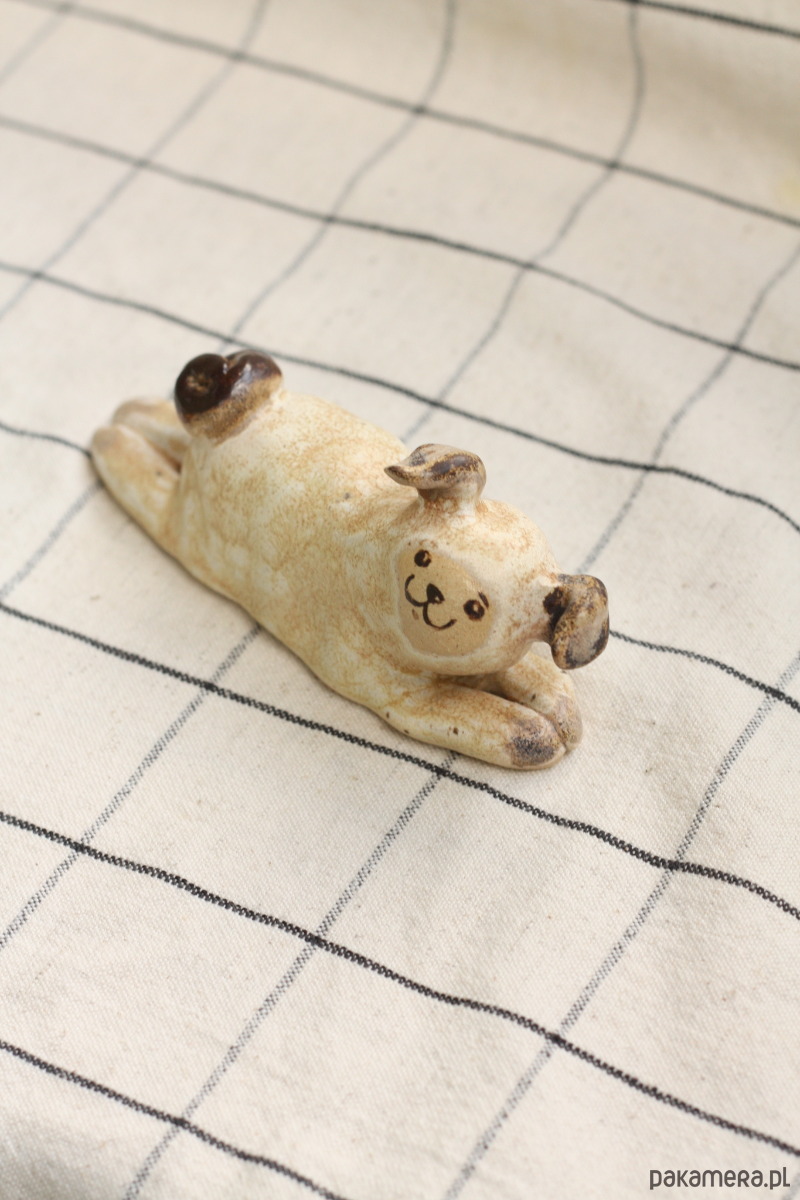 Zabawna figurka wylegującego się mopsa . Piesek wykonany jest ręcznie z gliny ceramicznej i poszkliwony. Świetny prezent dla właścicieli mopsów i miłośników piesków.