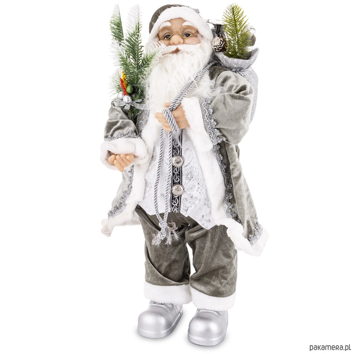 Dekoracja świąteczna w postaci Świętego Mikołaja. Figurkę wykonano z białego wytrzymałego tworzywa sztucznego, a szary ubiór został ozdobiony srebrnymi dodatkami. Zielone choinki, które Mikołaj trzyma w ręku urozmaicają postać świętego.
