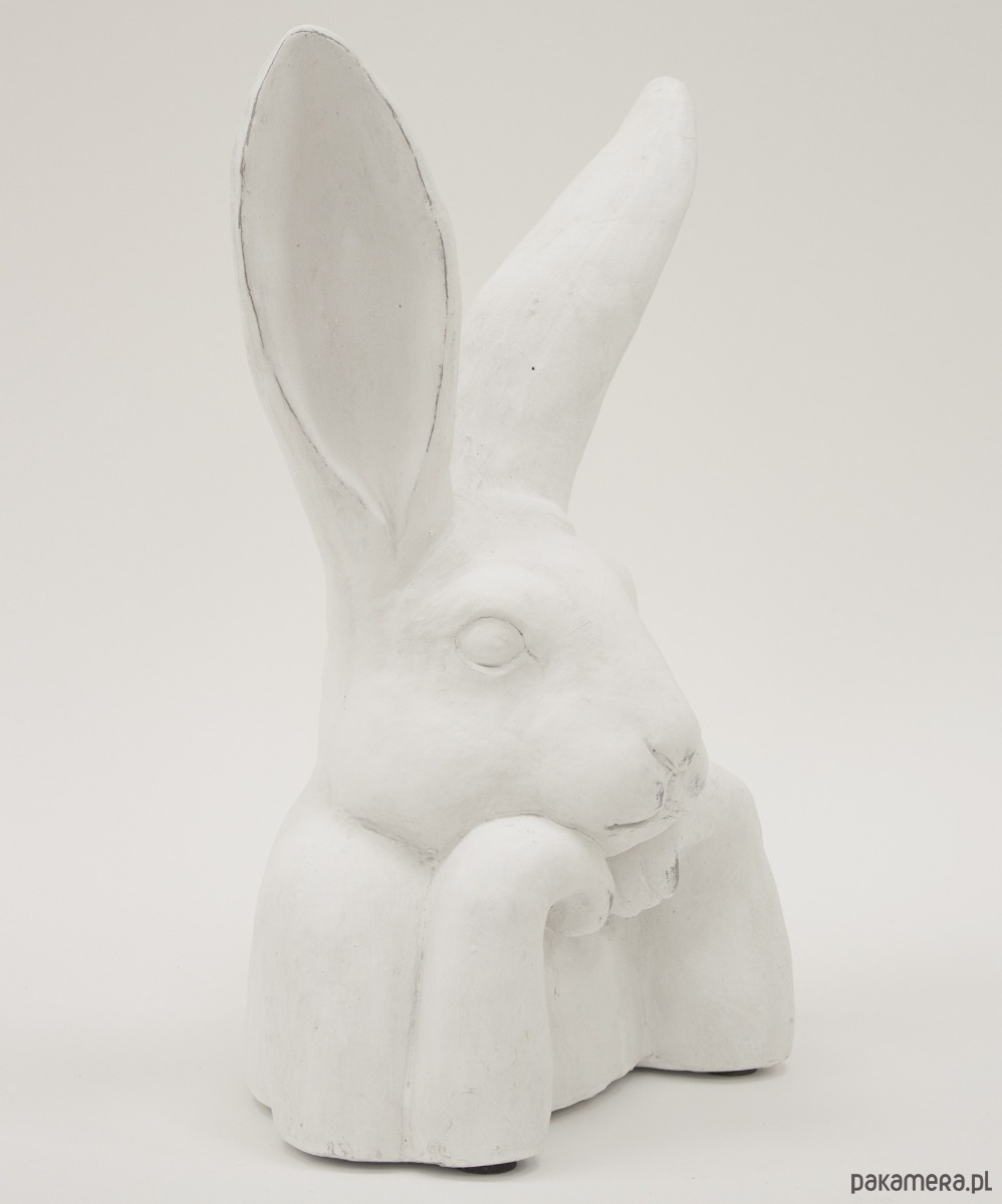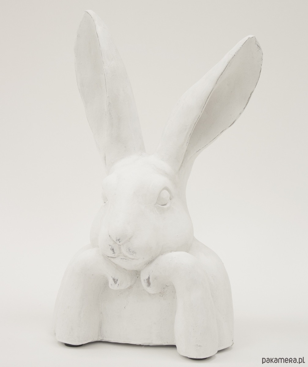 Figurka - popiersie przedstawiające zamyślonego królika. Produkt został wykonany z białego tworzywa sztucznego.