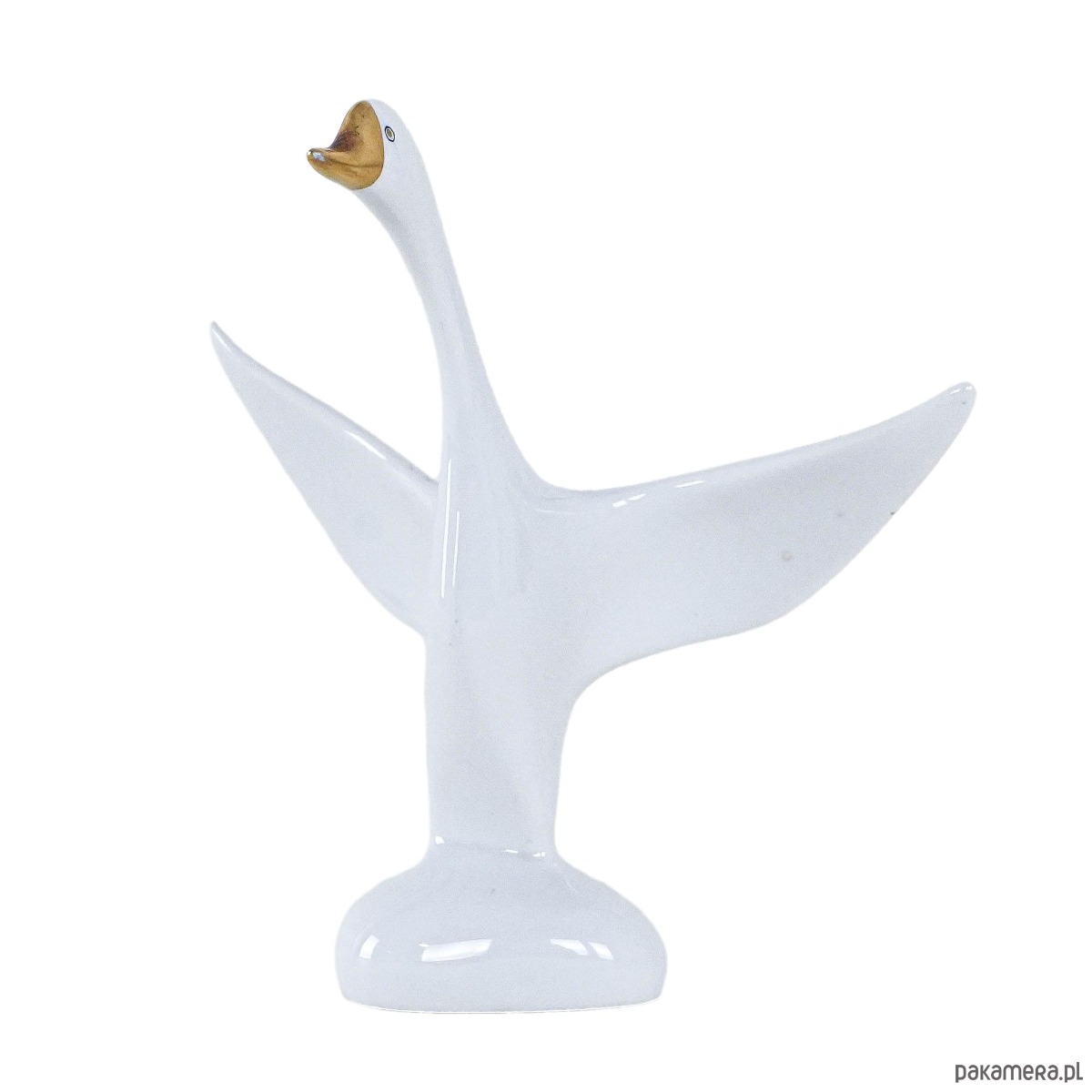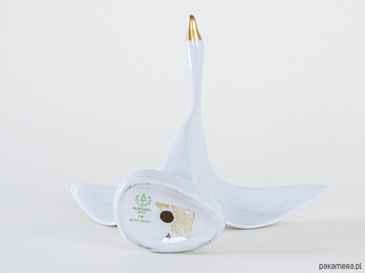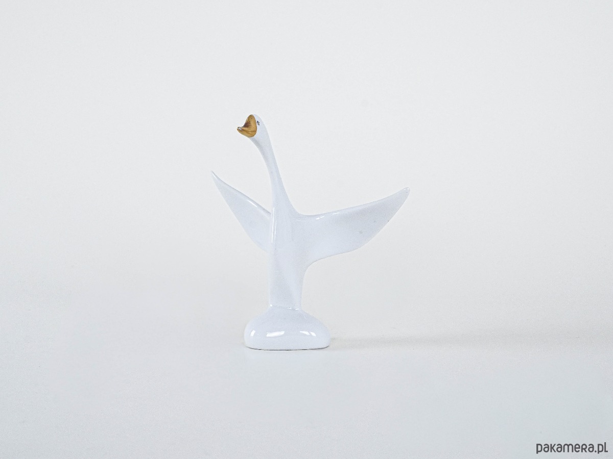 Rzeźbiarska figurka porcelanowego ptaka z rozpostartymi skrzydłami od Holloháza – klasyka węgierskiego designu z lat 60./70. Smukła sylwetka, złocony dziób i dynamiczna forma czynią z niej elegancki akcent w stylu mid-century modern.