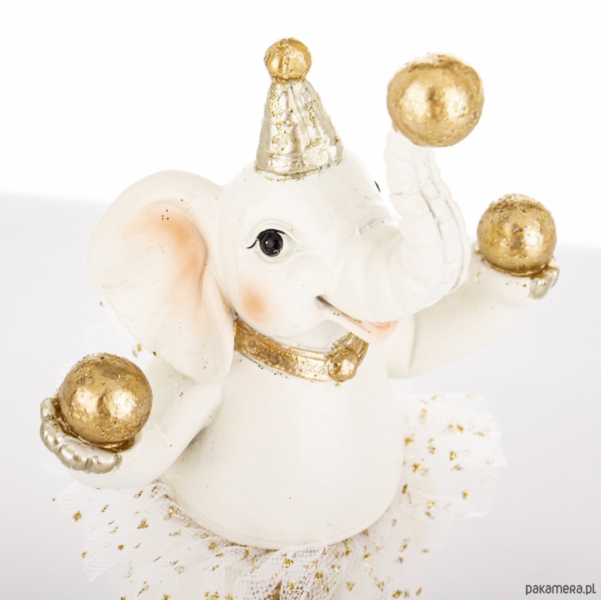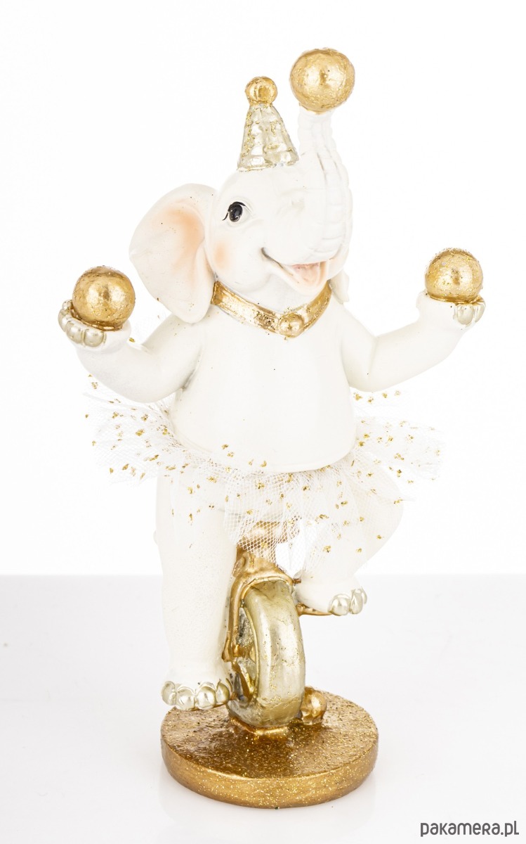 Wesoła dekoracja w postaci słonika na jednokołowym rowerku. Wykonana z białego tworzywa sztucznego. Ubrany w przezroczystą spódniczkę i złotą czapeczkę żongluje złotymi piłeczkami siedząc na monocyklu. Scenka cyrkowa.