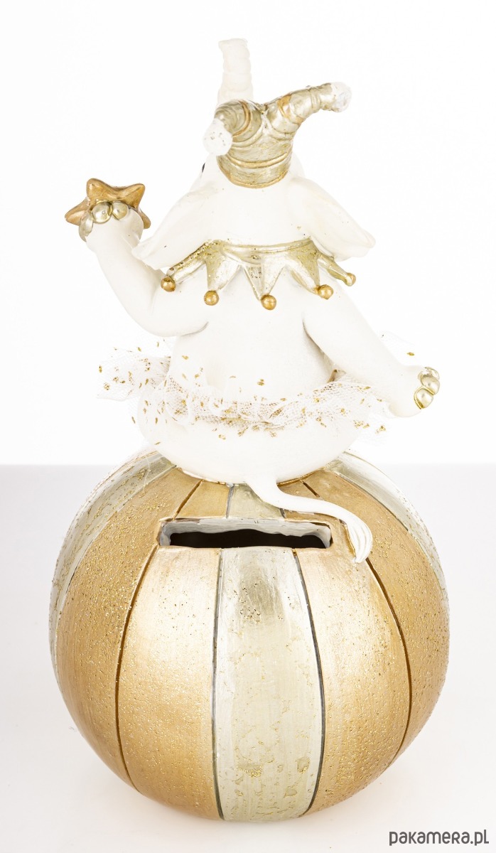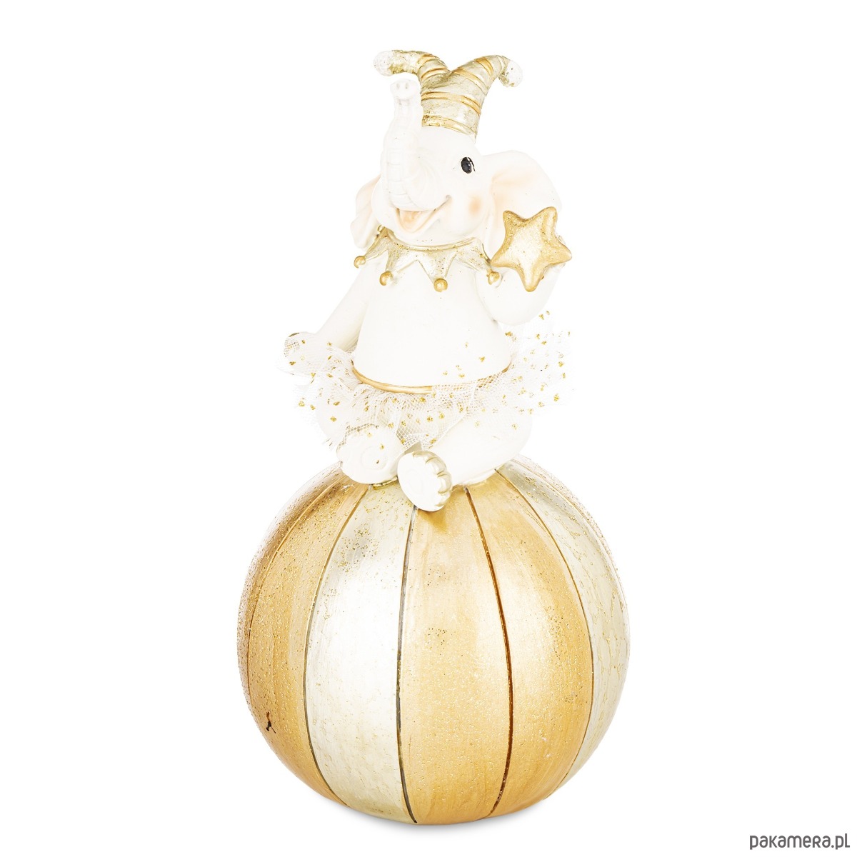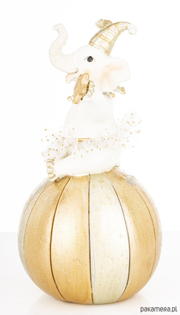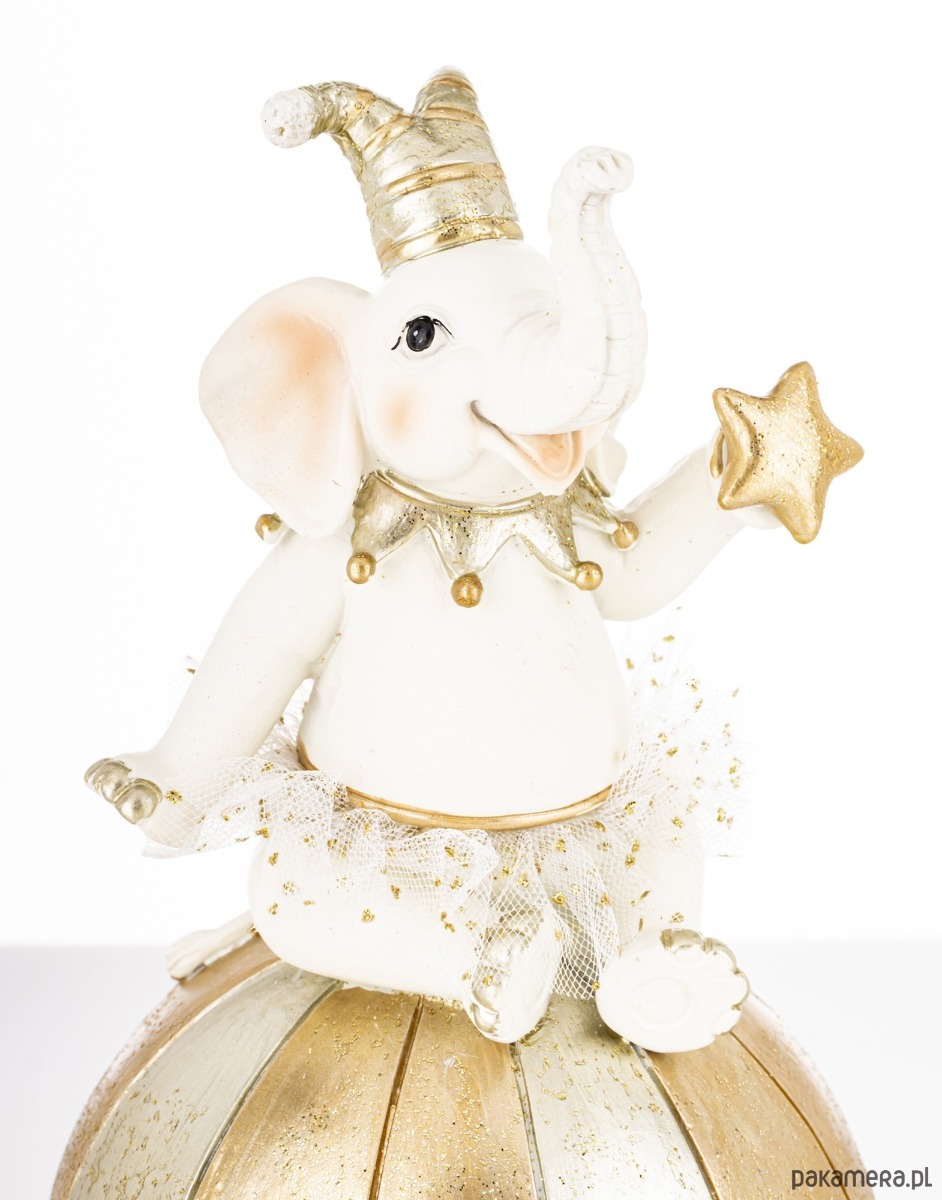 Wesoła dekoracja w postaci słonika na biało-złotej piłce. Figurka wykonana z białego tworzywa sztucznego. Ubrana w przezroczystą spódniczkę i złotą czapeczkę klauna siedzi na piłce. Scenka cyrkowa.
