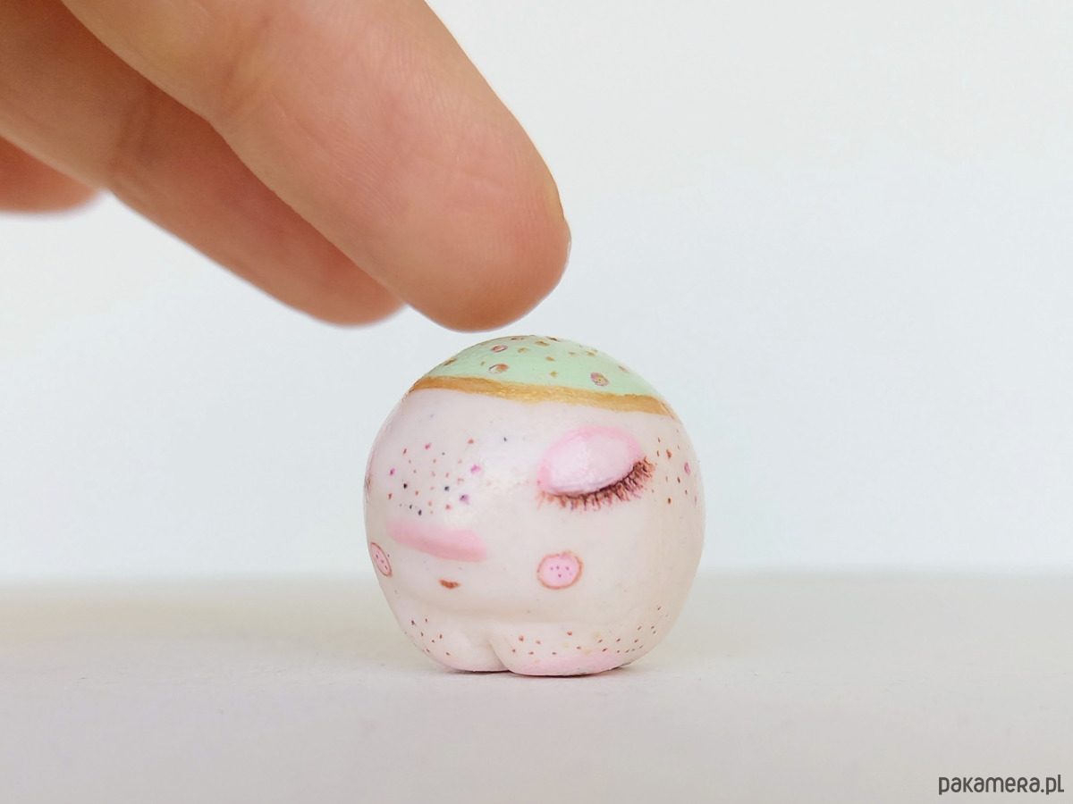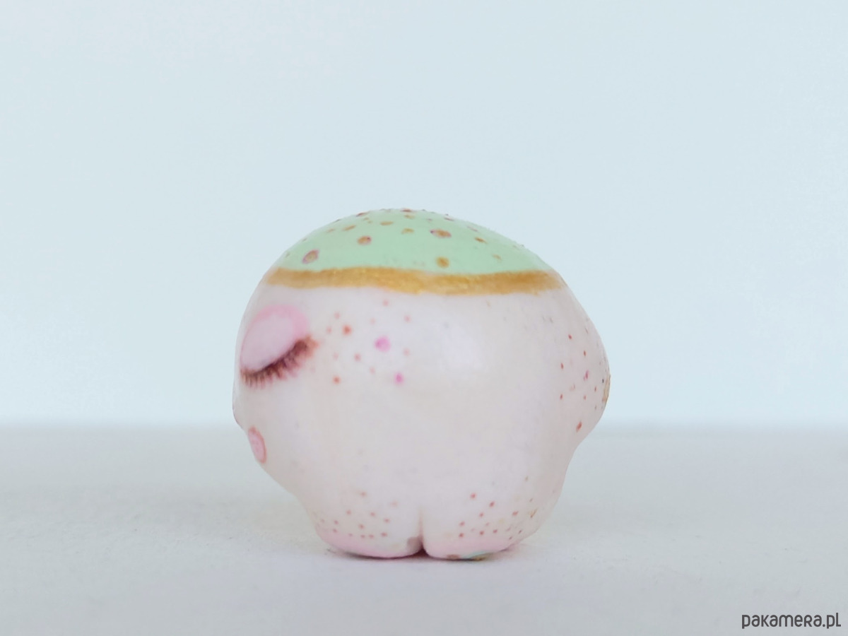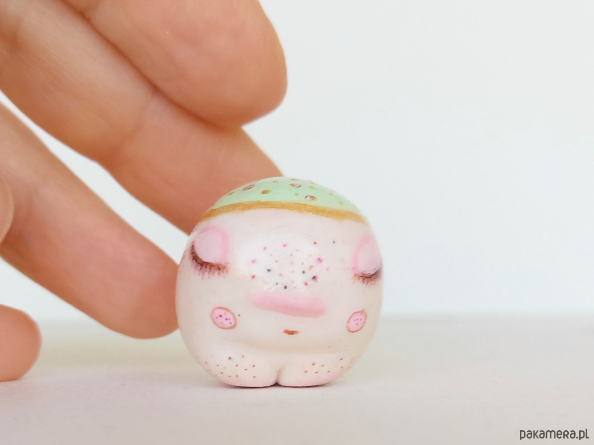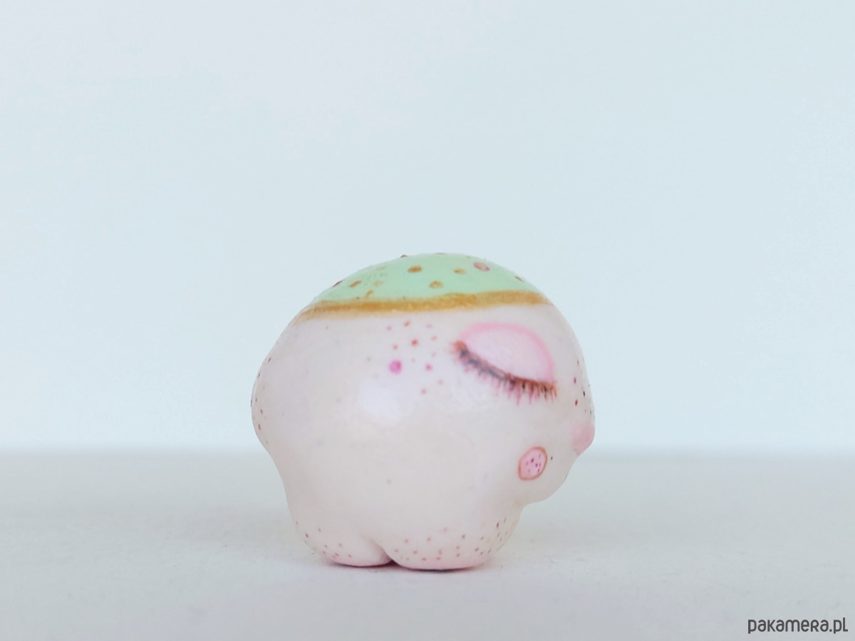Figurka przedstawiająca malutkiego, pastelowego stworka, została wykonana ręcznie z gliny polimerowej, malowana farbami akrylowymi oraz tuszem, następnie pokryta lakierem akrylowym.