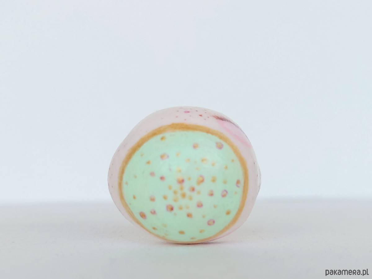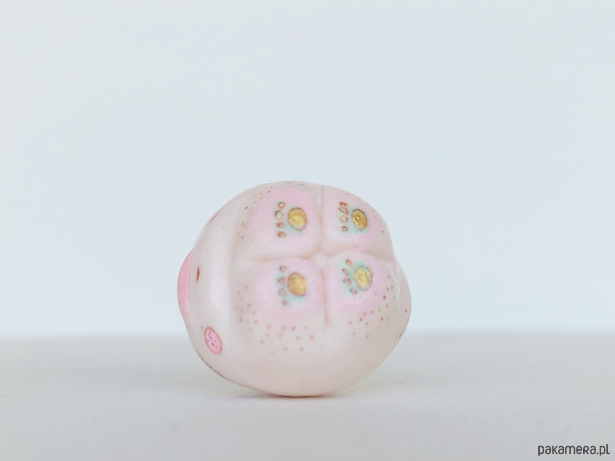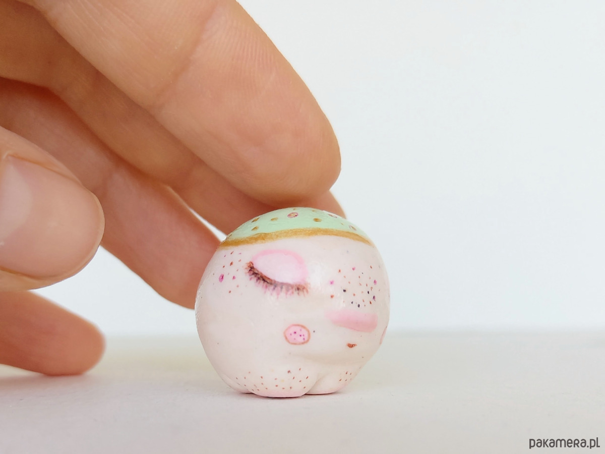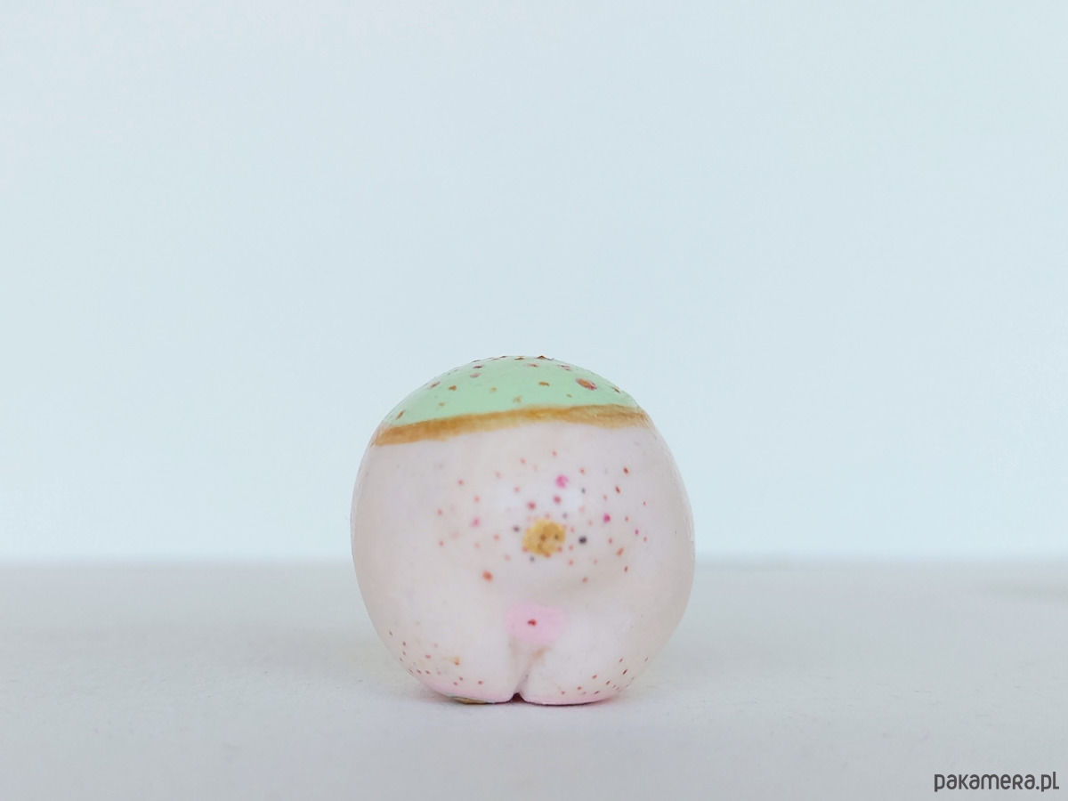 Figurka przedstawiająca malutkiego, pastelowego stworka, została wykonana ręcznie z gliny polimerowej, malowana farbami akrylowymi oraz tuszem, następnie pokryta lakierem akrylowym.