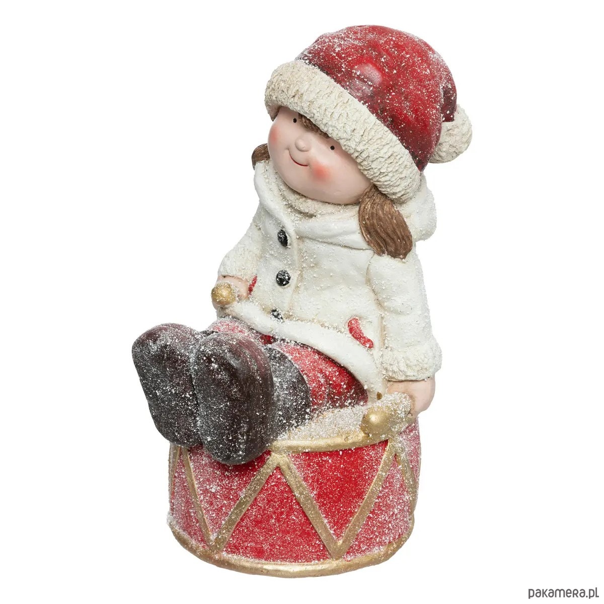 Bajkowa figurka świąteczna w postaci dziewczynki z bębenkiem. W stylu retro. Osypana brokatem i sztucznym śniegiem. Wykonana z magnezu.
