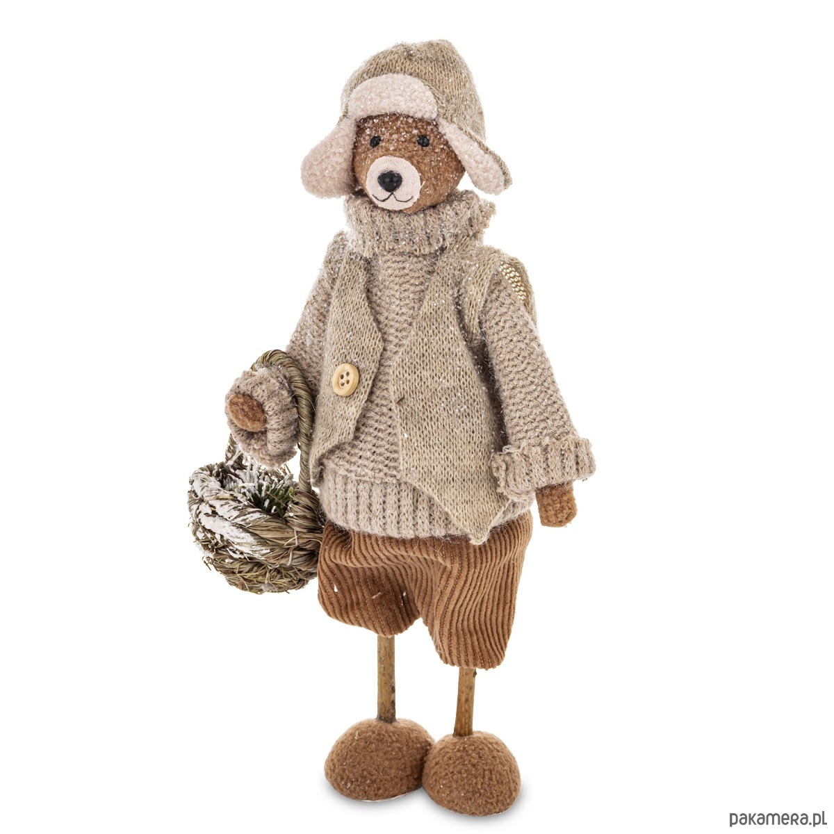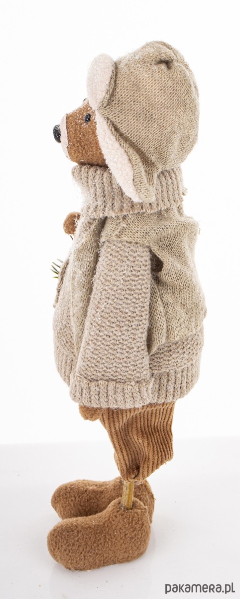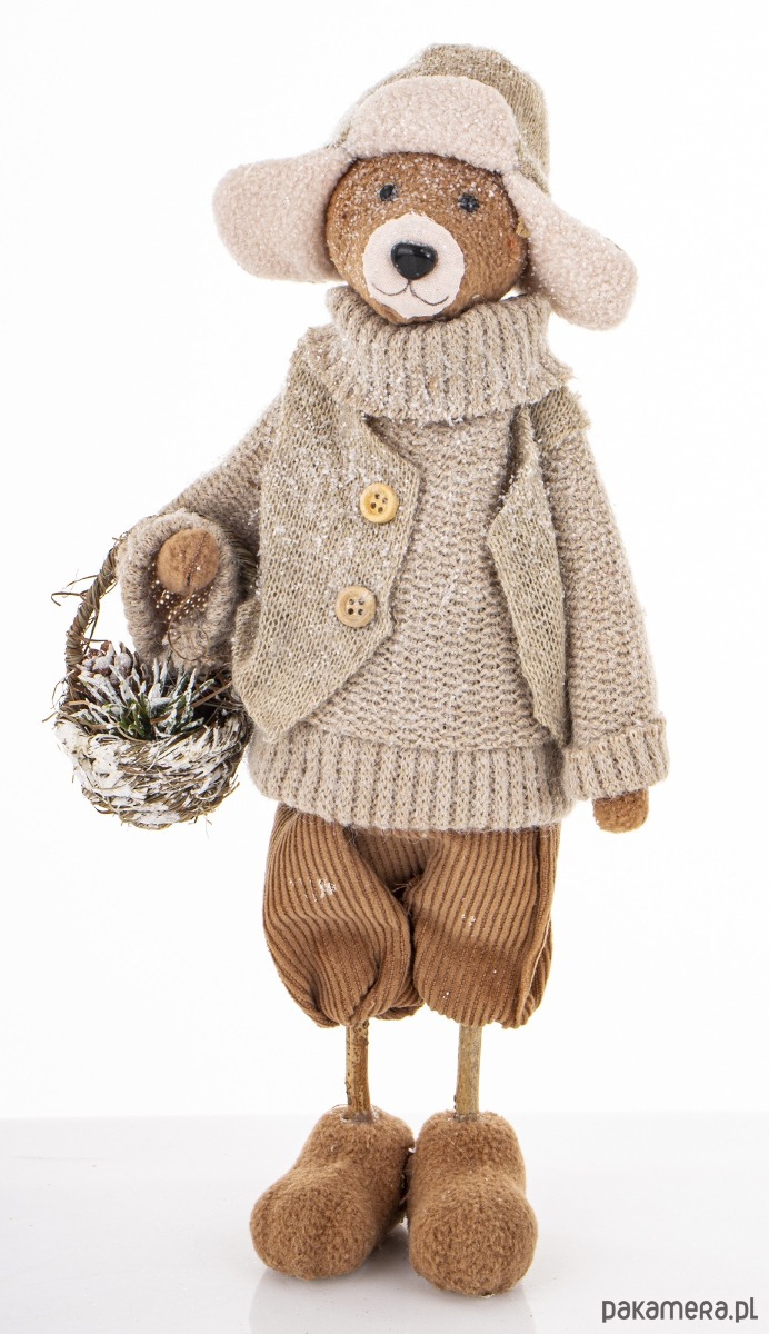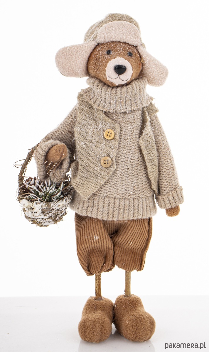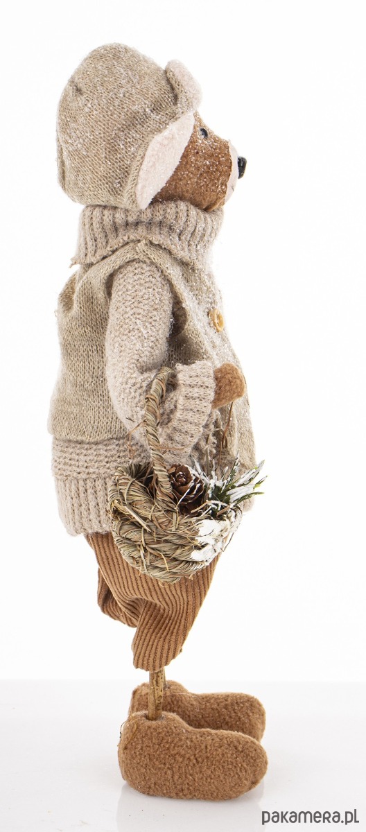 Urocza figurka wykonana z tkaniny w kolorze szarym i brązowym. Obszerny sweter, krótkie spodenki, czapka uszatka wzbudzają uczucie przyjaźni wobec miśka i wywołują uśmiech na twarzy patrzących. Figurka trzyma w ręku koszyk.