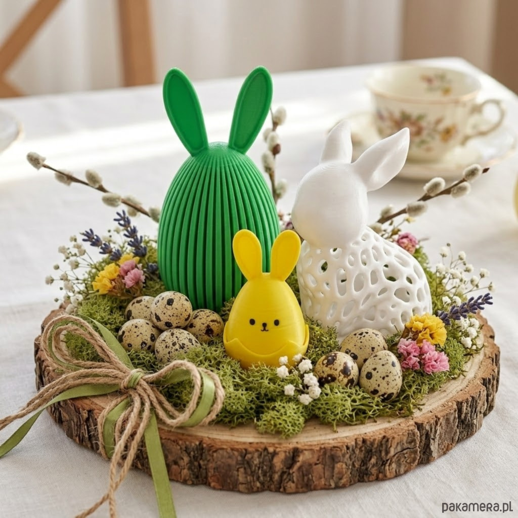 Figurki Wielkanocne 3D do Koszyczka Stroika ZESTAW 3SZT Dekoracje Stojące Uroczy zestaw trzech wielkanocnych figurek wykonanych przy użyciu technologii druku 3D. Każda figurka ma inny rozmiar oraz delikatnie zróżnicowany kształt, dzięki czemu całość tworzy spójną, a jednocześnie ciekawą dekorację. To idealny komplet, który doda świątecznego uroku każdemu wnętrzu.Figurki świetnie prezentują się razem jako zestaw, ale równie dobrze sprawdzą się ustawione osobno – w koszyczku, na stole czy półce.
