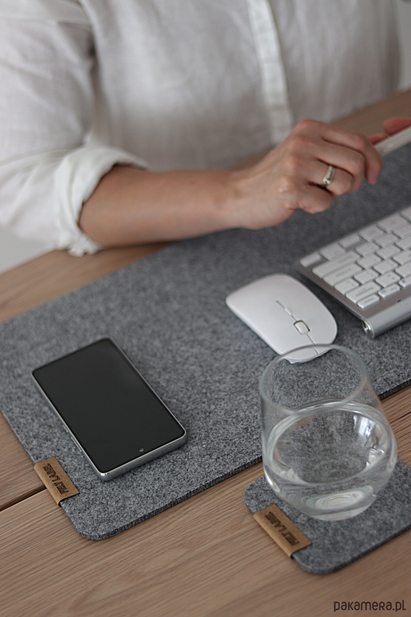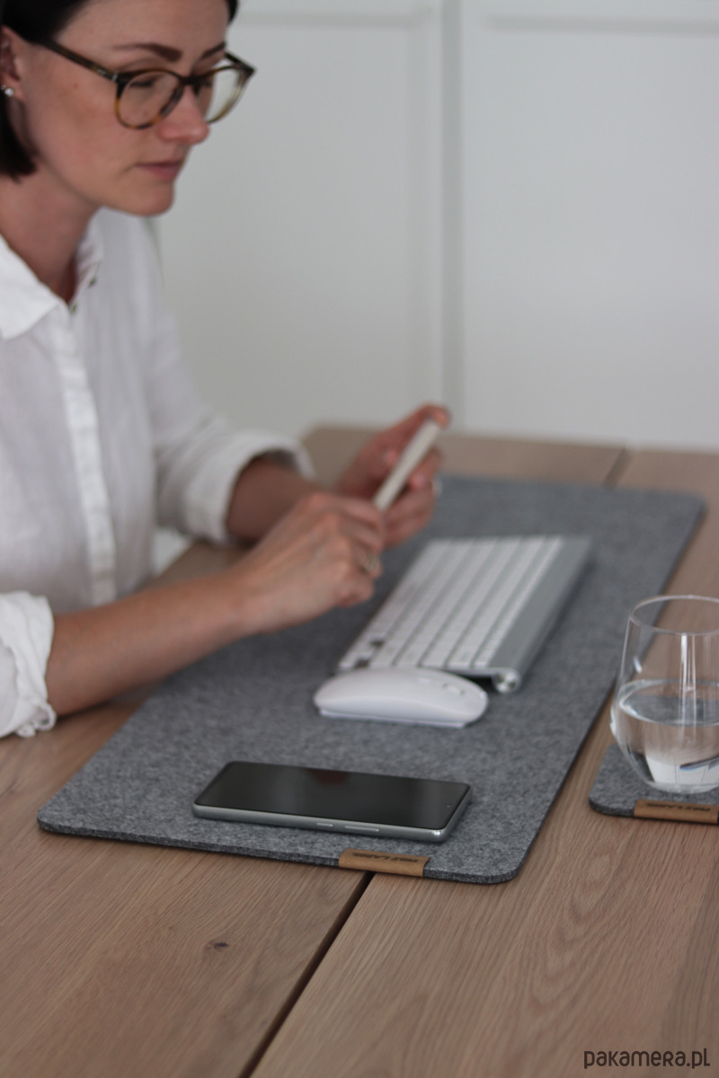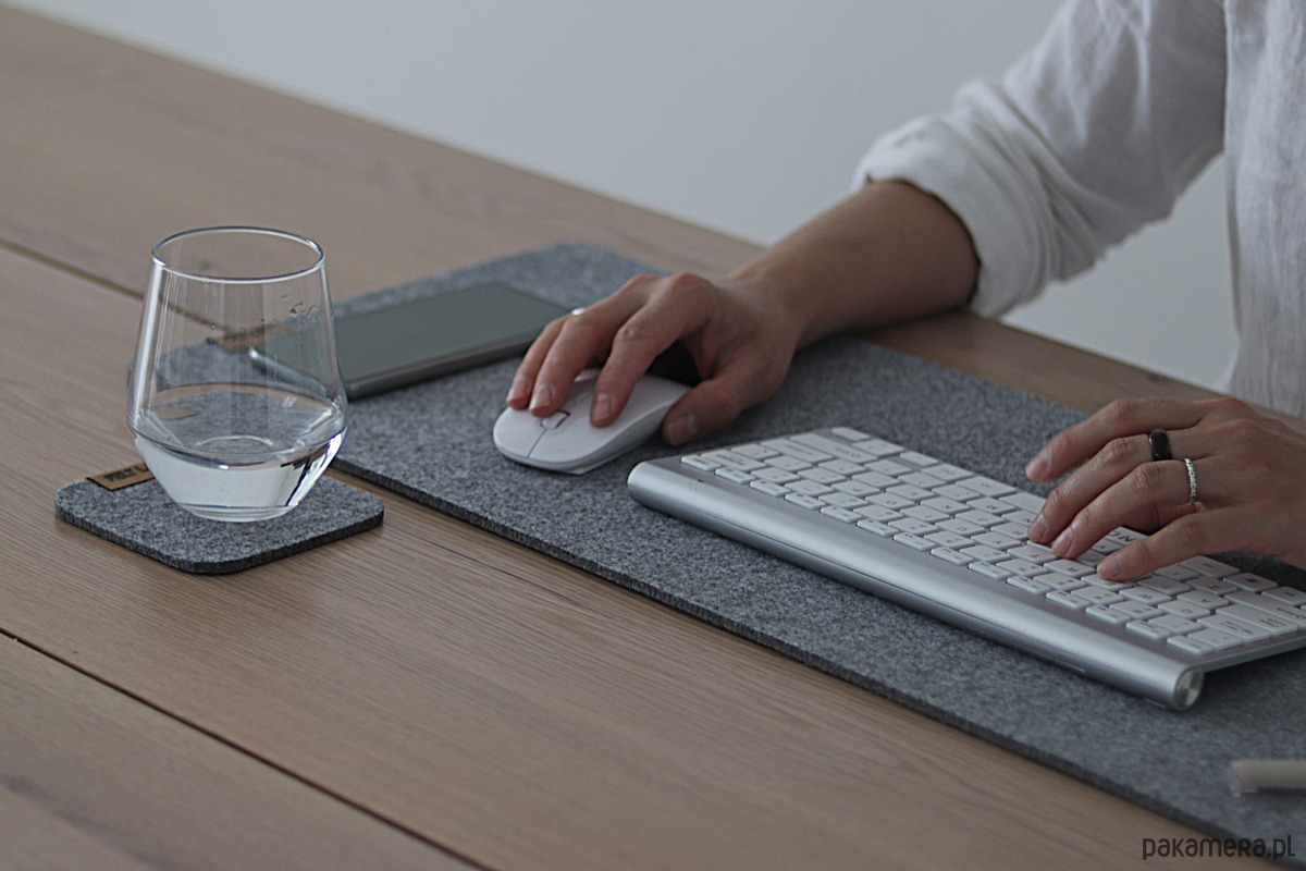 Filcowa podkładka pod klawiaturę i myszkę o wymiarach 90 cm na 30 cm wykonana ze sztywnego filcu syntetycznego o grubości 4 mm. Od spodu na każdym narożniku naklejone sylikonowe naklejki zmniejszające przesuwanie. Przystosowana do pracy z myszkami laserowymi.