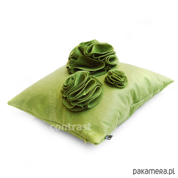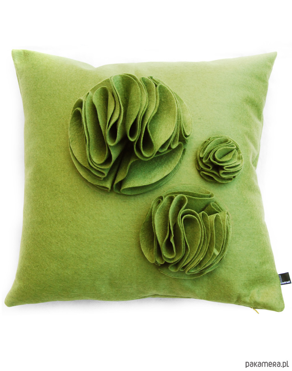 Elementem dekoracyjnym poszewki są 3 filcowe bąble - kwiatki, o różnej wielkości. Bardzo efektowny akcent we wnętrzu. Idealny produkt na udekorowanie kanapy.