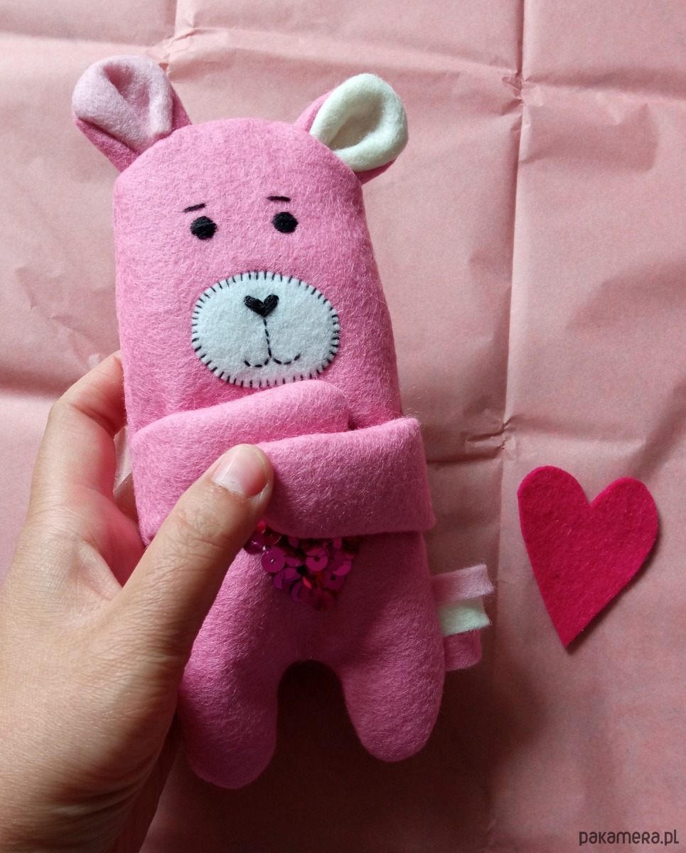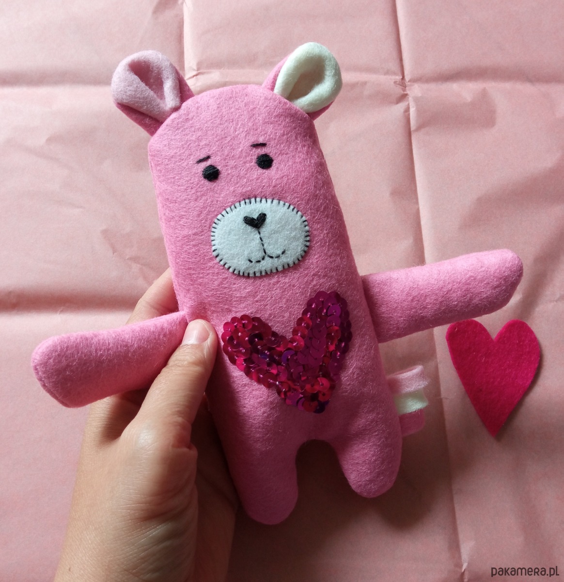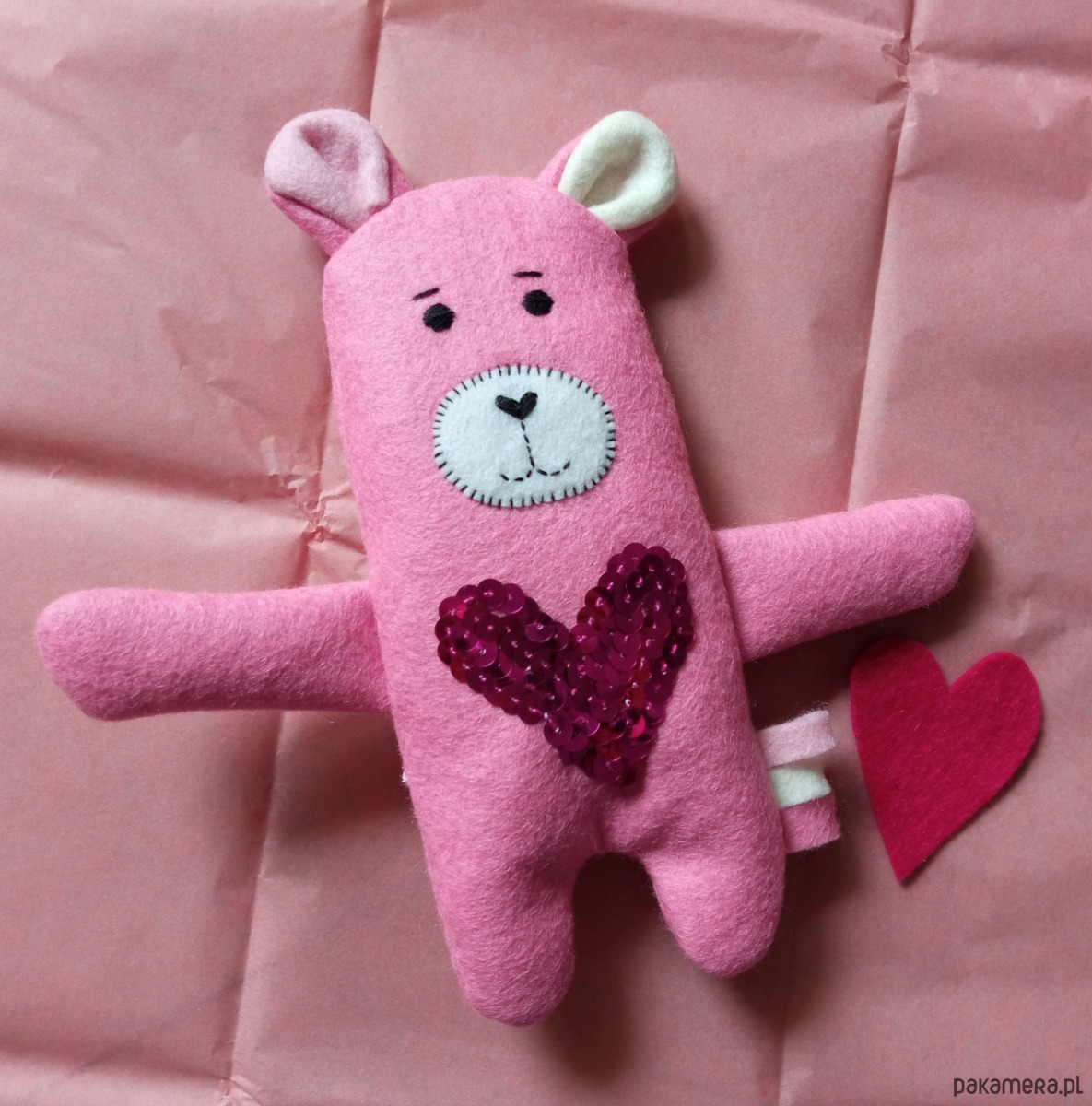 Filcowy Misio z cekinowym, różowym brzuszkiem w kształcie serduszka.