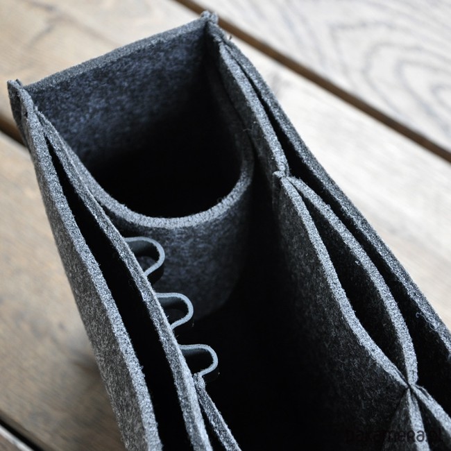 Organizer do torebki to znakomite rozwiązanie na pozbycie się bałaganu w tej części naszej garderoby. Uszyliśmy go z wysokiej jakości filcu w 100% poliestrowego, specjalnie zabezpieczonego przed mechaceniem się. W środku znajdziemy 5 wygodnych i praktycznych kieszeni. Dwie największe boczne. Na jednej z nich kieszeń na telefon i uchwyty na długopisy. Na drugiej naszyta mniejsza przedzielona na dwie mniejsze kieszonki. Jest tu również przegroda na butelkę wody. Istnieje oczywiście możliwość zamówienia organizera do torebki o innych wymiarach.