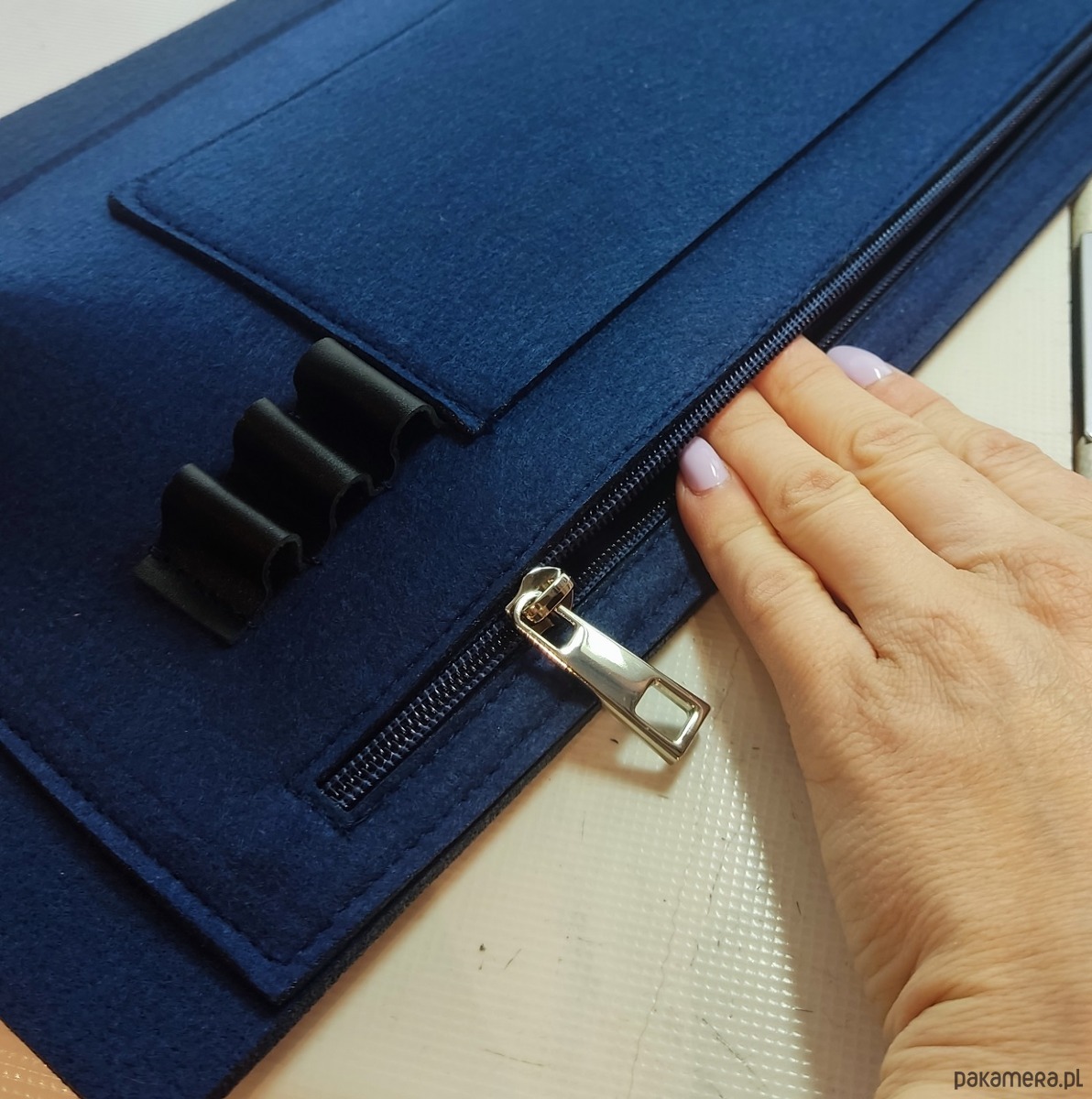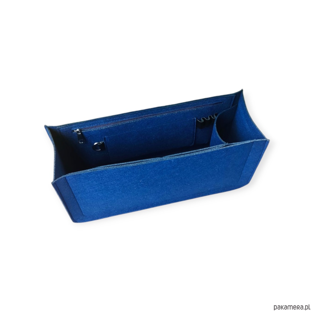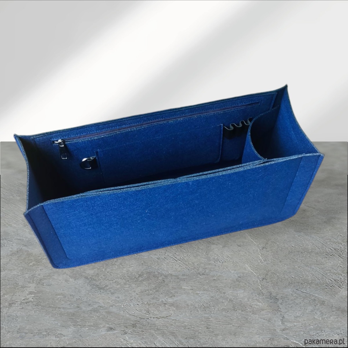 Stylowy i praktyczny organizer z filcu w kolorze granatu.