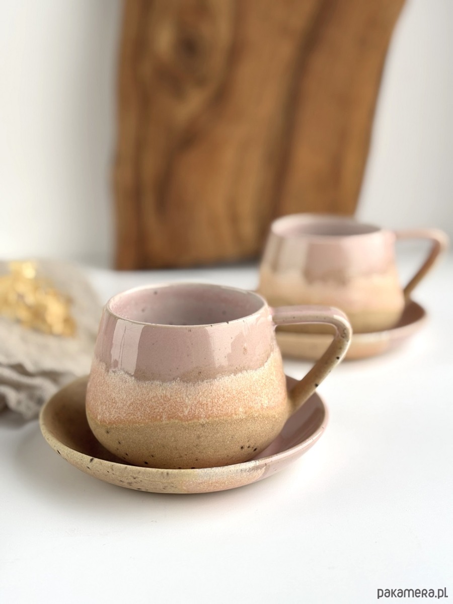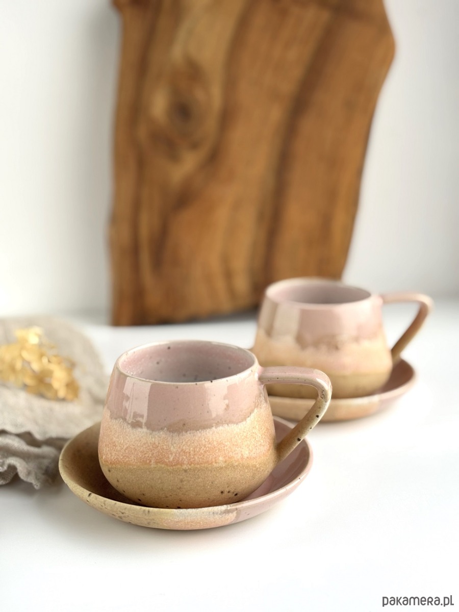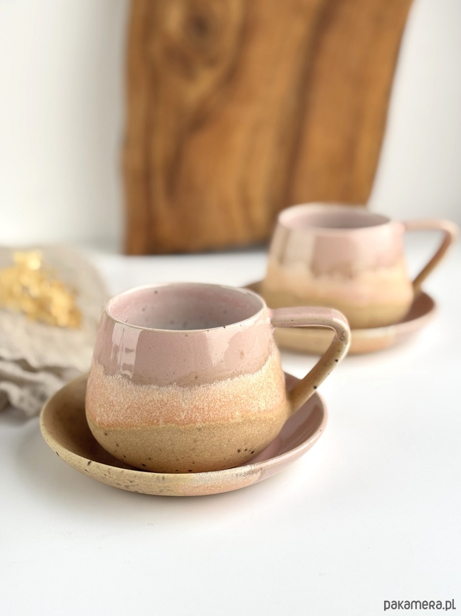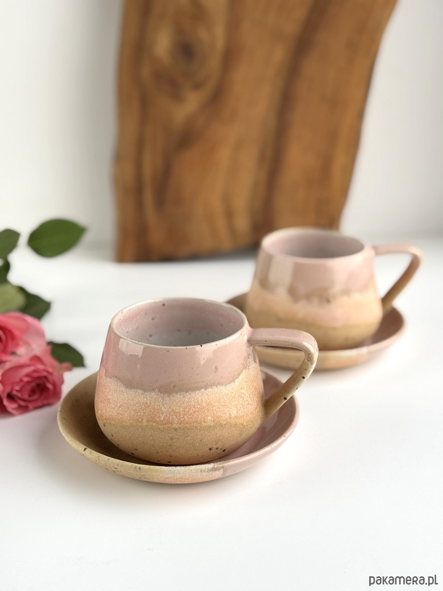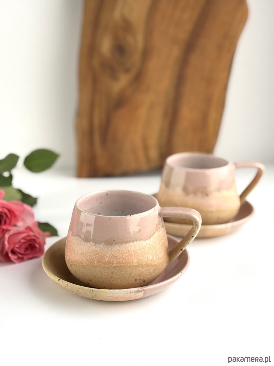 Ręcznie robiony kubek / filiżanka ceramiczna beczułka ze spodeczkiem - Różowe migdały z sercem