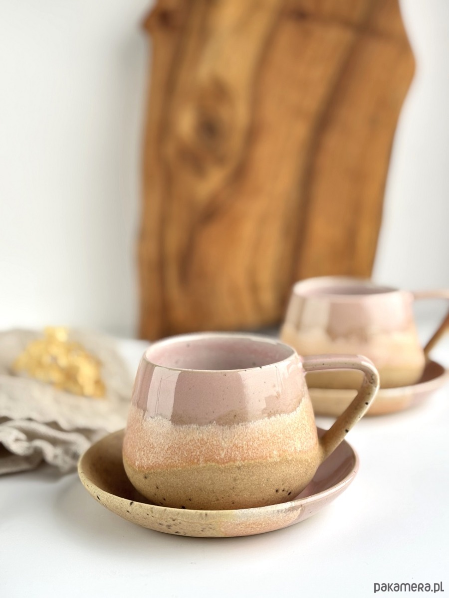 Ręcznie robiony kubek / filiżanka ceramiczna beczułka ze spodeczkiem - Różowe migdały