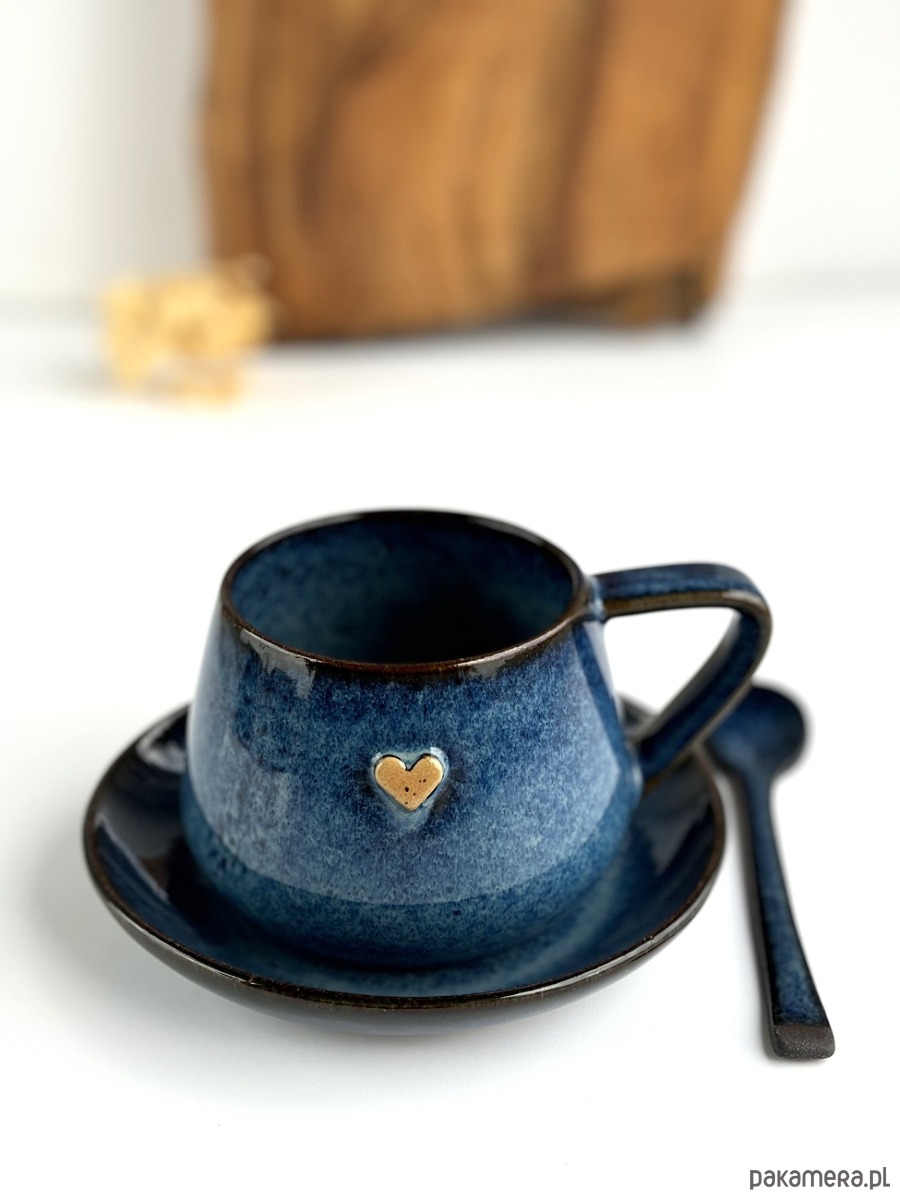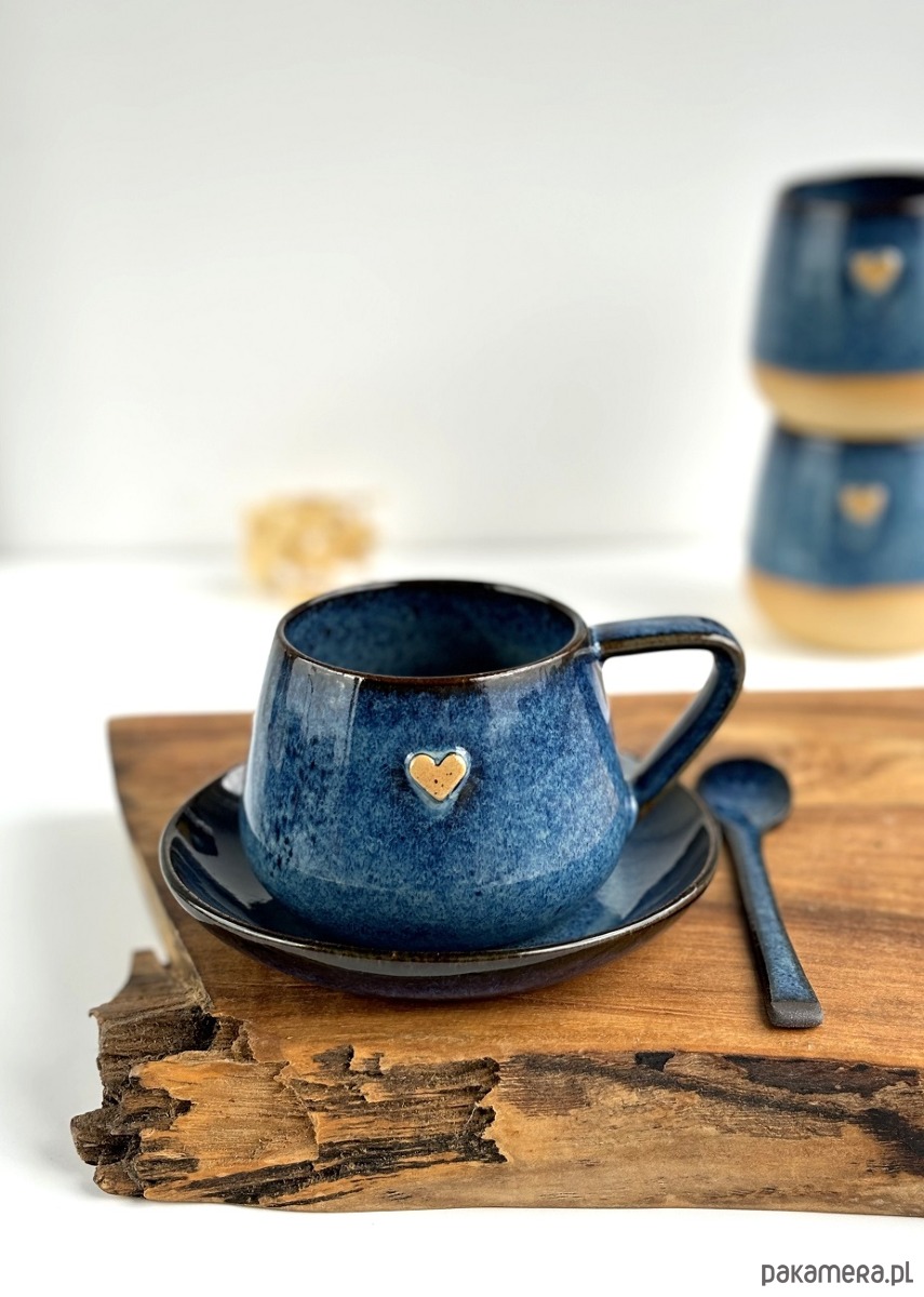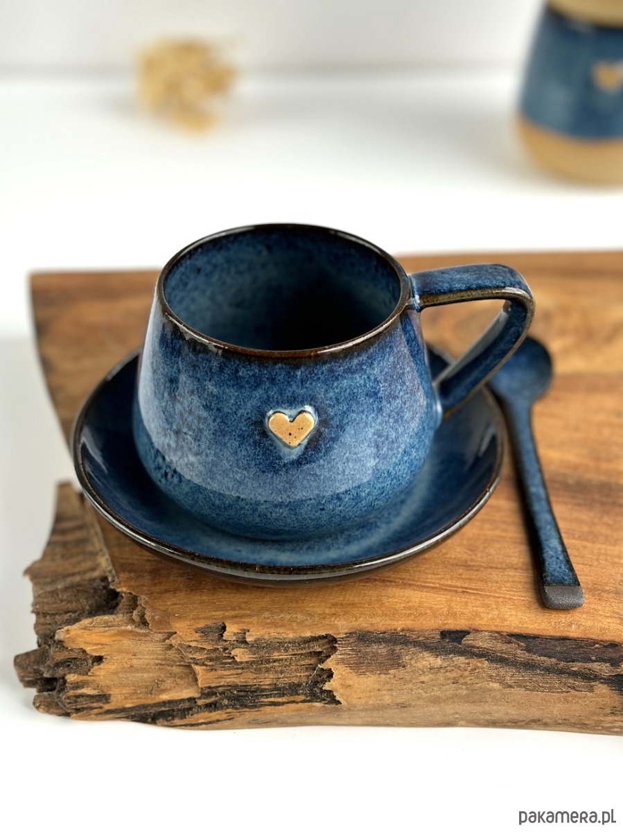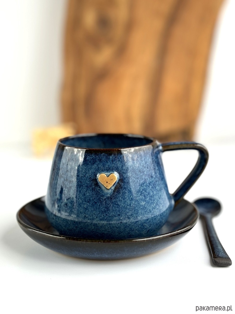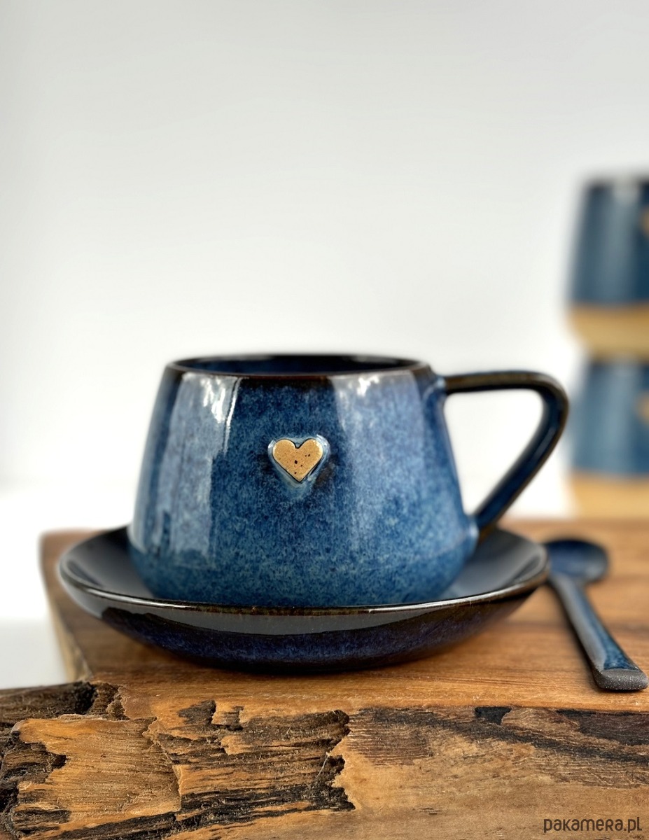 Ręcznie robiona filiżanka ceramiczna ze spodkiem beczułka granatowa z sercem.