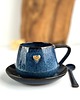 Ręcznie robiona filiżanka ceramiczna ze spodkiem beczułka granatowa z sercem.