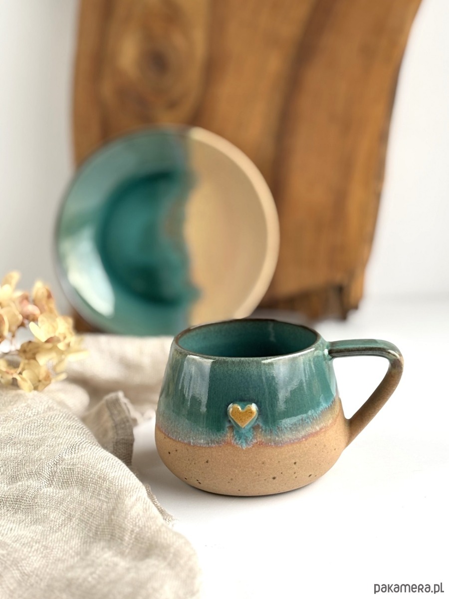 Ręcznie robiony kubek / filiżanka ceramiczna beczułka ze spodeczkiem - Rajska plaża z sercem
