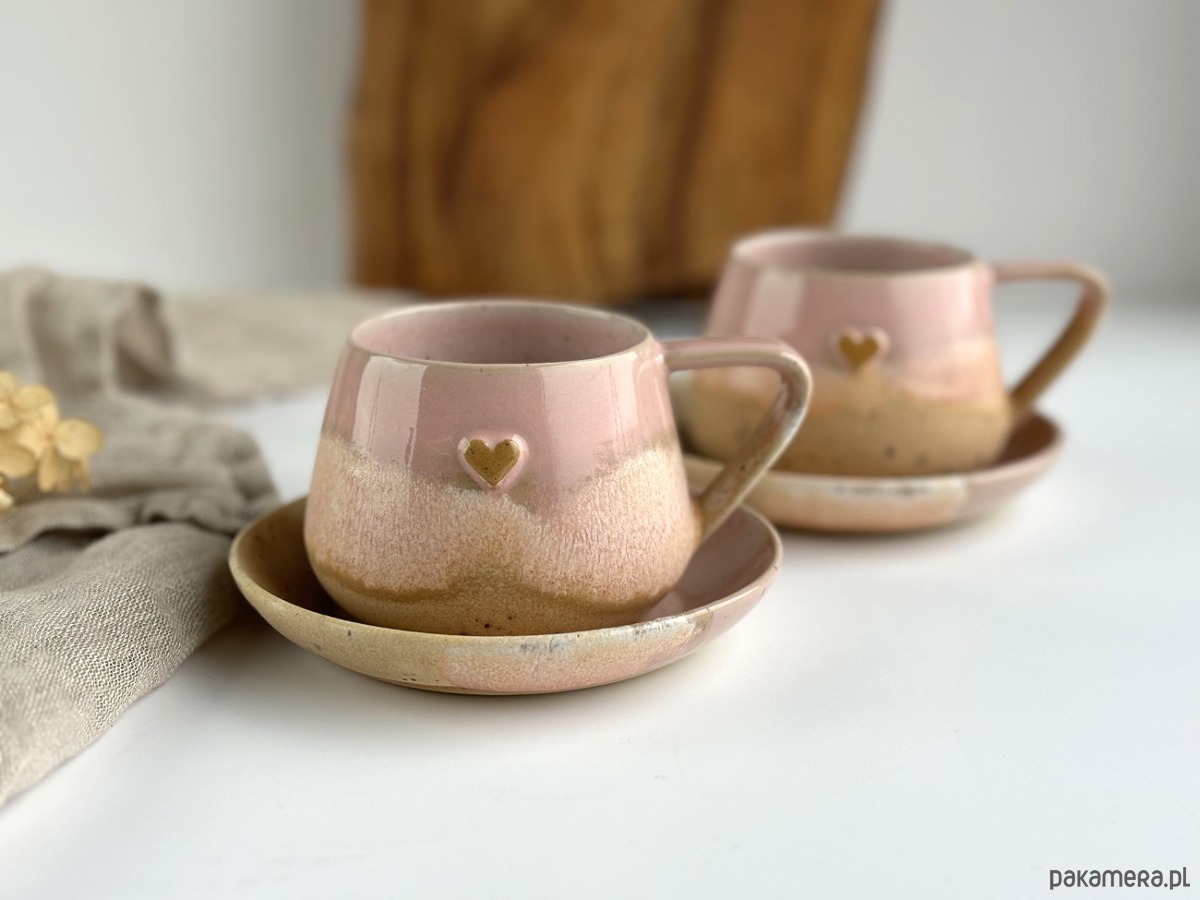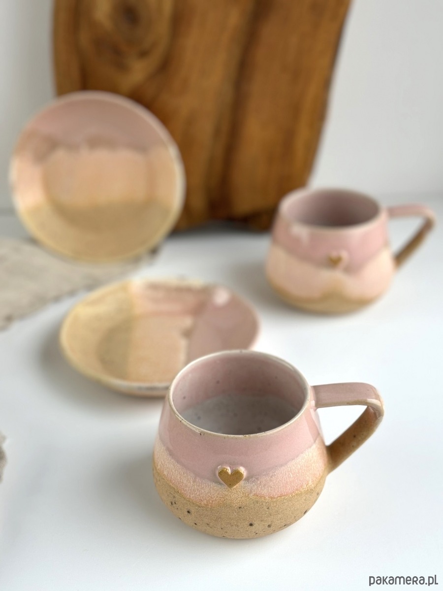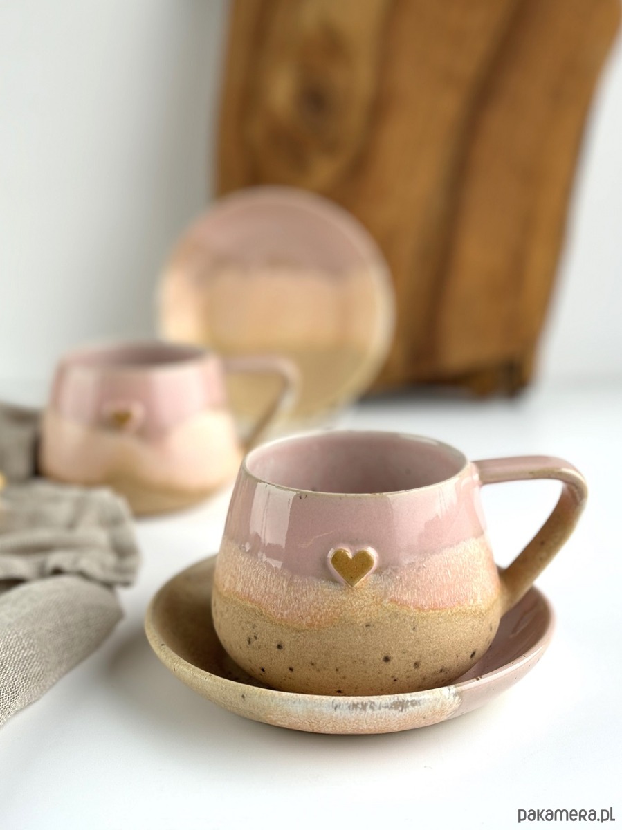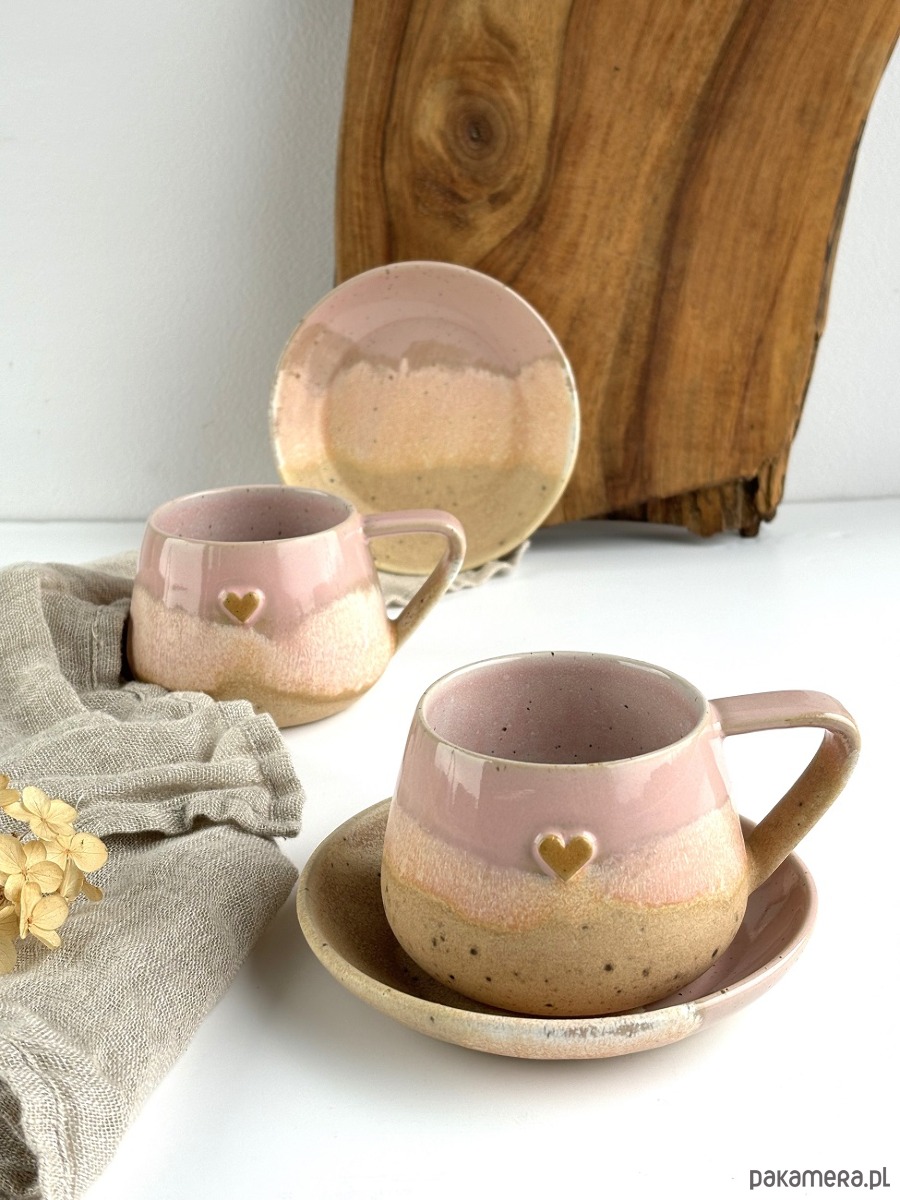 Ręcznie robiony kubek / filiżanka ceramiczna beczułka ze spodeczkiem - Różowe migdały z sercem