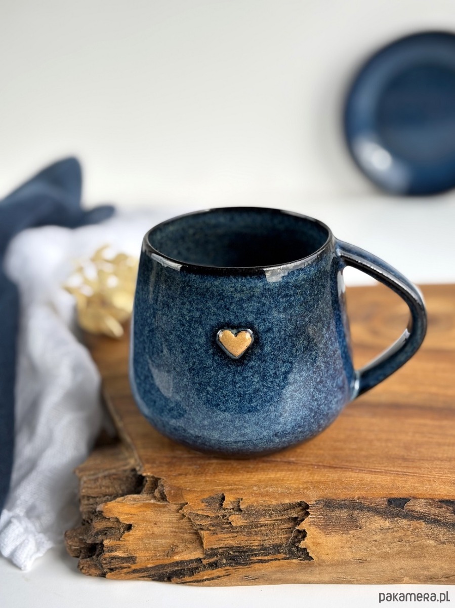 Ręcznie robiony kubek ceramiczny beczułka 320 ml granatowy z sercem z kolekcji Nocne Niebo.