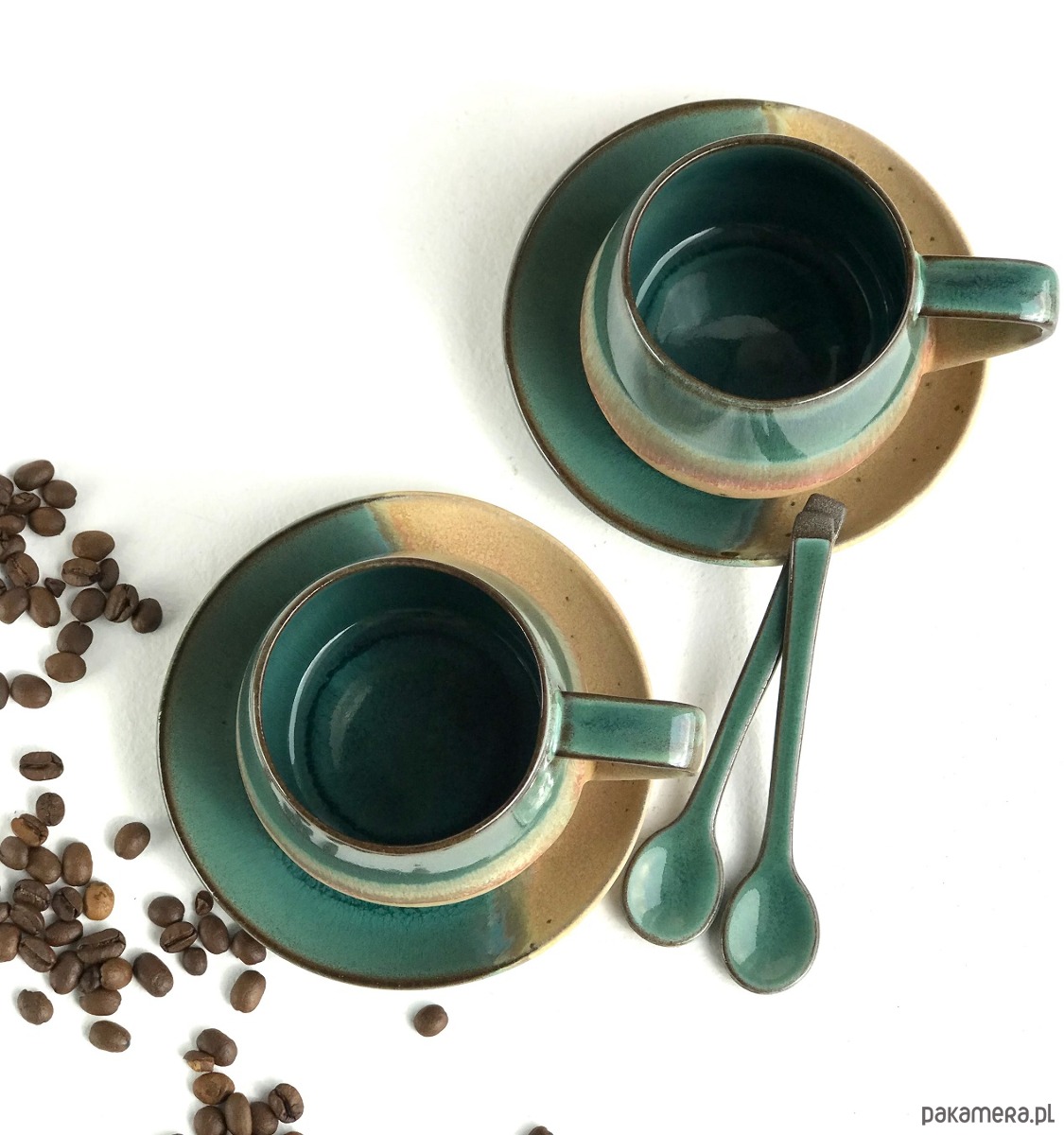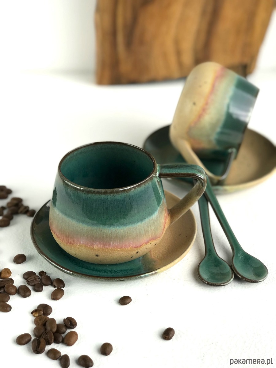 Ręcznie robiona filiżanka ceramiczna ze spodeczkiem z kolekcji Rajska Plaża.