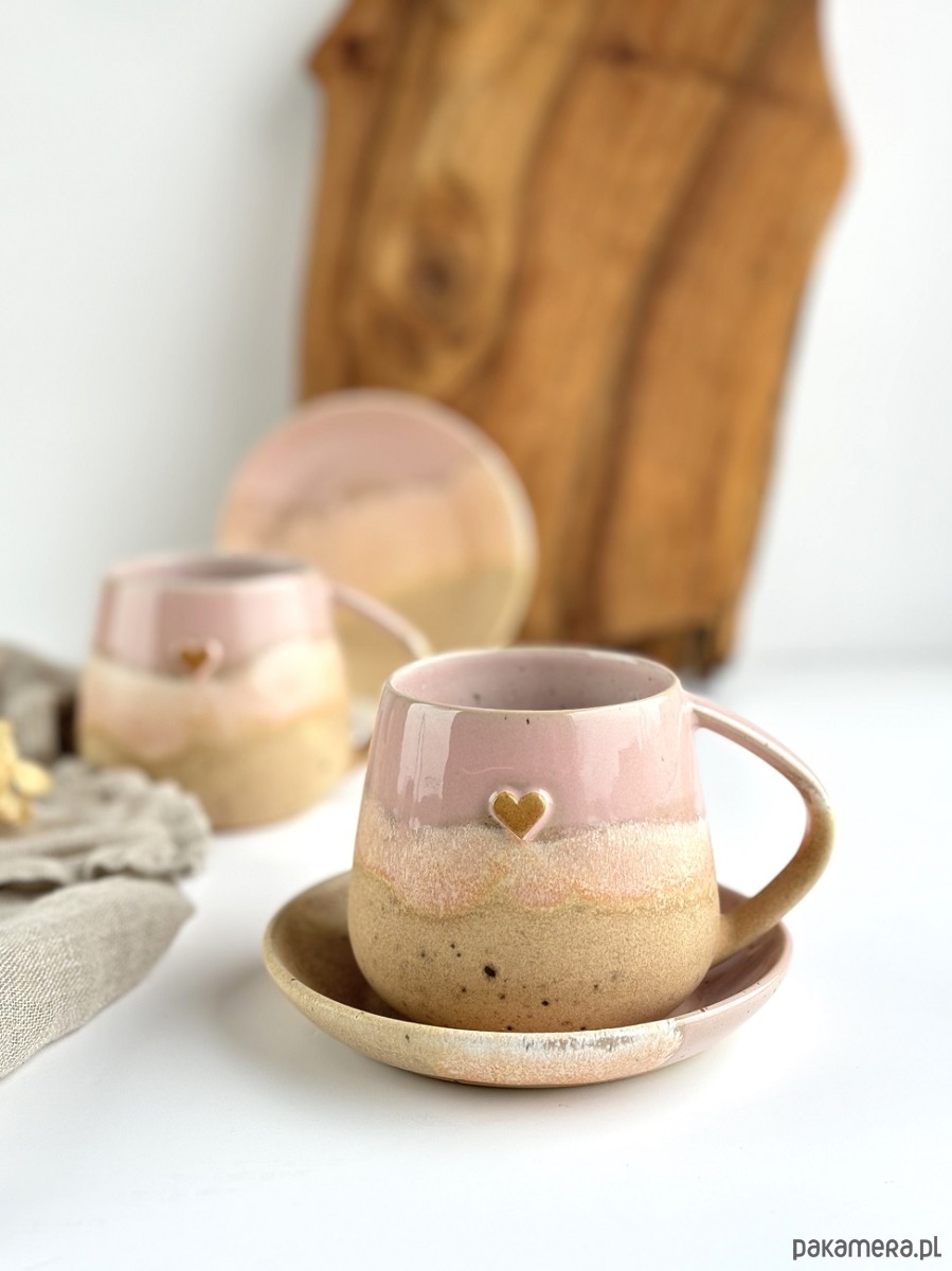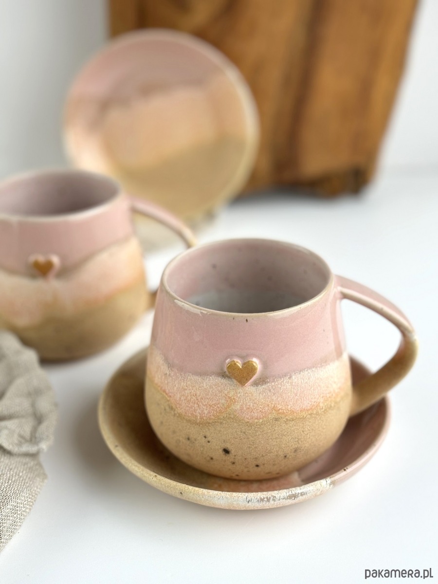 Ręcznie robiony kubek / filiżanka ceramiczna beczułka ze spodeczkiem - Różowe migdały z sercem