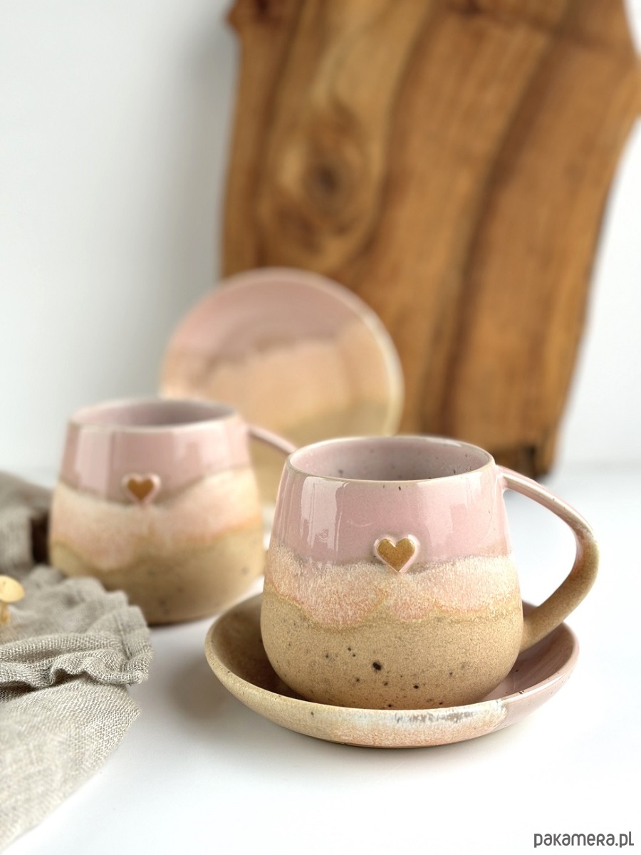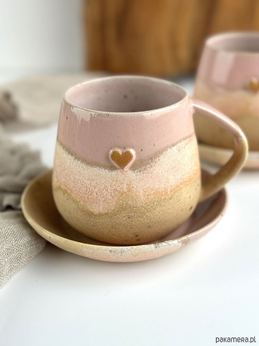 Ręcznie robiony kubek / filiżanka ceramiczna beczułka ze spodeczkiem - Różowe migdały z sercem