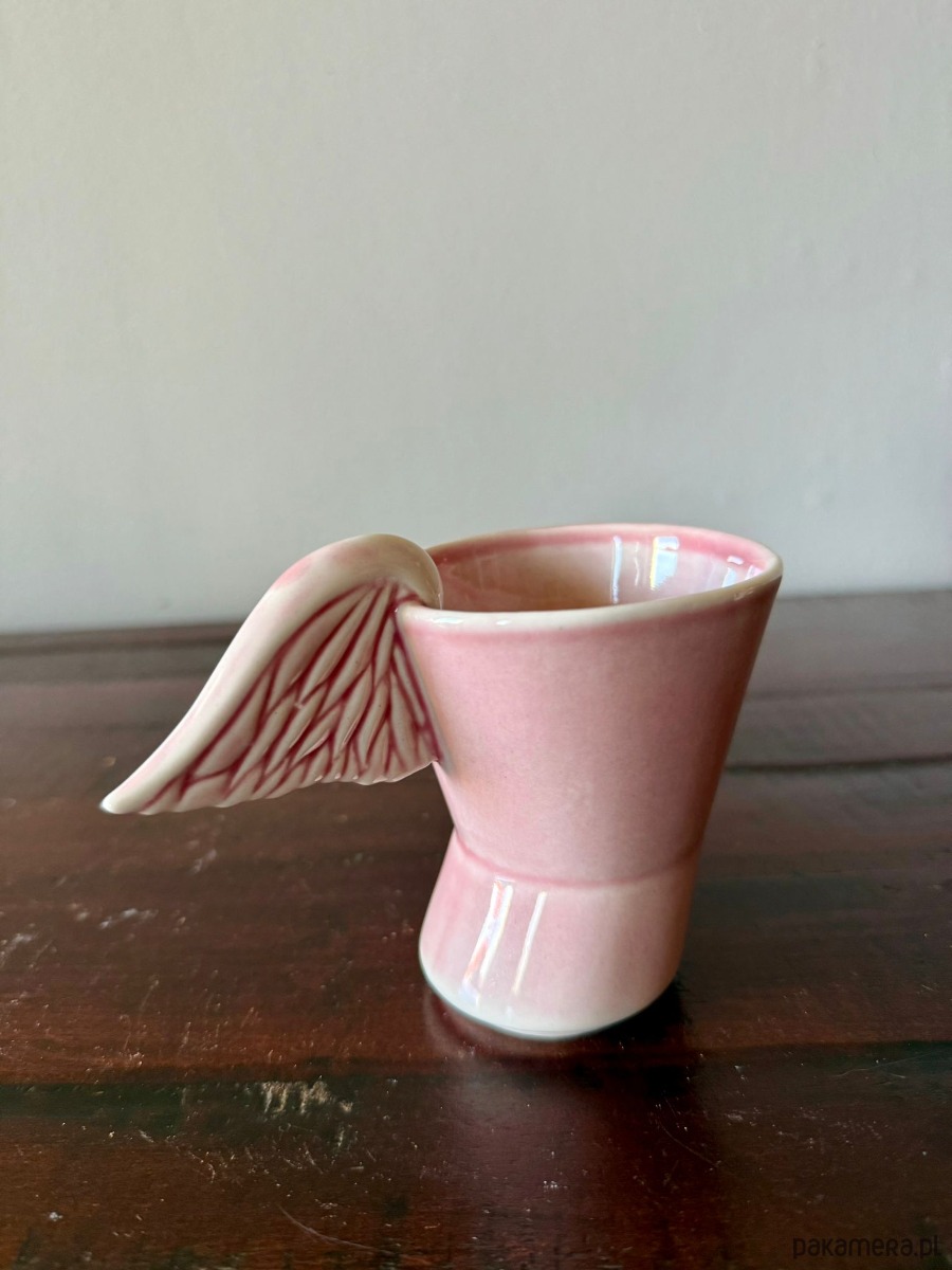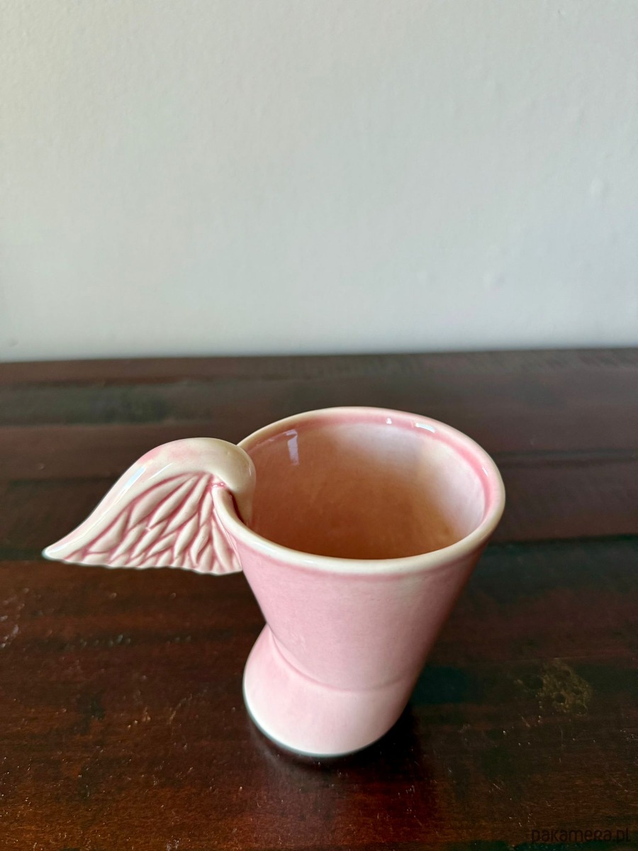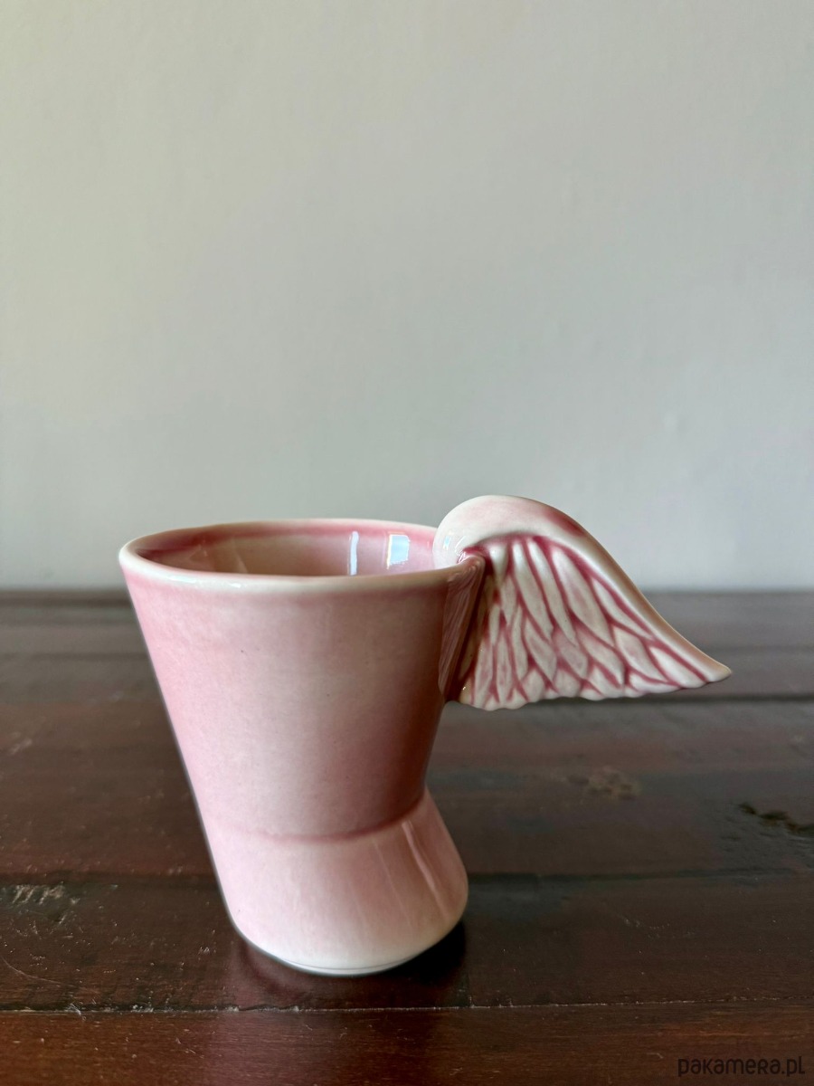 Ręcznie wykonana filiżanka z kolekcji Angel to wyjątkowy element ceramiki artystycznej, który łączy w sobie nowoczesny design i delikatność formy. Pokryta błyszczącym szkliwem w odcieniu subtelnego różu, zachwyca lekkością i elegancją. Uchwyt w kształcie skrzydła anioła nadaje jej niepowtarzalny charakter i sprawia, że każda kawa czy herbata staje się wyjątkowym rytuałem.