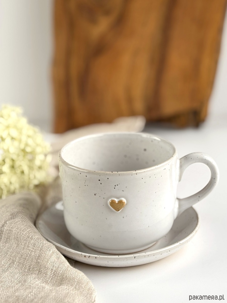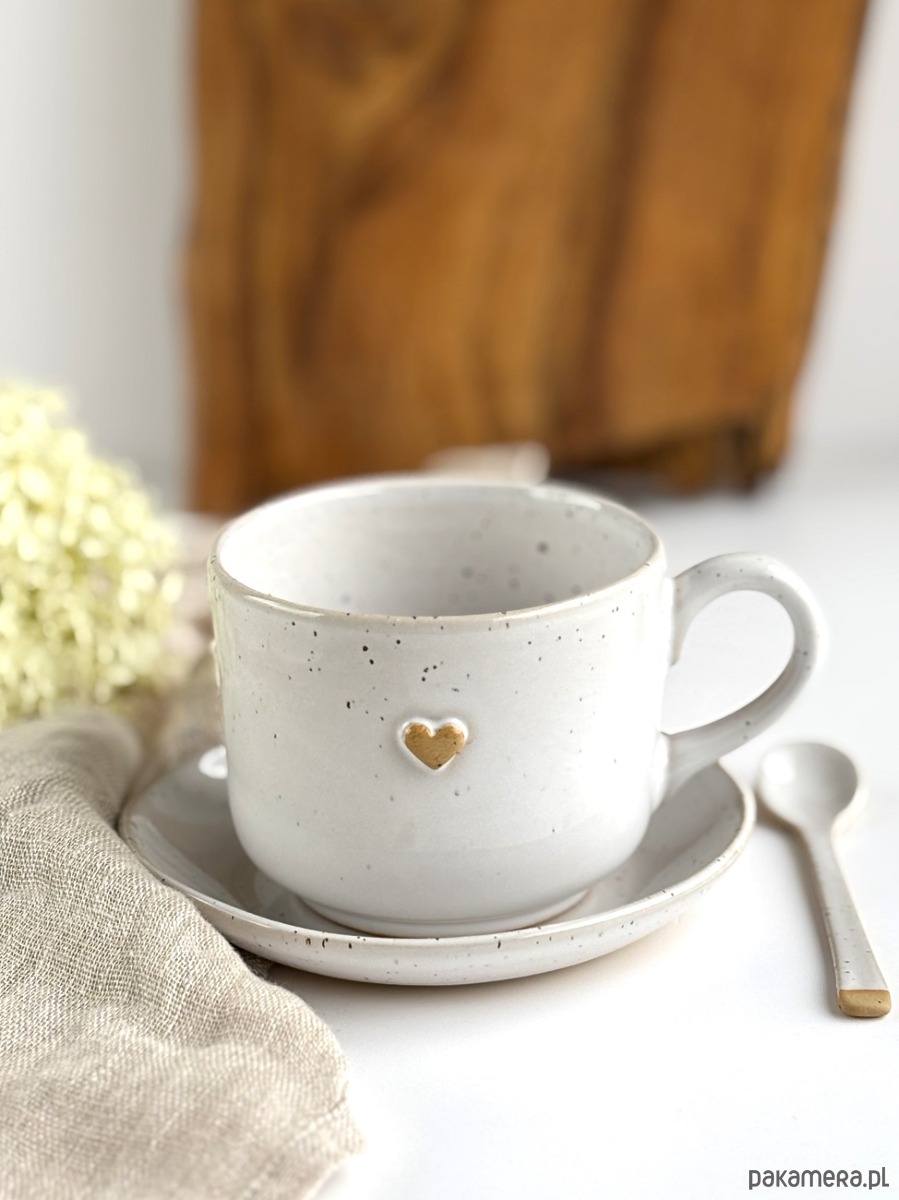 Ręcznie robiona filiżanka ceramiczna ze spodkiem biała w piegi z sercem.